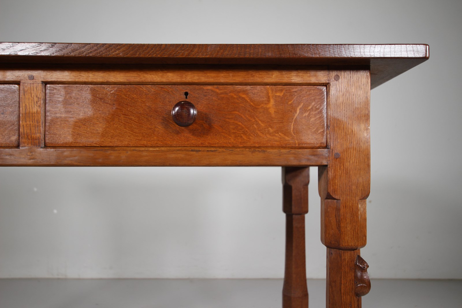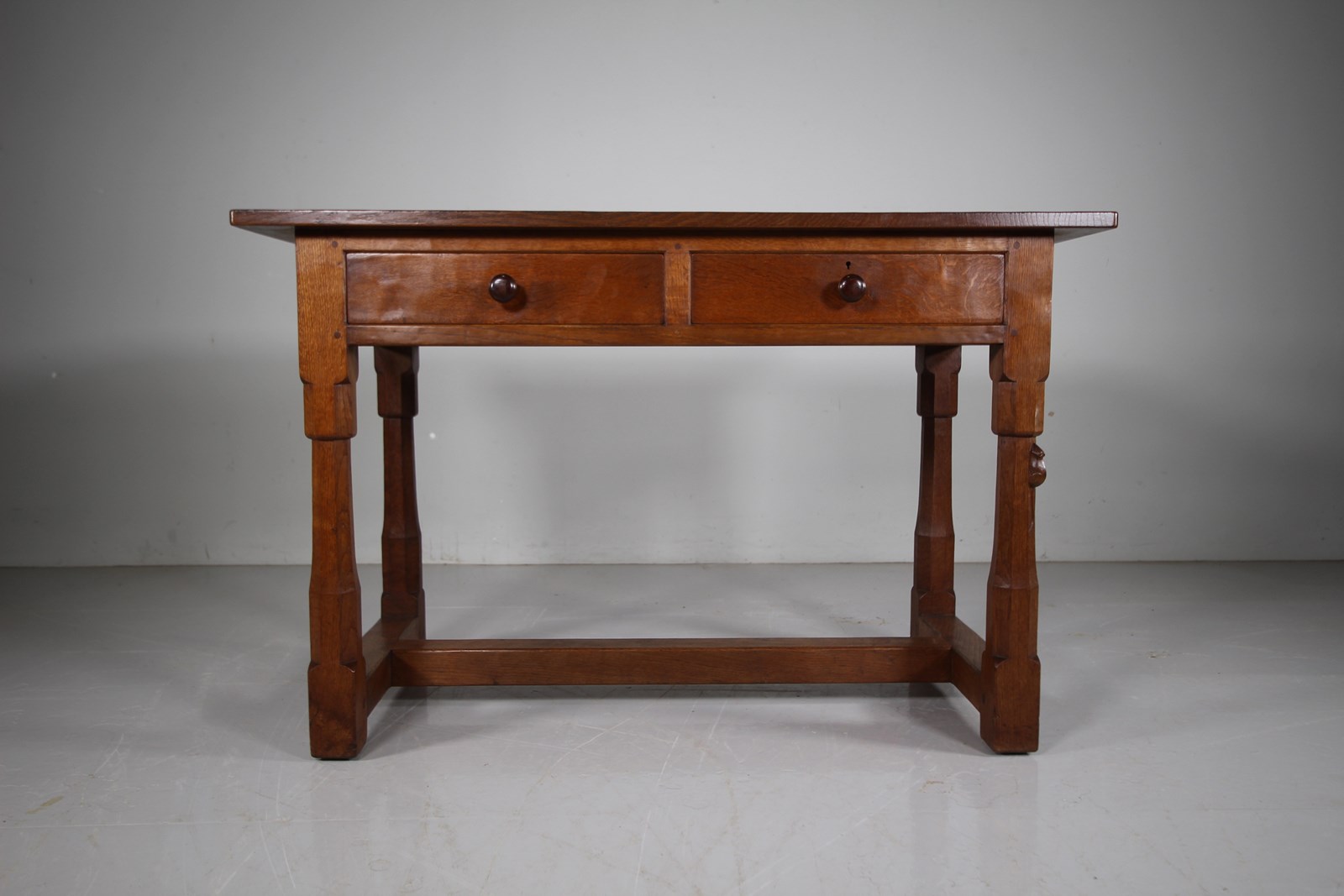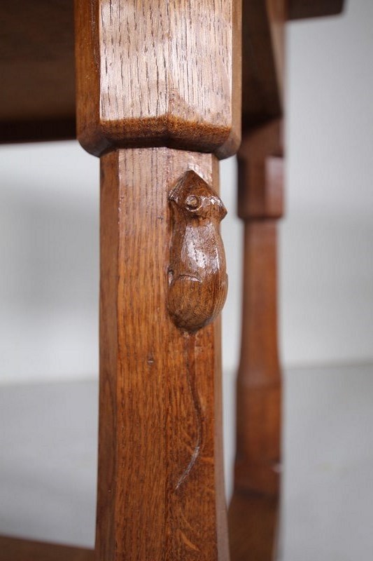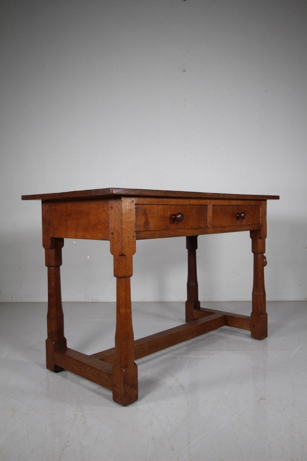 A rare bespoke model of a 1930’s beautiful oak side table or desk by Mouseman. A much chunkier, oversized example over usual proportions, this is a superb piece of early Mouseman furniture, made in solid oak with a thick adzed oak table top on four strong legs with a central connecting stretcher. To one leg is a very large and plump carved signature mouse. A useful piece that would work well as a Mosueman desk as it has two drawers to the front, both are clean, run smoothly and they each have the original turned oak handle. Every surface is adzed. Equally would work well as a Mousmean side table. All a fantastic original rich colour and in superb condition. Dates to the thirties.