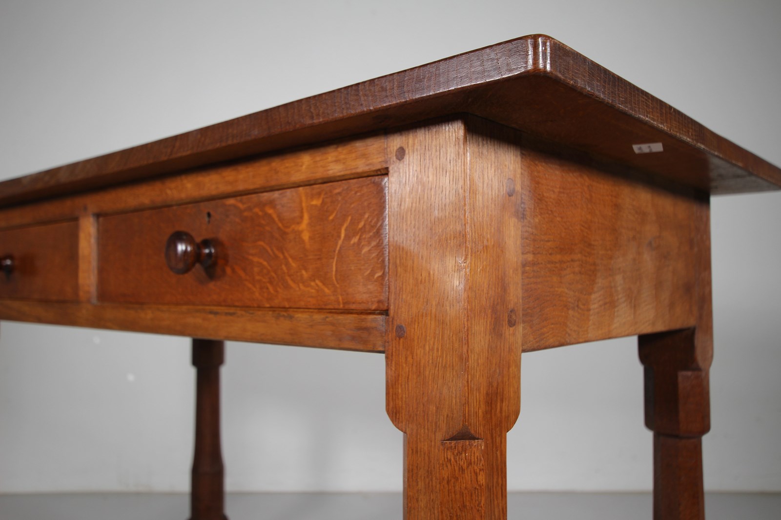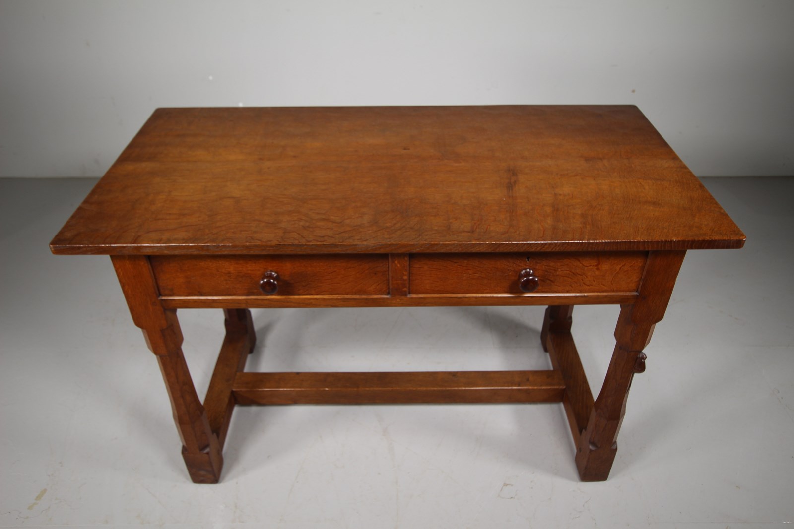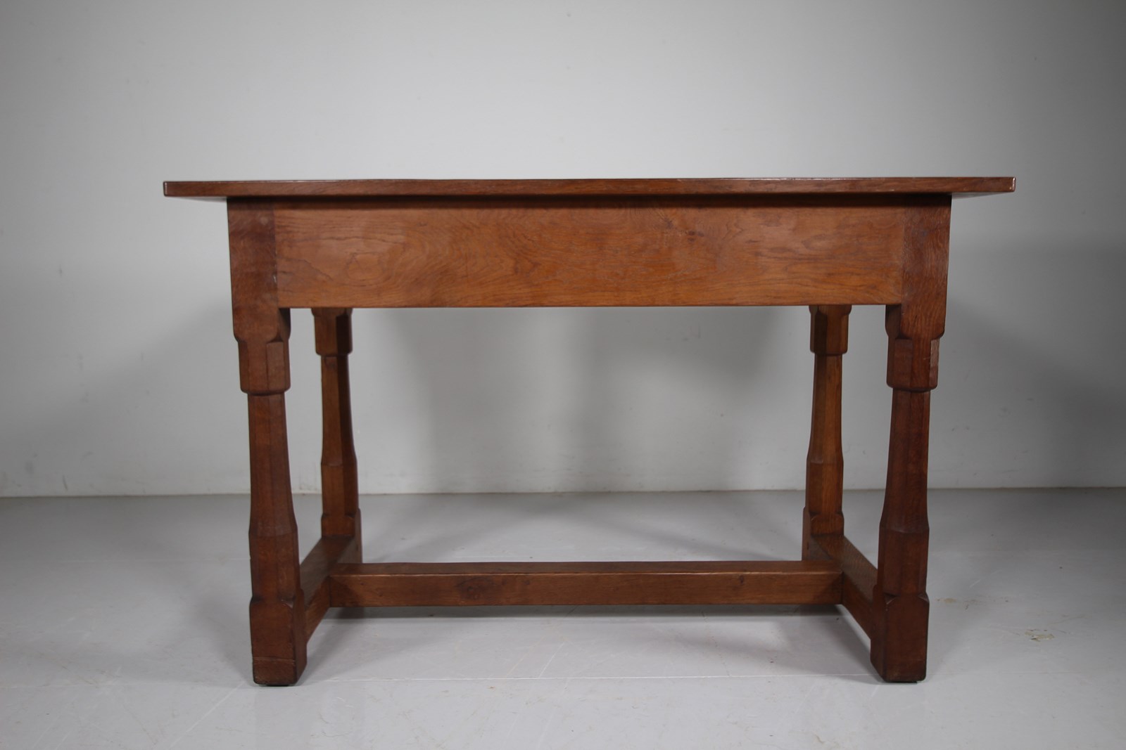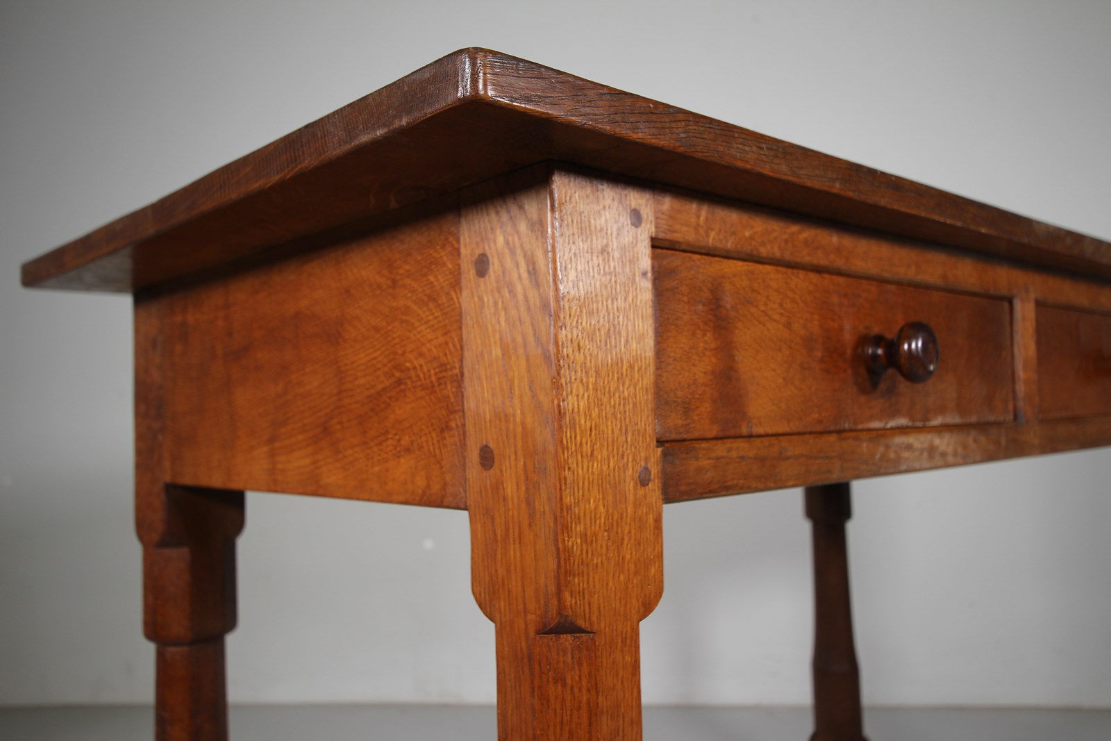 A rare bespoke model of a 1930’s beautiful oak side table or desk by Mouseman. A much chunkier, oversized example over usual proportions, this is a superb piece of early Mouseman furniture, made in solid oak with a thick adzed oak table top on four strong legs with a central connecting stretcher. To one leg is a very large and plump carved signature mouse. A useful piece that would work well as a Mosueman desk as it has two drawers to the front, both are clean, run smoothly and they each have the original turned oak handle. Every surface is adzed. Equally would work well as a Mousmean side table. All a fantastic original rich colour and in superb condition. Dates to the thirties.