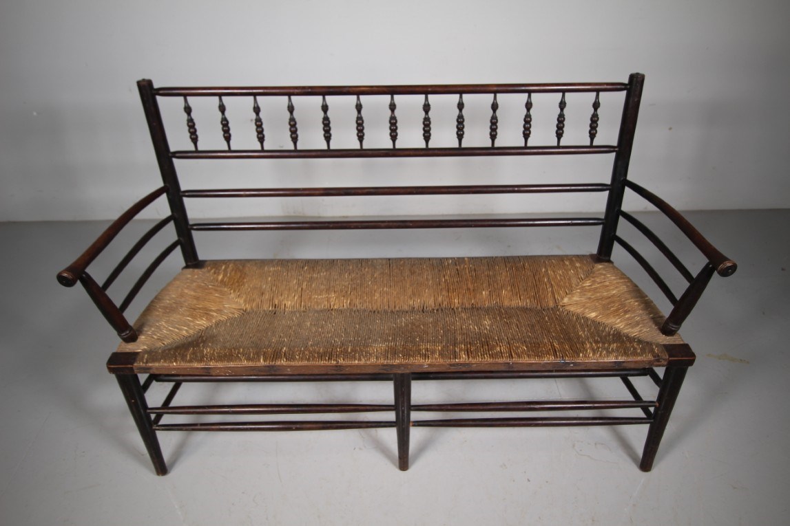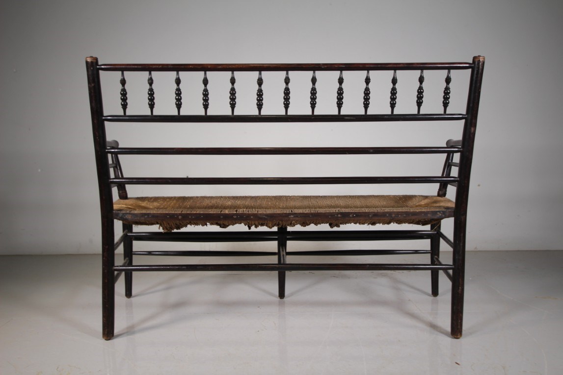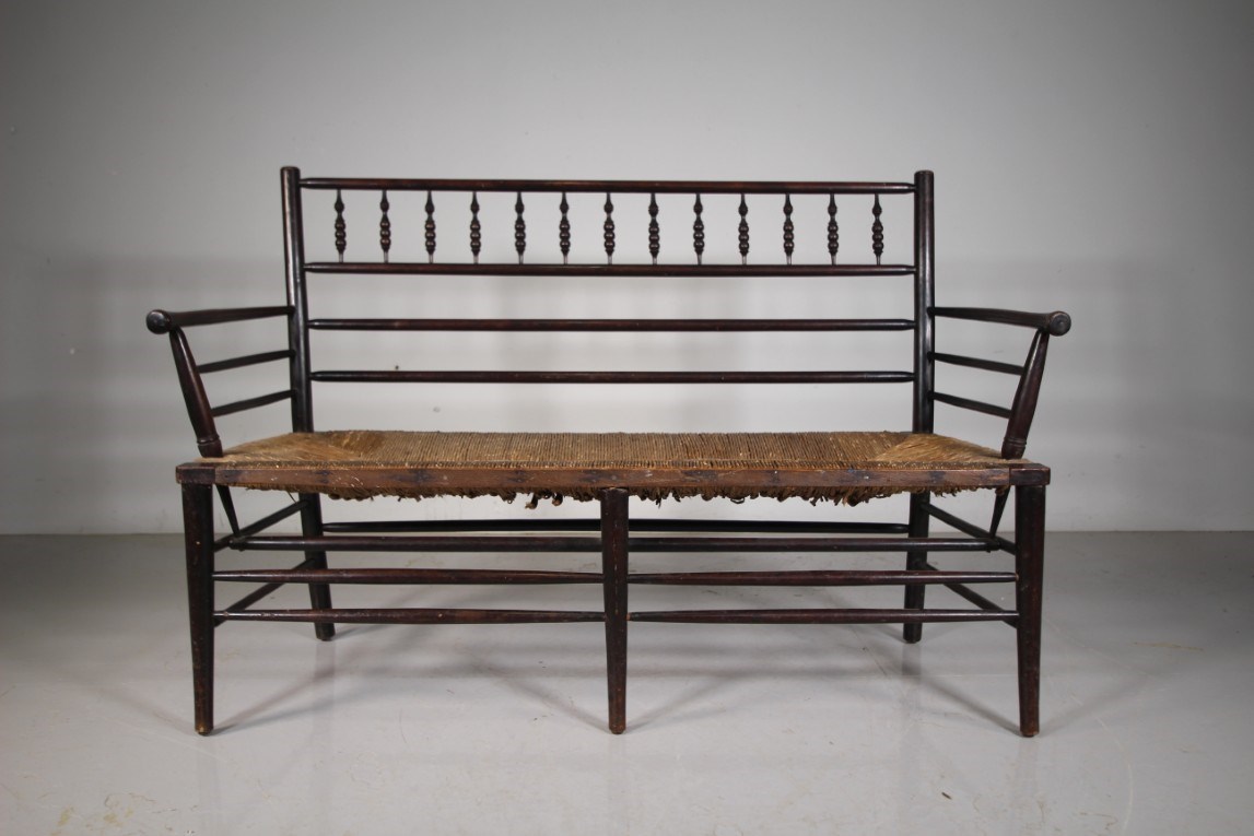This is a very original, true antique William Morris Sussex bench seat that is a much rarer model with it being a three seater seat. In excellent, clean condition, all the ebonised finish is correct and untouched. The antique Morris Sussex seat has a wonderful, original traditional rushed long seat. A beautiful William Morris antique Sussex seat that stands well, looks very smart and is in superb, strong condition with no damage. The seat height is 45cm. English and dating from around 1870. A very rare model.