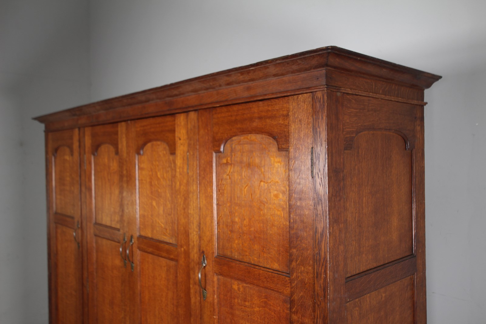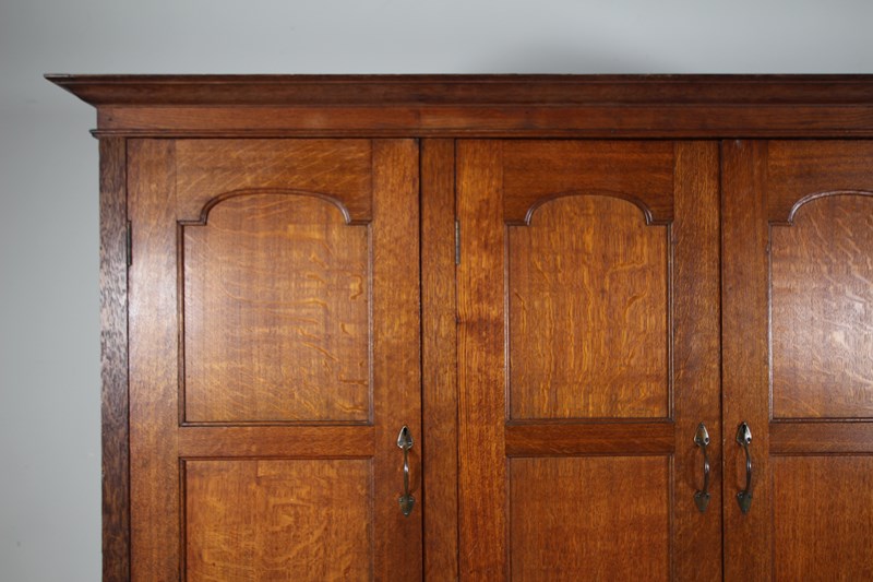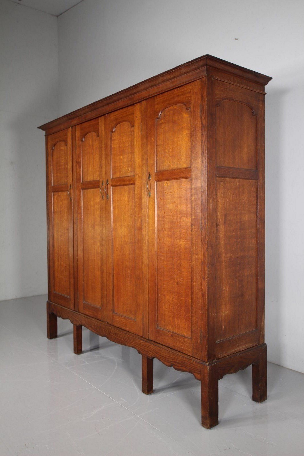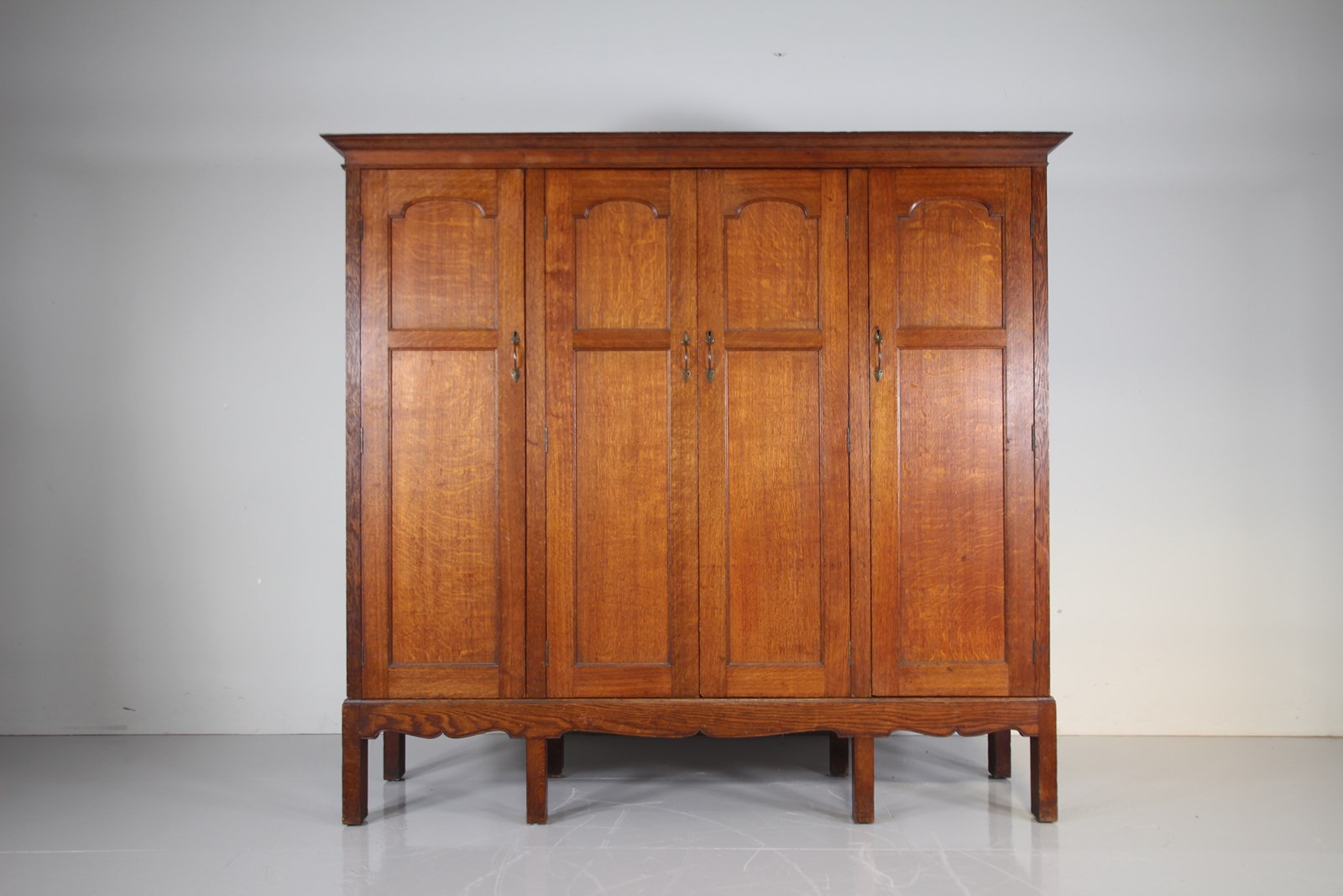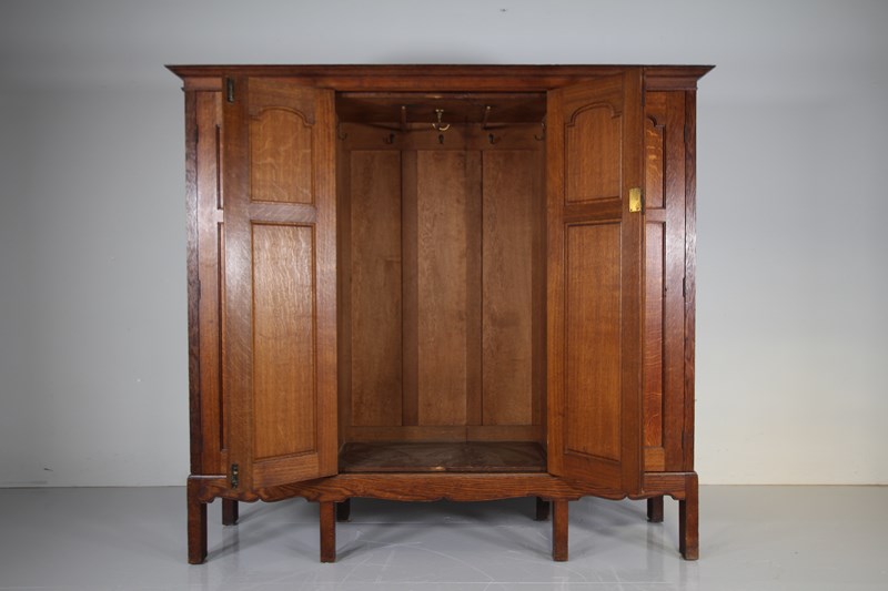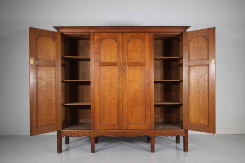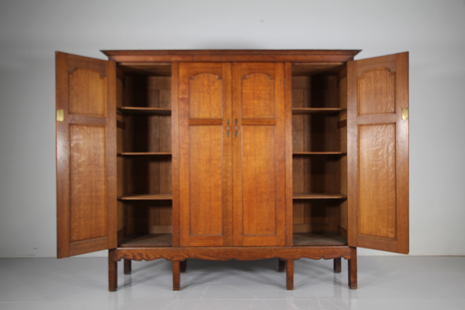 A beautifully handmade, top quality solid oak antique cupboard, a very rare example of a piece of large Arthur Simpson furniture that dates to around 1900. In such amazing condition, designed to be used as a hanging cupboard for a hallway or bedroom, but shelved out, this would make a stunning rare English Arts & Crafts antique kitchen cupboard. Made entirely in solid oak which is a fabulous, original colour, this Arthur Simpson cupboard has four well panelled doors with all the original brass handles present. Behind two of the doors are the original oak shelves and being the two central doors are internal original oak hanging hooks and simple hanging rails. Stands beautifully on tall square legs with a shaped apron along the front and sides. At the top, the flared cornice can lift off. In superb, clean and original condition throughout, a special and rare antique oak cupboard by an English Arts & Crafts designer, Arthur Simpson, The Handicrafts Workshop of Kendal.