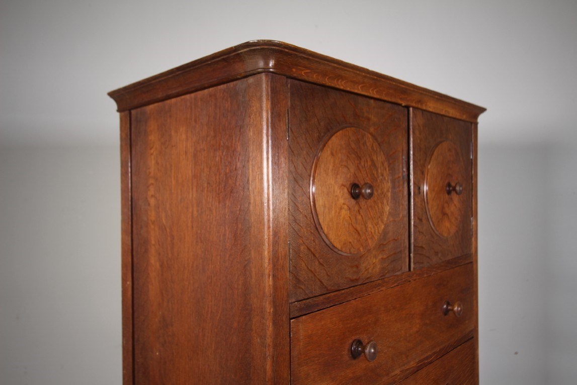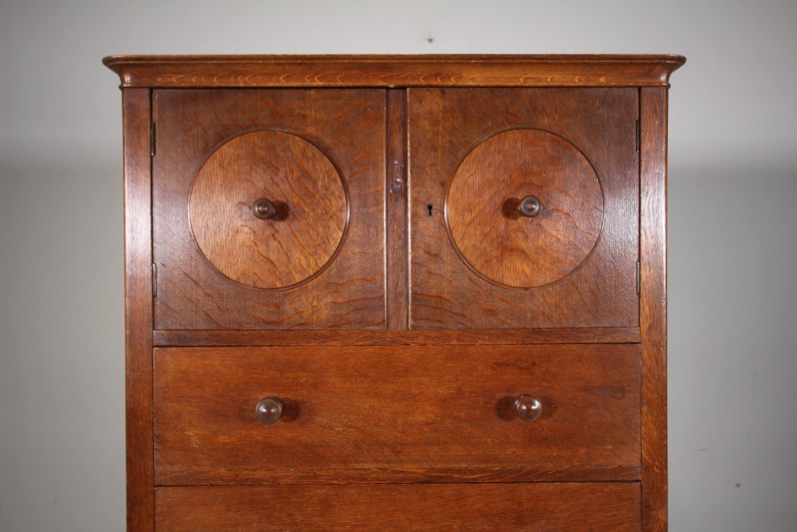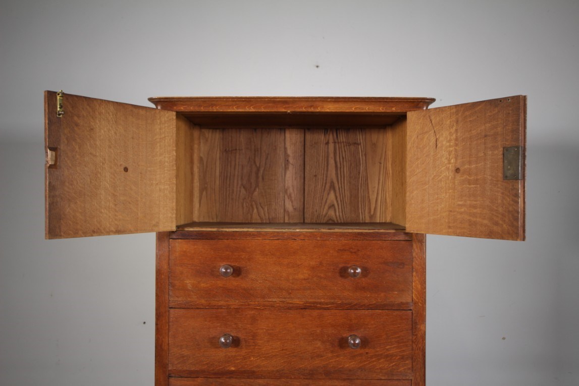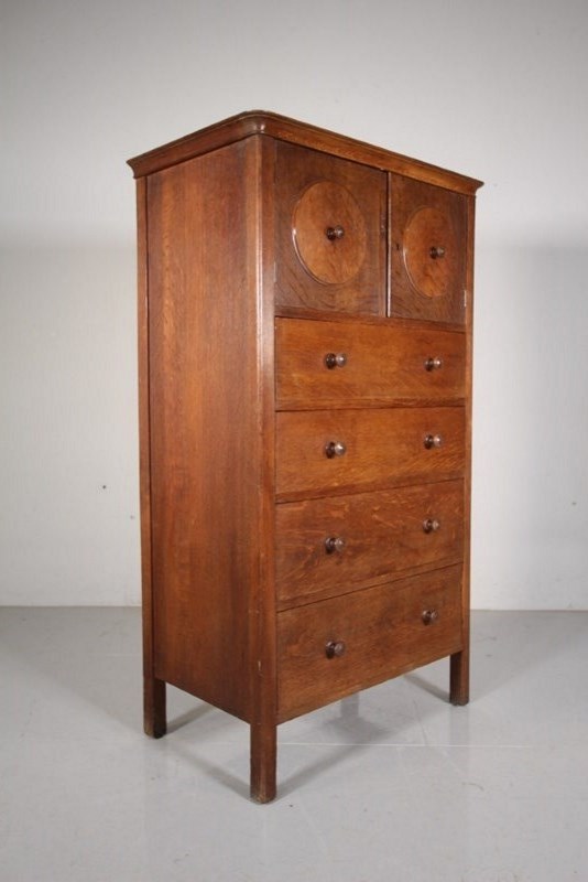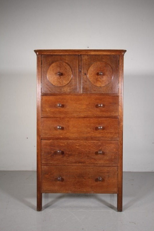 Rare Early Heals of London Antique Solid Oak Owl Cabinet A superb high quality, Edwardian oak very rare antique owl cabinet / tallboy by Heals of London around 1900. A very scarce model and this one is in such fabulous, original condition. Featuring two Owl cupboard doors to the top with the round owl applied panels, beneath are four, long and graduating drawers, all four run smoothly and have the original handles. To the top of this rare Heals Owl cabinet is a lovely moulded cornice with rounded corners. It stands on square legs and is a beautiful, original rich even colour. A very rare early piece of Heals of London furniture. DimensionsHeight: 140cm (55.56")Width: 80cm (31.75")Depth: 47.5cm (18.85")