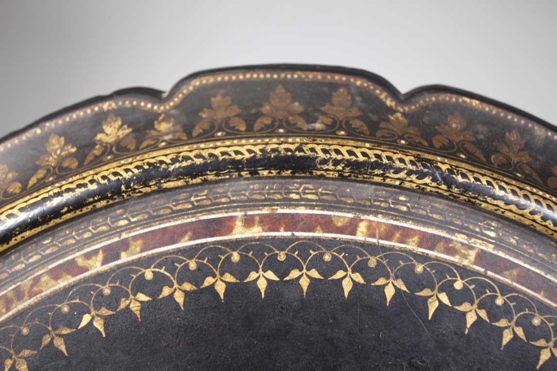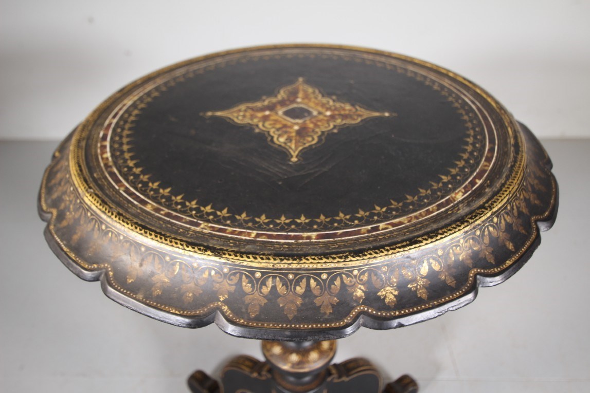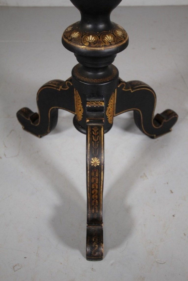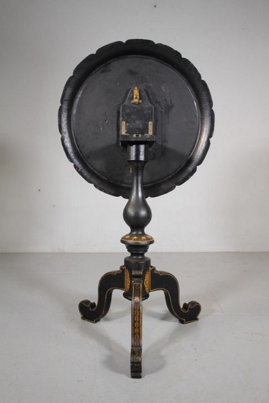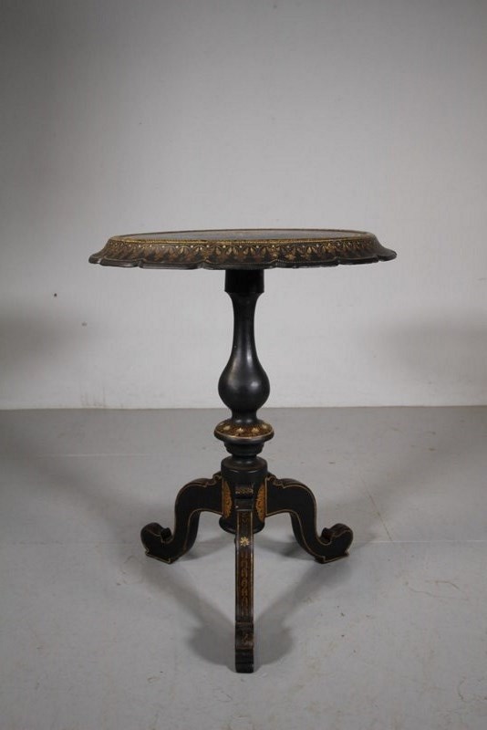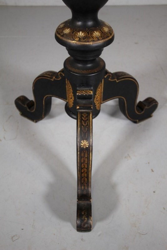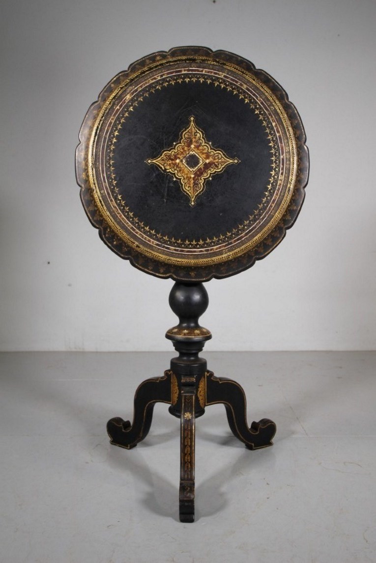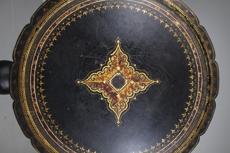 A very beautiful, English 19th century antique tripod table, in remarkable condition, a rare survivor made in papier mache. The shaped table top is hand decorated with fine faux tortoiseshell and gilt works. Folds well with the original brass tilt mechanism and catch. Stands on a lacquered turned stem with three tripod cabriole legs. In superb condition, a lovely antique high quality country house piece.