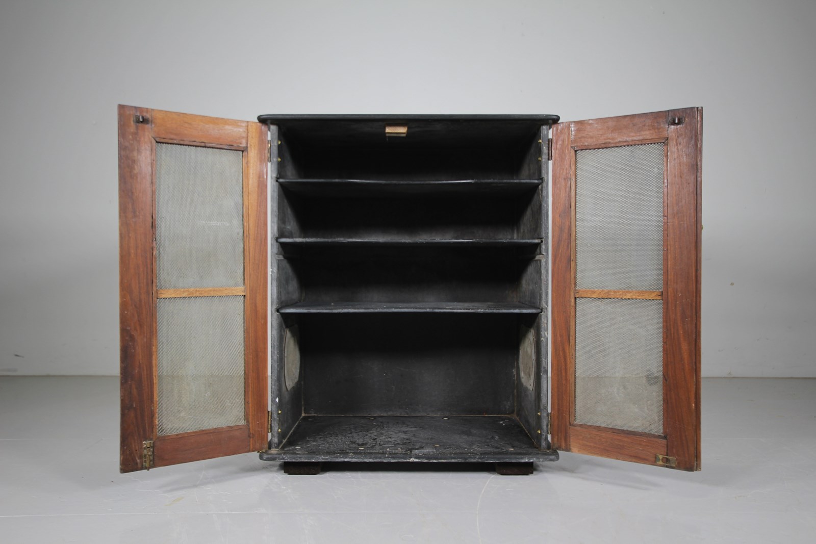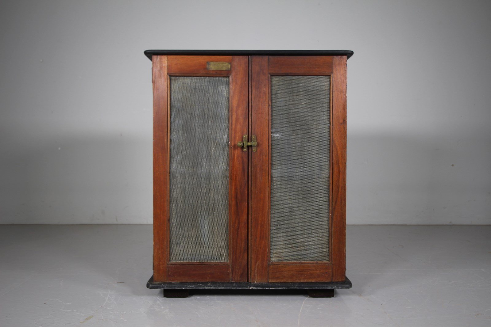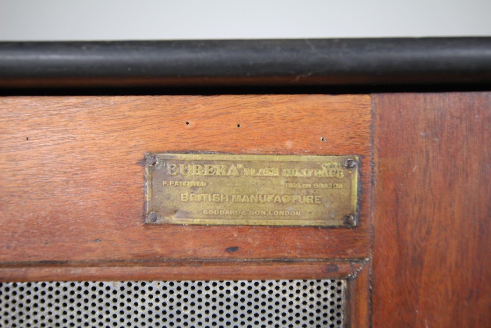 A beautifully made English English 19th century large antique slate food cupboard, made and labelled by Goddard & Sons, London. Made in slate with walnut and meshed doors, inside are three slide out adjustable in height slate shelves and with vented apertures on both sides. In excellent, clean, complete and original condition. The large brass makers plaque is one one door, saying Eureka Slate and Meat Safe, patented. Designed originally to keep food stuffs cool, could be used as a normal cupboard, sound system cupboard, TV cupboard or for food again, if you don’t have a pantry. Dates to around 1880, complete with all the original metal ware.