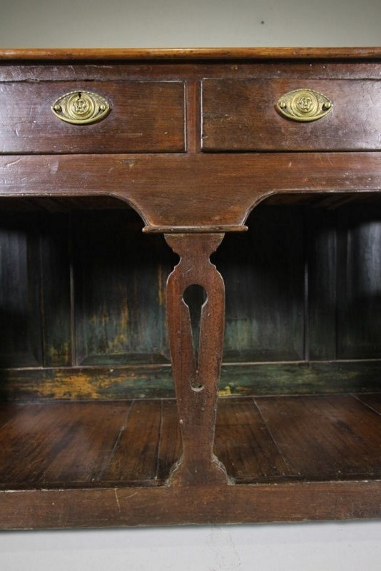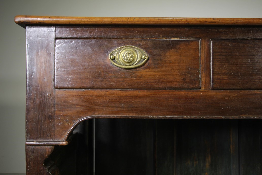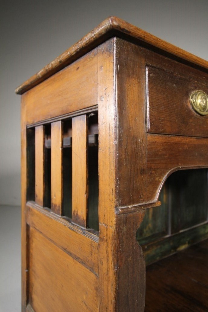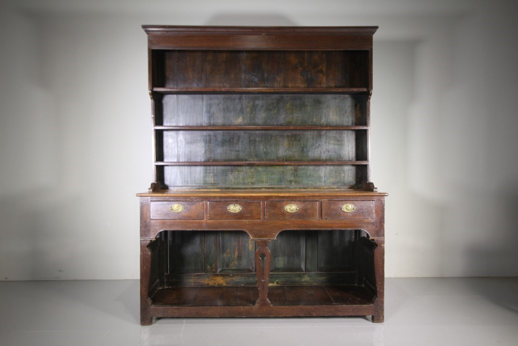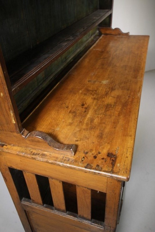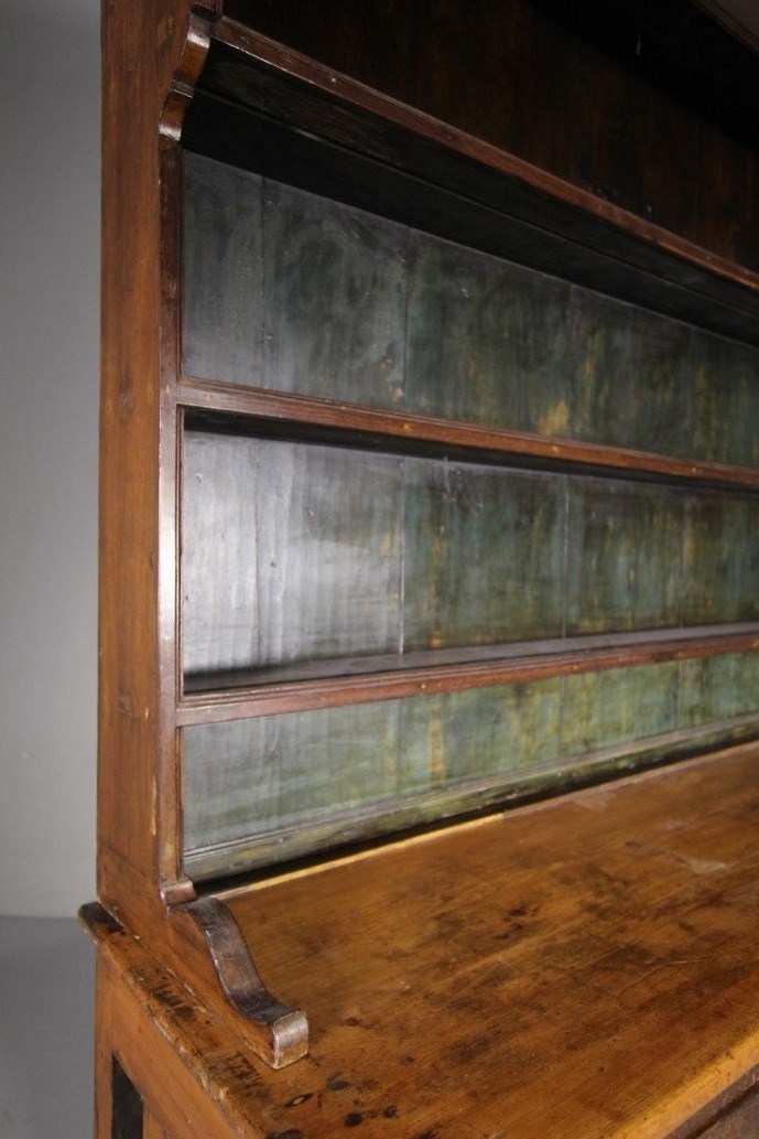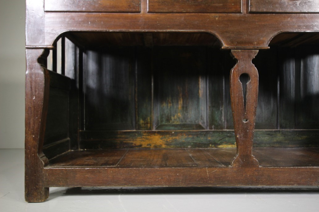 This is a wonderful rare example of a very original 18th century antique Welsh dresser from the Tregaron area in Mid Wales. Beautifully made in pine, still in the original finish and green paint. The fabulous potboard dresser base does have the original rack too, but if that isn’t used, the rack leaves no trace on the potboard dresser top. The open potboard dresser base has silhouette legs with the central leg having a pierced design. Very unusual to have the slatted and panelled sides to the base, this is to allow air flow to the base to keep earthenware food crocks cool. Above are four drawers, all have the original brassware handles. In superb intact condition, dates to around 1770. Still in the original finish with original painted pine green back panels. A very original example and amor unusual model from Tregaron in the foothills of the Cambrian Mountains. The height to the potboard dresser base top is 89cm.