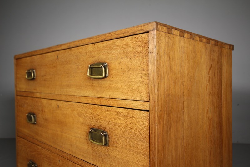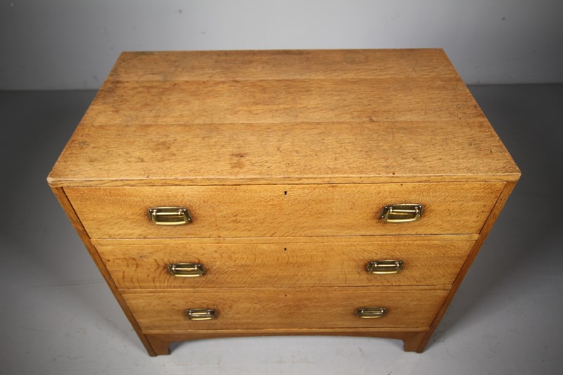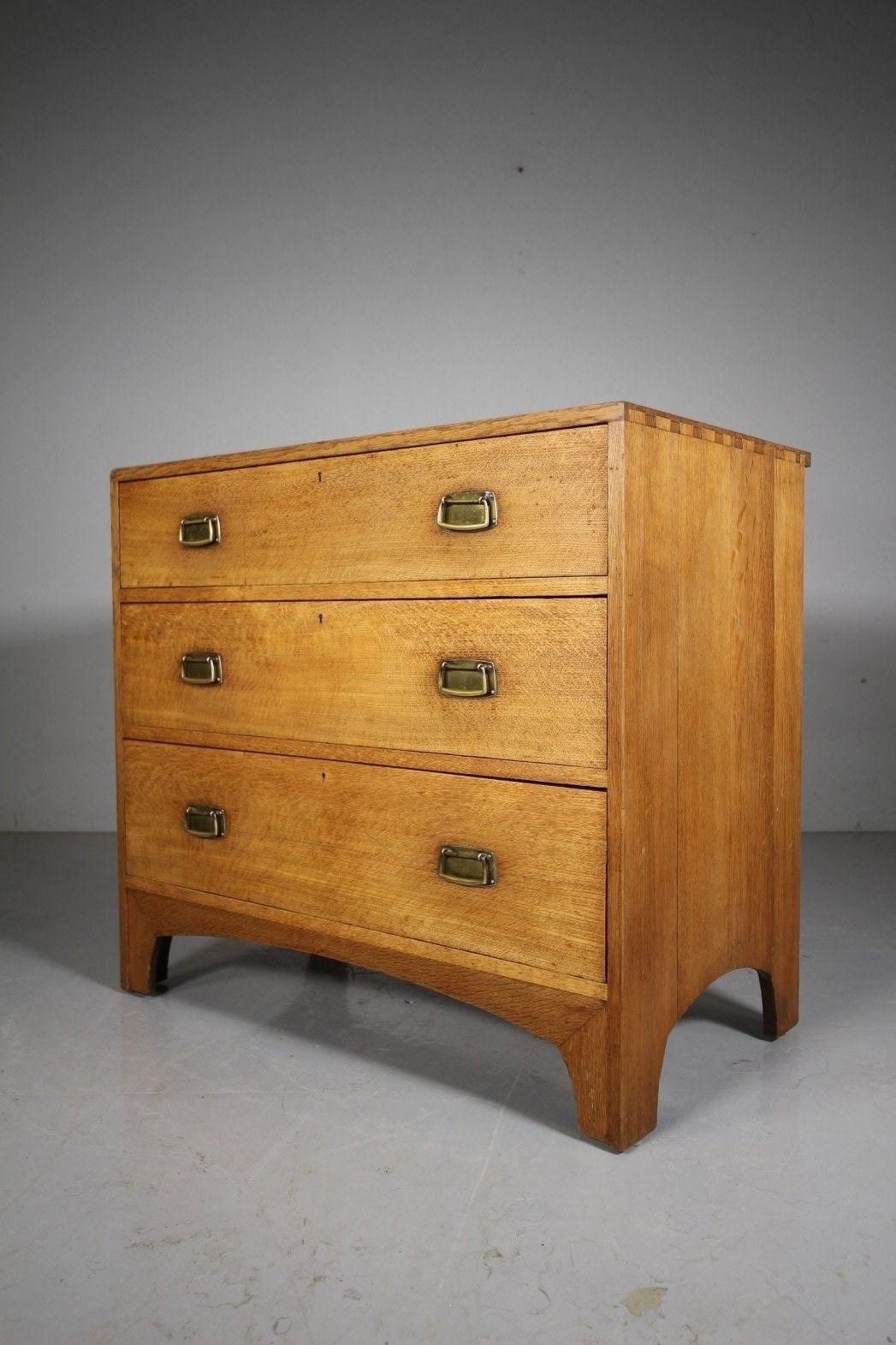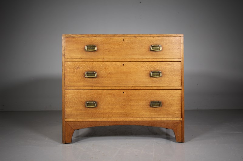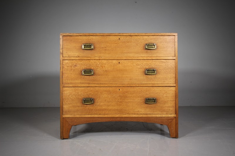 An early Heals of London antique oak chest of drawers that dates to 1910, only a handful of this model where ever made. Beautifully made in solid oak which is a lovely even colour. The three long and graduating drawers all run smoothly and have the original brass handles. Featuring exposed dovetail decorations to the sides and standing on arched bracket feet to the front and sides. In excellent original condition throughout, a lovely piece of early, rare model Heals antique furniture.