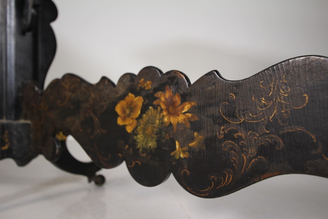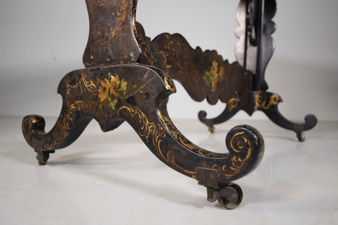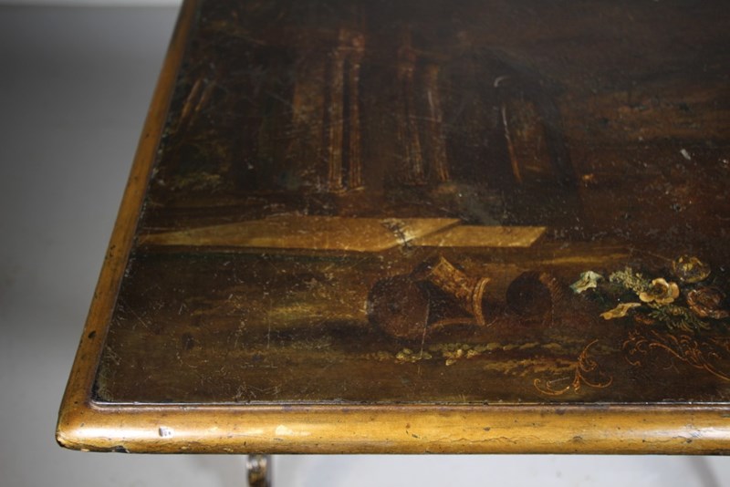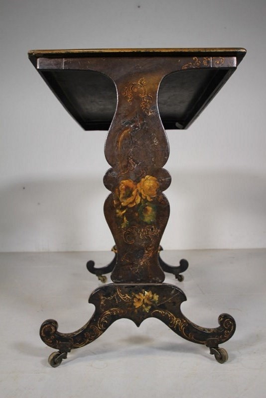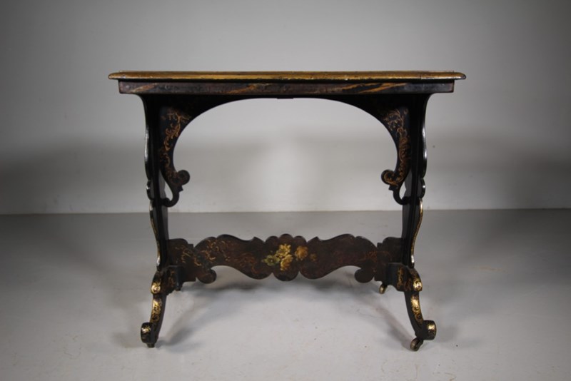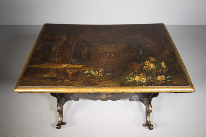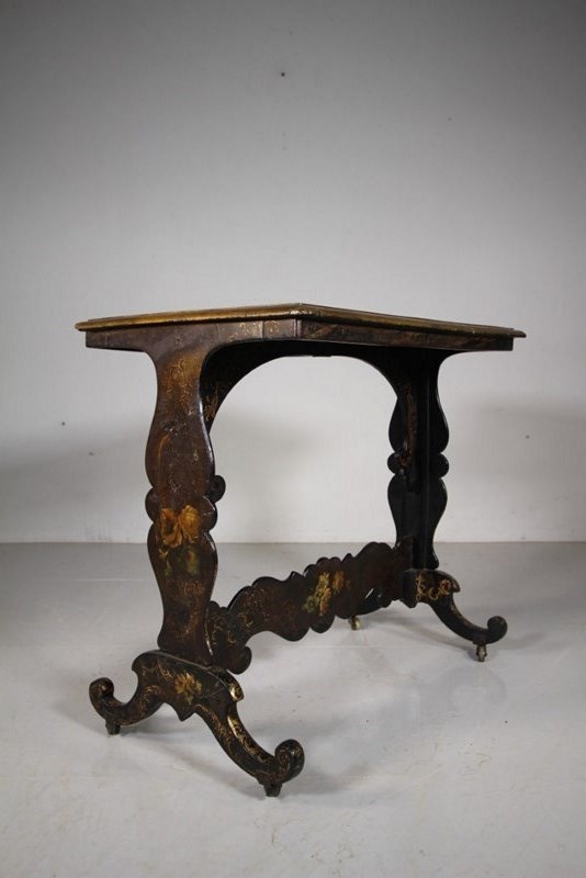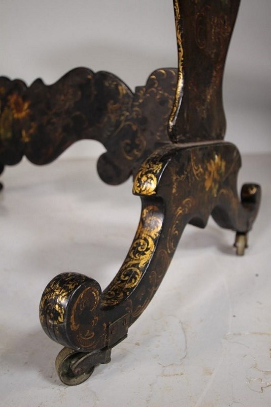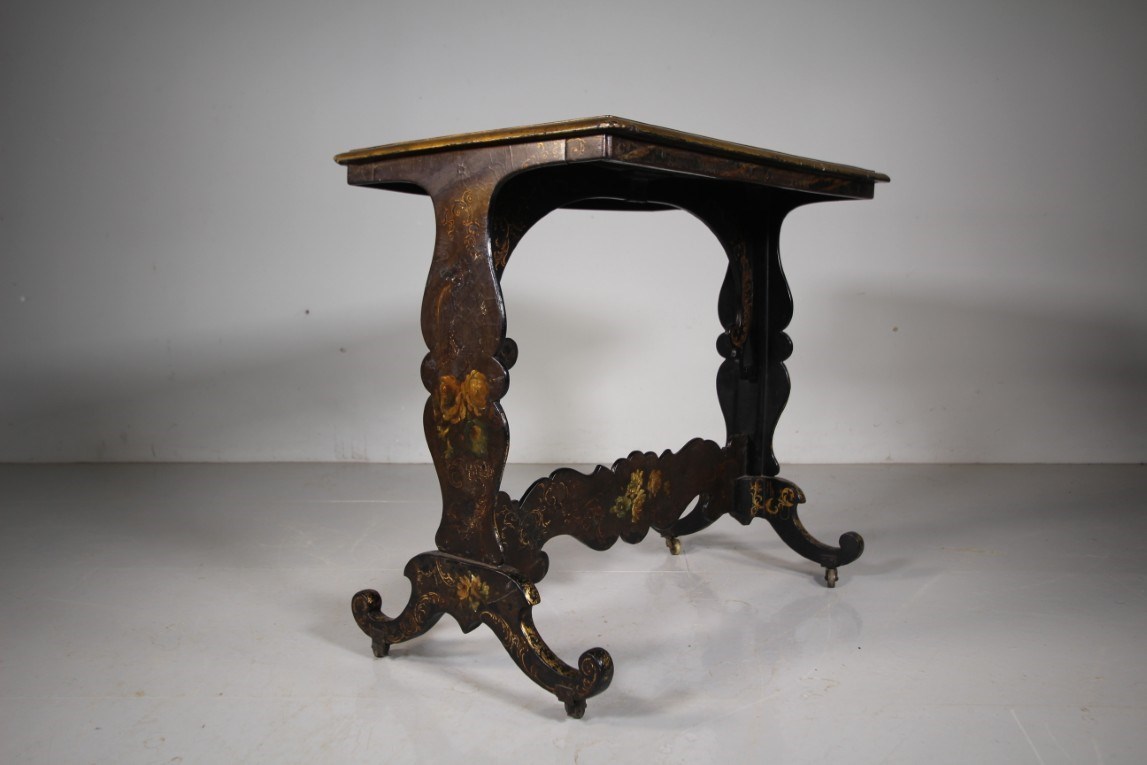 This is a beautiful early 19th century antique decorative country house side table, a very rare survivor, made entirely in papier mache and then hand painted with original scenes, decorations and gilt highlight work. Hard to imagine one even attempting to make something like this now. It is a lovely design having shaped legs with a connecting flat stretcher. In superb condition and is complete with the original quality brass castors. A beautiful piece that dates to 1815.