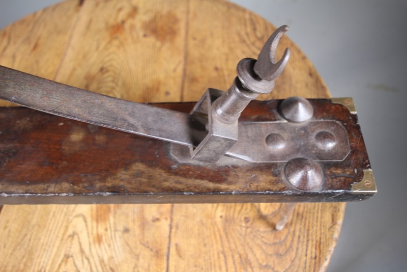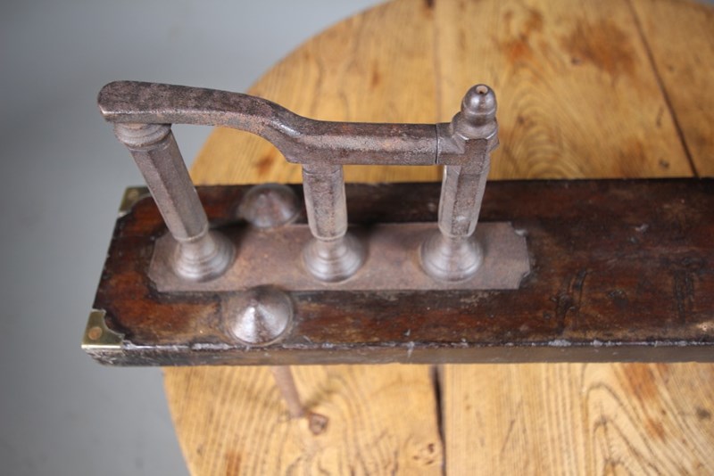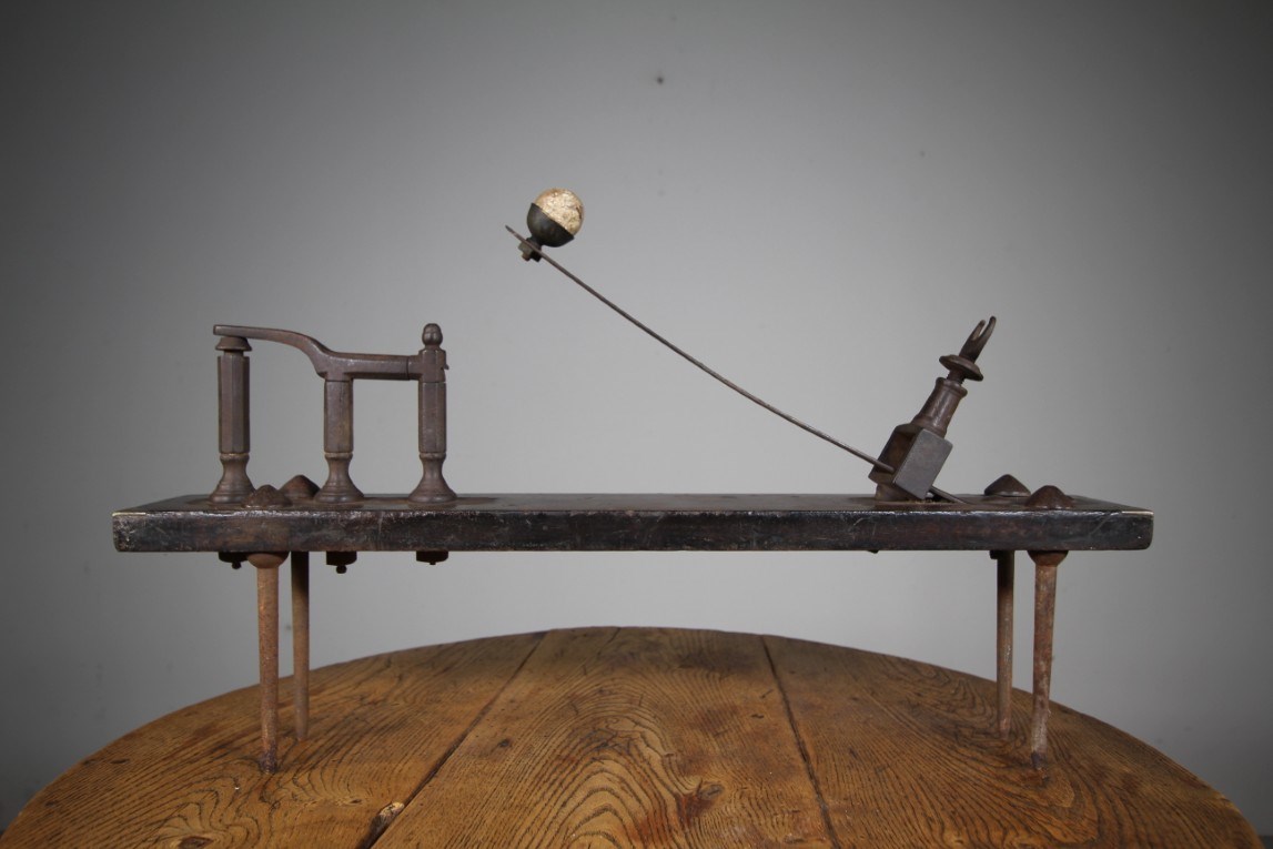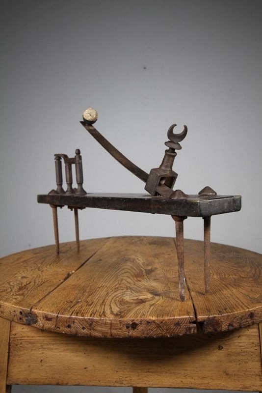 Regency English Antique Knurr & Spell Lawn Game A very good quality, early 19th century antique knurl and spell antique game. The idea is that the mahogany brass bound board has four iron spikes underneath, these are pushed into the ground to stabilise the game. There is a steel spring with a working tension adjuster and also a steel trigger. This is a fabulous, full working example. This game originated from the moors of Yorkshire and was very popular in the 18th and 19th centuries. The Knurr is a small white pottery ball, that is placed upon the spring, ready to be triggered up into the air, and then to be struck with the spell which is a stick of wood. Still totally functional. Dates to around 1820. DimensionsHeight: 38cm (15.08")Width: 10cm (3.97")Depth: 65cm (25.79")