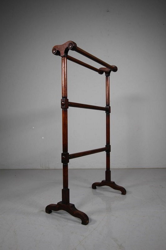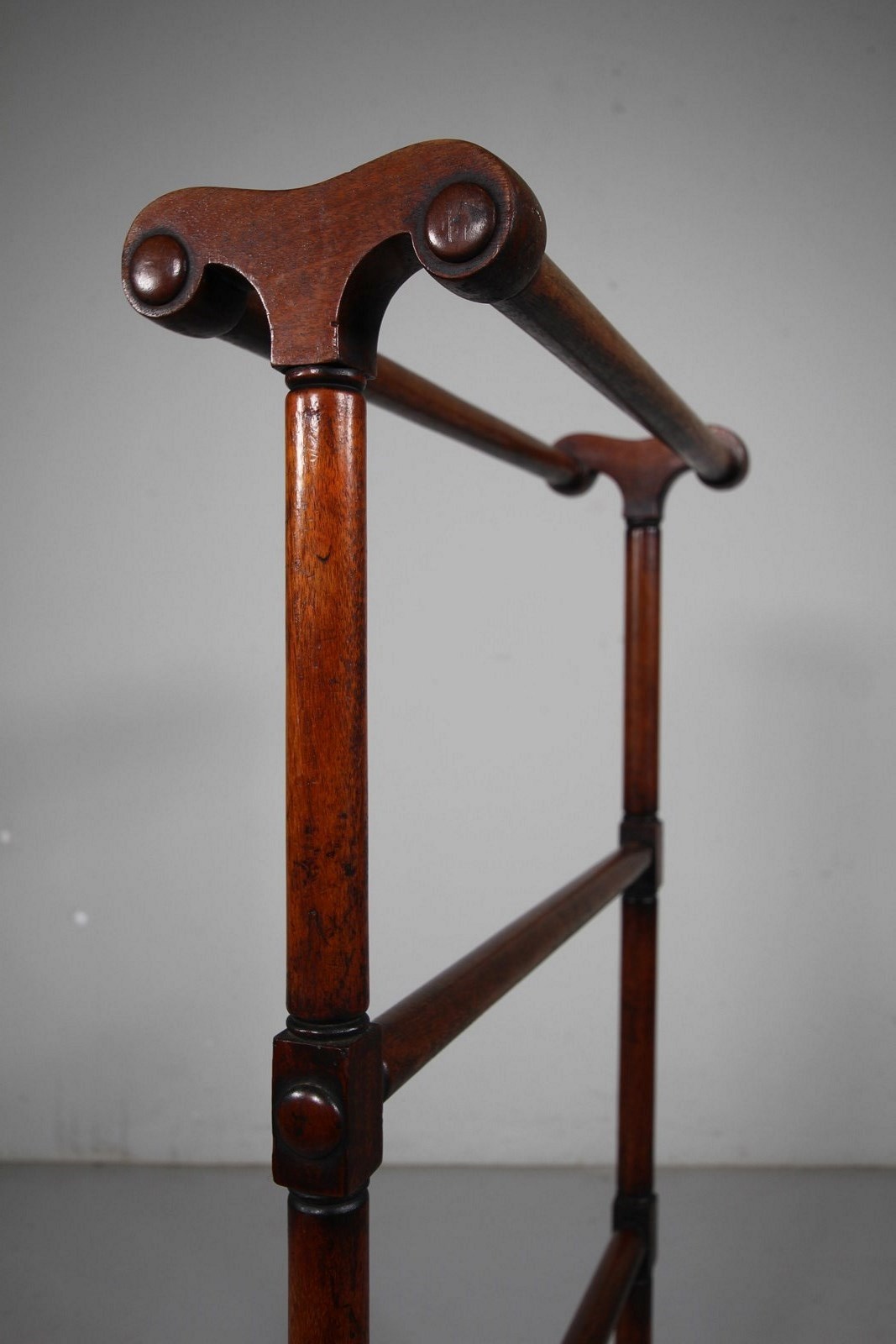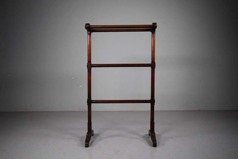 A beautiful quality solid English antique mahogany towel / clothes rail that dates to around 1820. An unusual narrower size, featuring gun barrel turnings with decorative button covers. In excellent condition and a very good colour.
