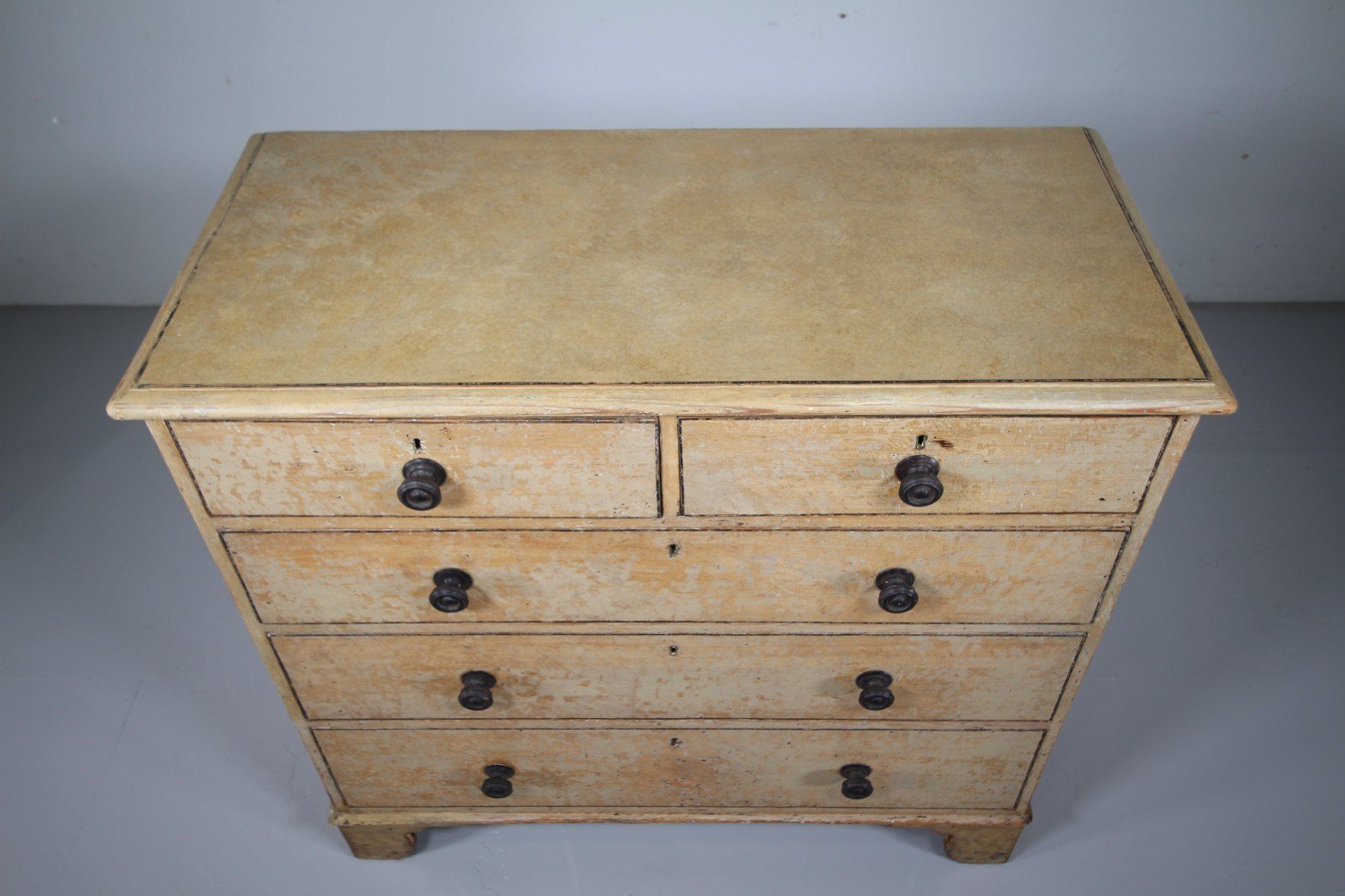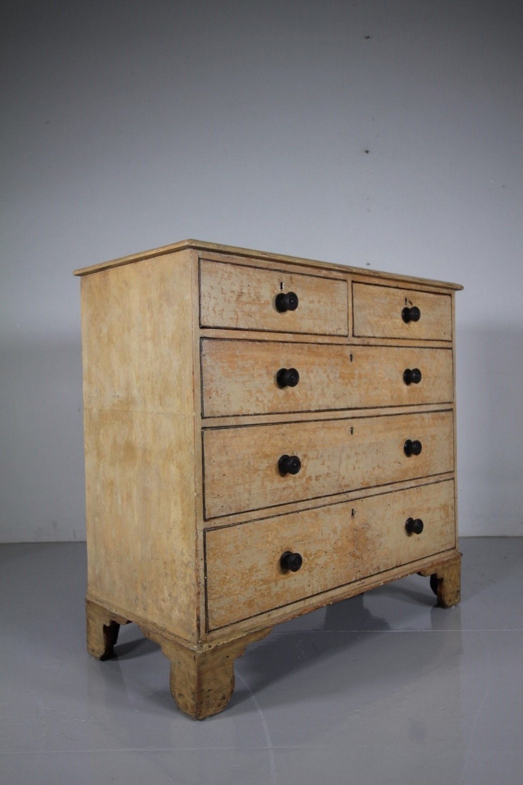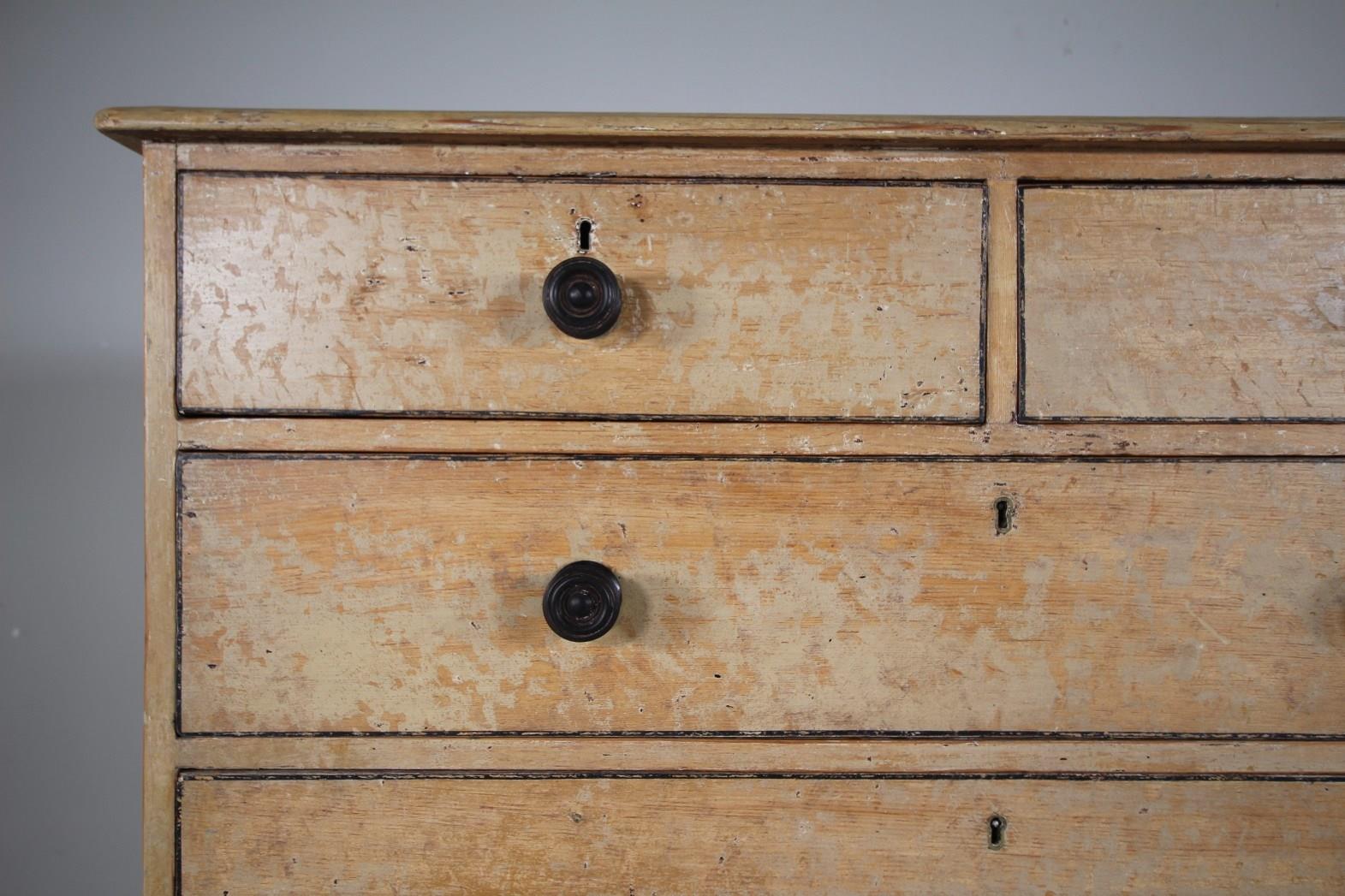 A beautiful English early 19th century original painted pine antique chest of drawers, a larger model on lovely shaped bracket feet and featuring two short drawers over three long and graduating drawers. All have the original ebonised turned handles. Each drawer runs well and has a black hand painted line around them and also to the moulded chest top. In excellent condition, a good piece of Regency original painted pine bedroom furniture that dates to 1815.