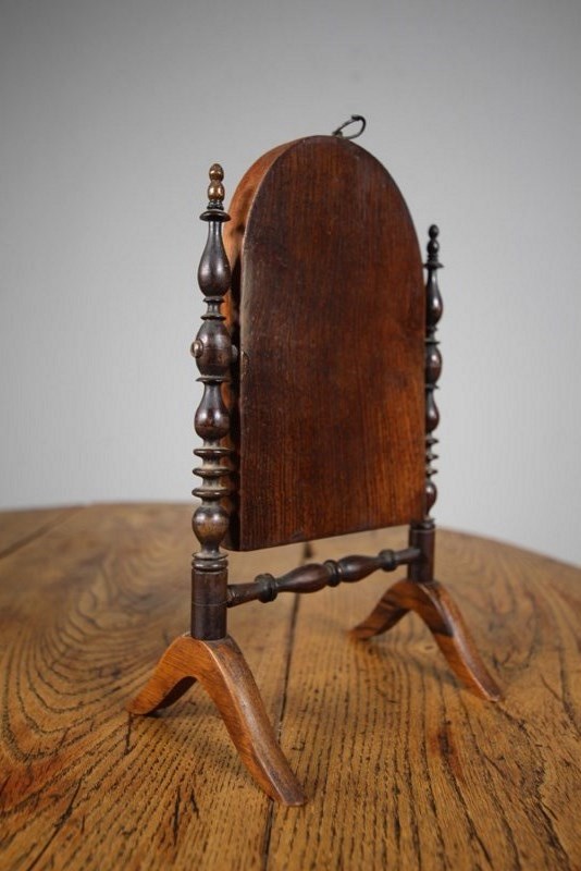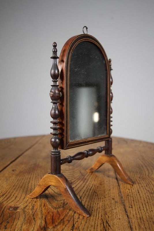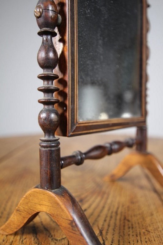 A beautiful English early 19th century antique mirror, a lovely design, made to fold to travel flat in transit. Very good quality, made in rosewood with box wood string inlays. In excellent condition, complete with the original mercury mirror plate. Can also be wall hung with the hanging hook. English and dating to 1815.