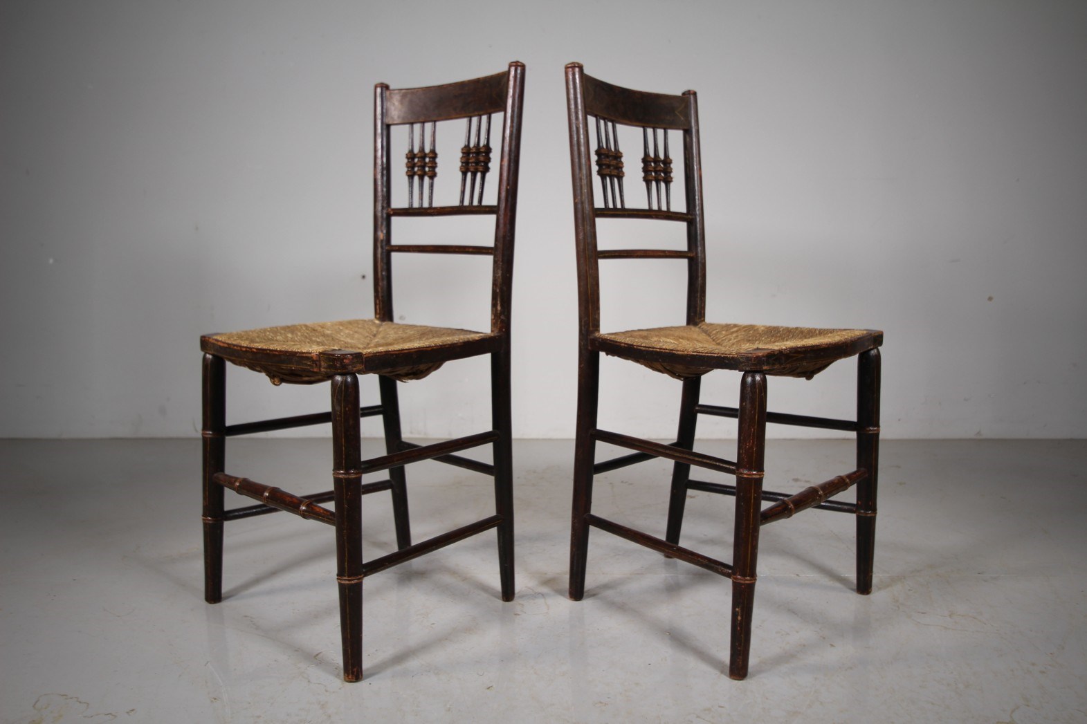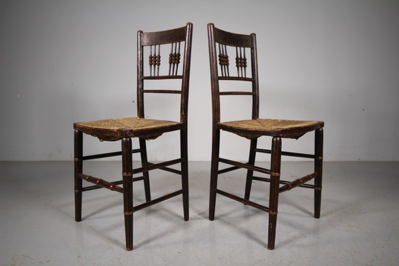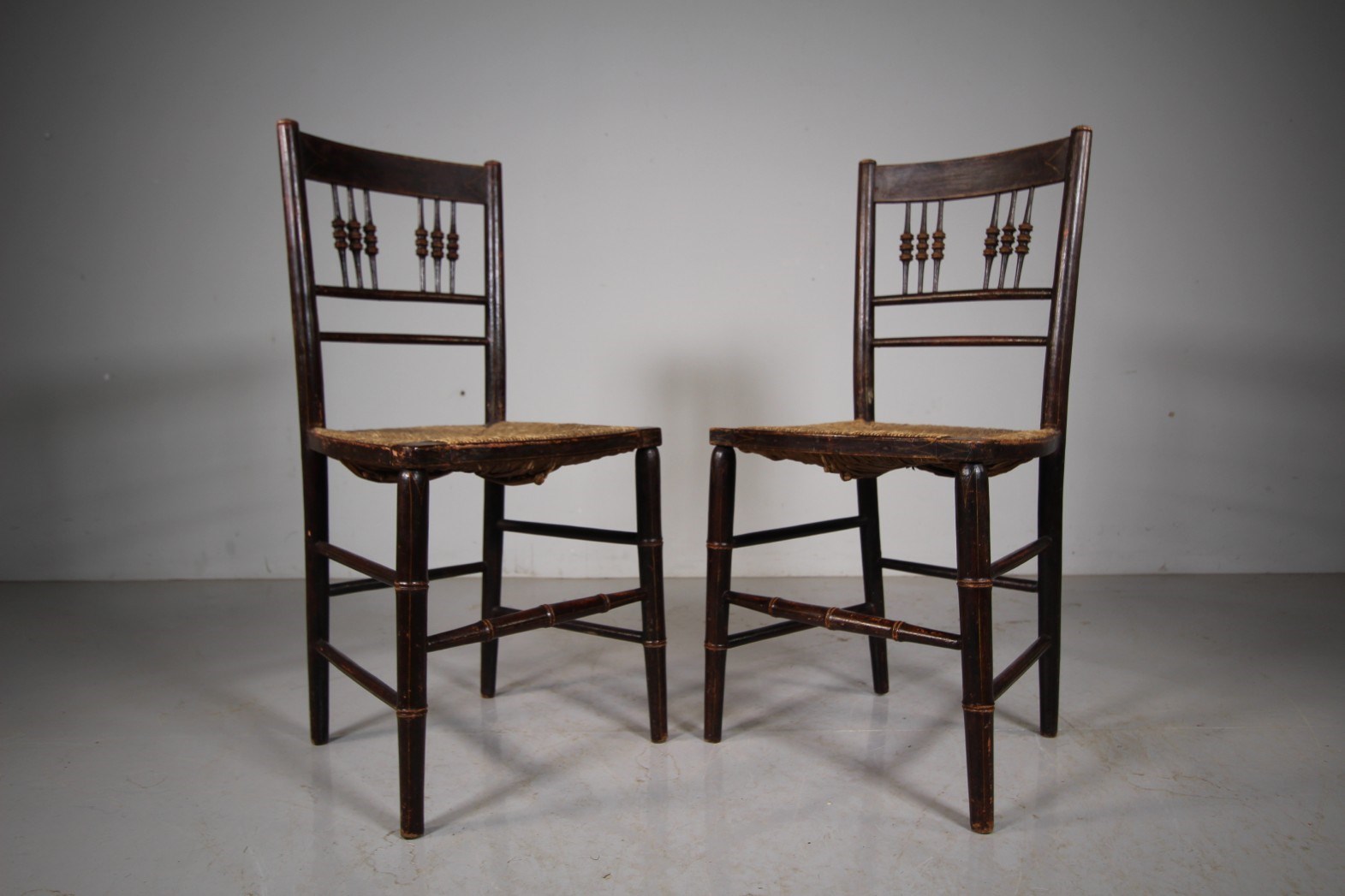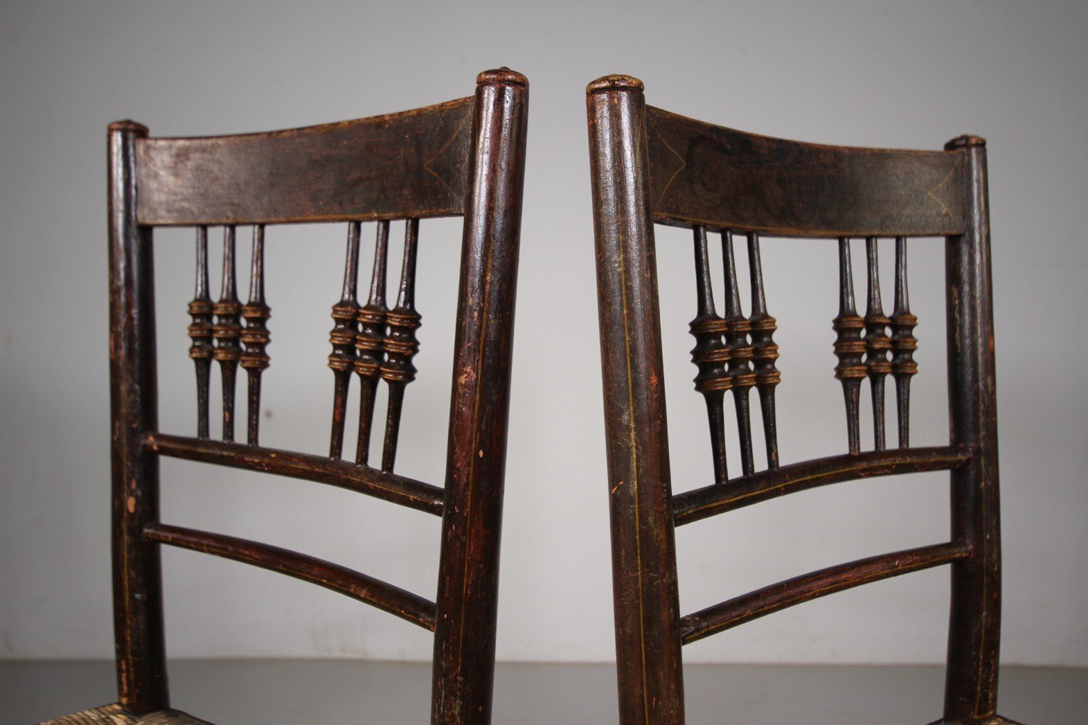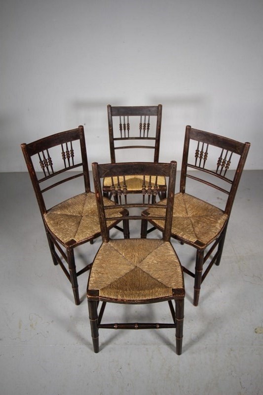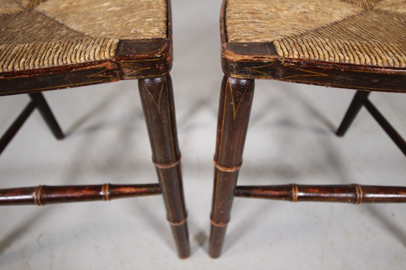 A lovely set of four, English simulated bamboo antique dining or side chairs that are still in the original paint finish and having original line work decorations. All four are in superb strong and intact condition, each has the original rush seats that are also in excellent condition. Great original survivors that feature spindle back rests with faux bamboo legs, stretchers and back spindles. English and dating to 1815.