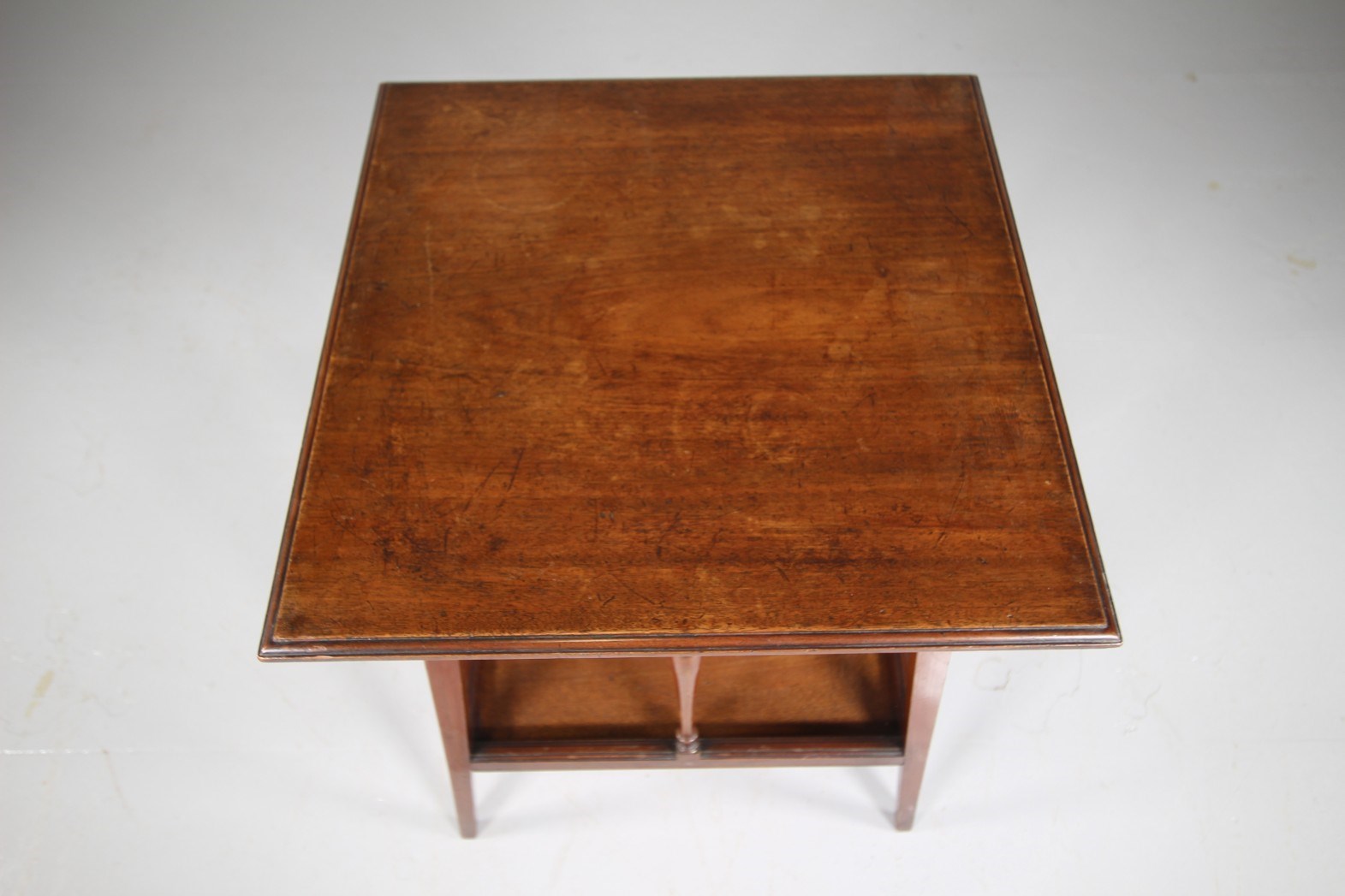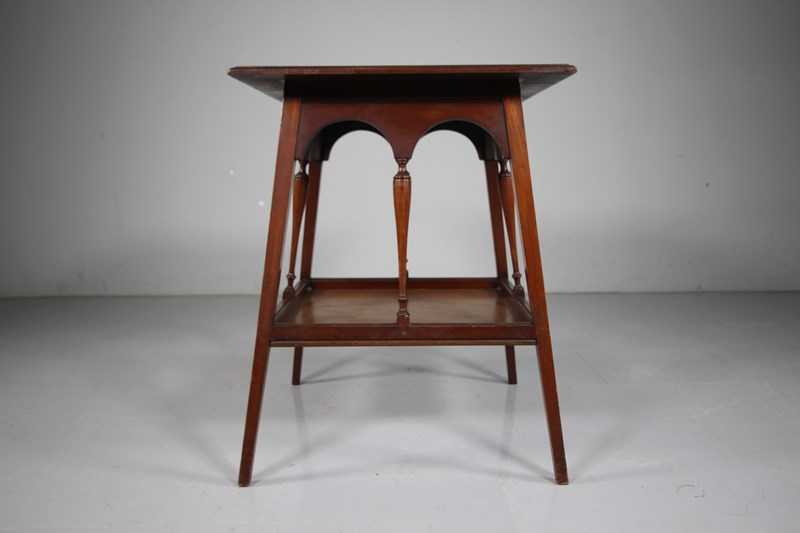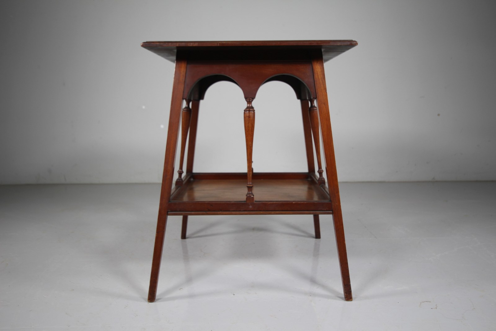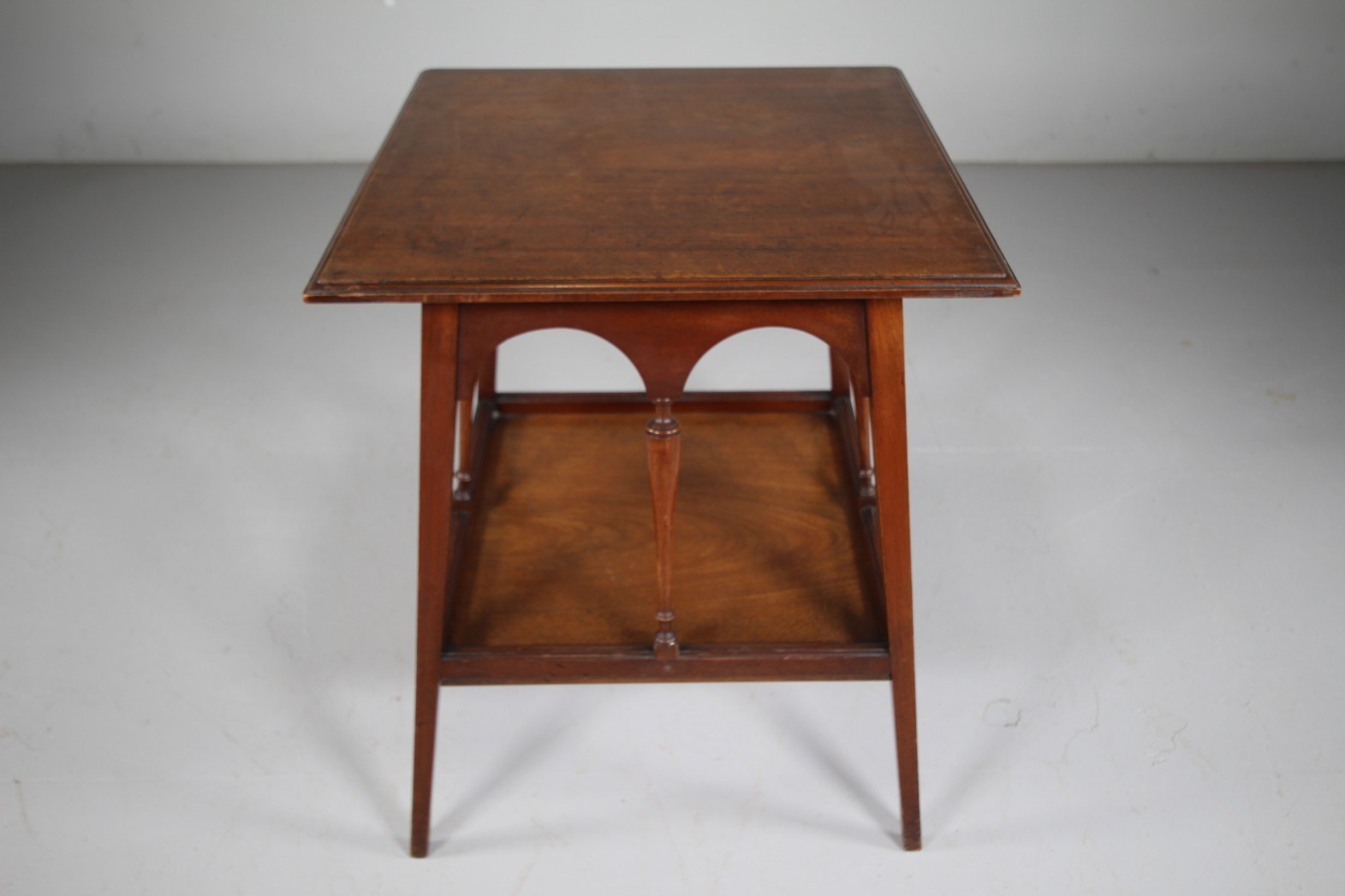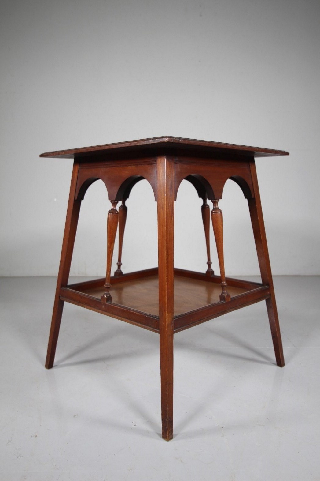 A very good quality solid antique walnut side table that has a square table top with a moulded edge on four splayed square and tapering legs. The under tray has four decorative column supports with arched supports. In superb condition and all in the lovely original finish. Dates to 1860-70.