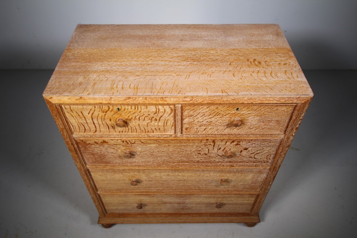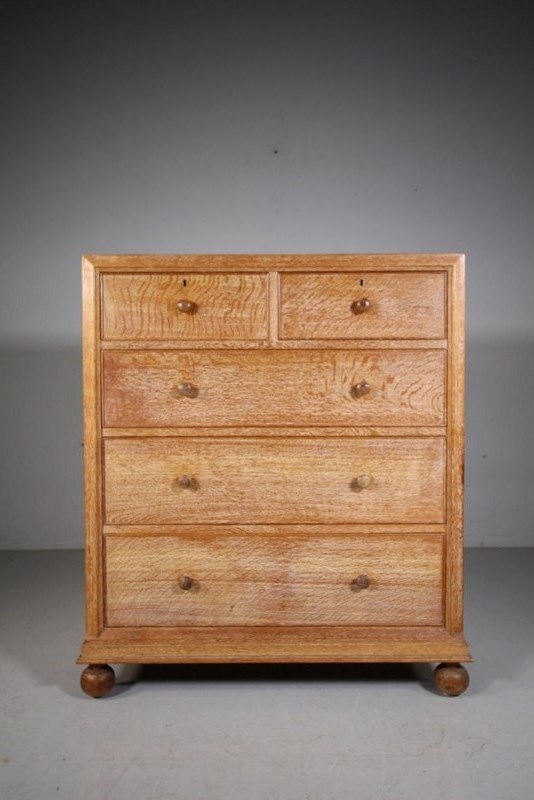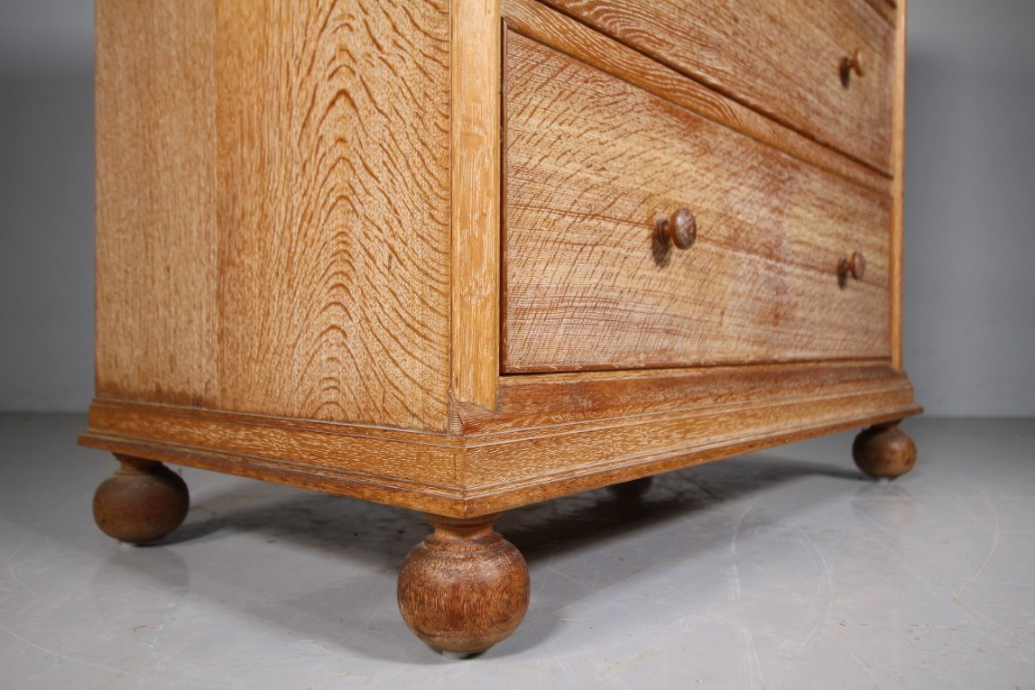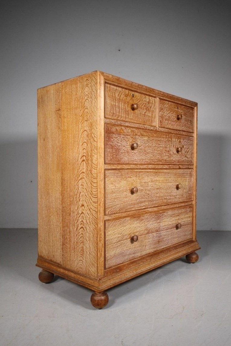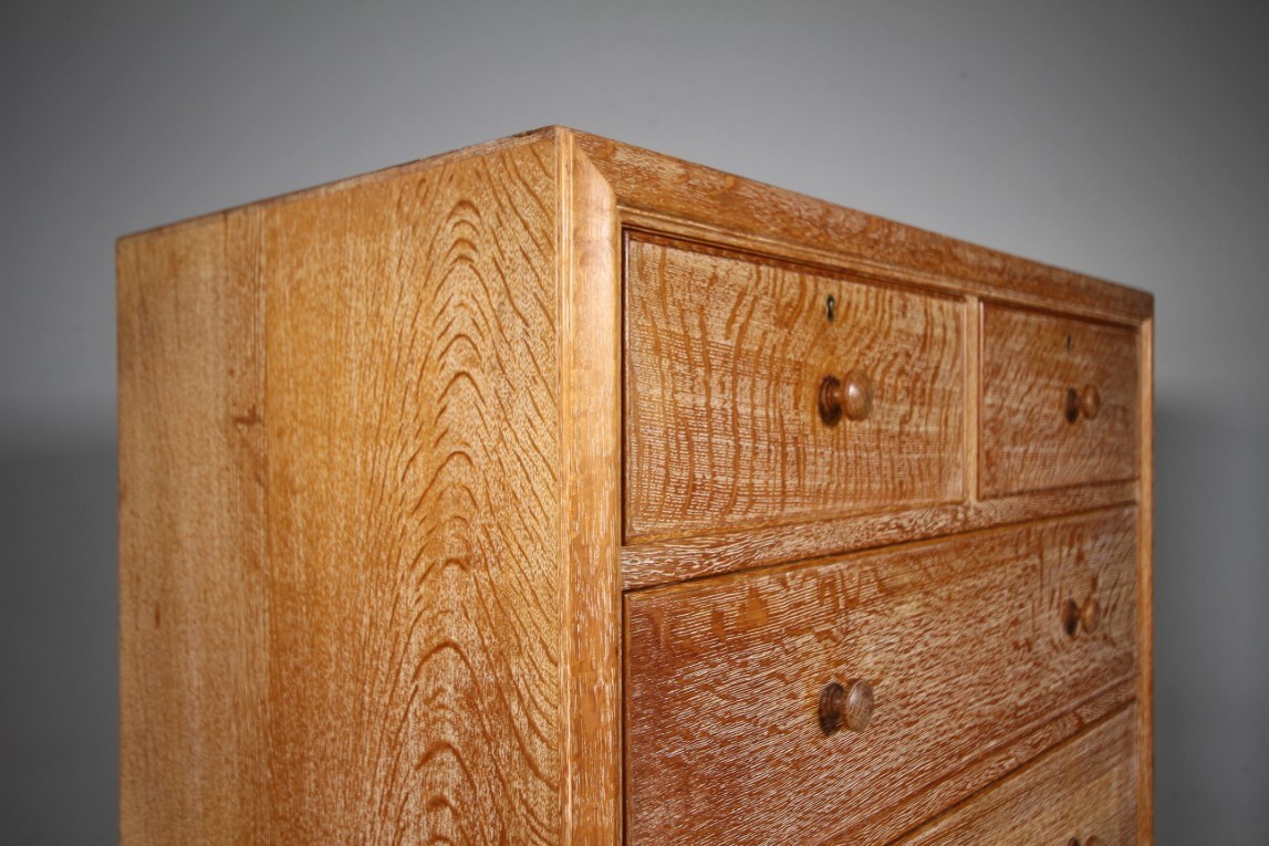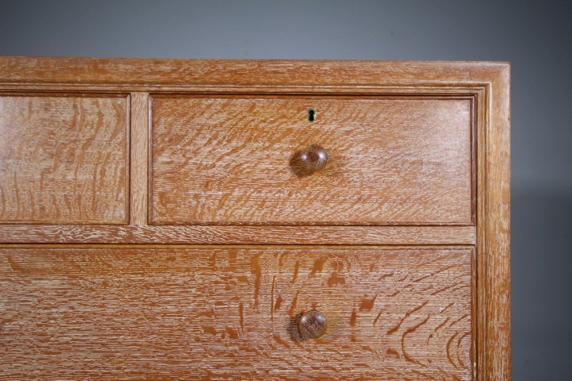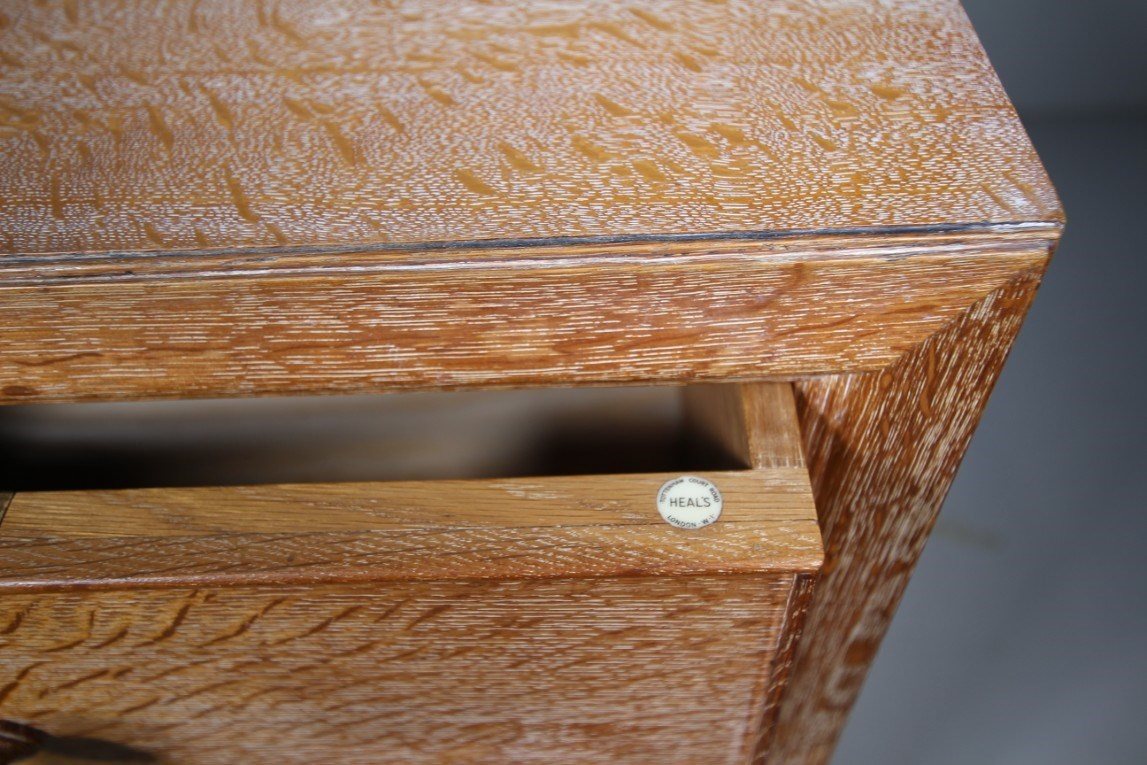 Superb Large Heals of London Antique Oak Chest of Drawers – Labelled This large, high quality Edwardian antique solid oak chest of drawers is by Heals of London around 1915, part of the Buttery Hutch range of Heals furniture. This piece is in exceptional condition, so very clean, in the original finish and with the Heals early makers label inset into a drawers. A larger model having two short drawers over three long and graduating drawers. They all run very smoothly, are oak lined with fine dovetailing and all are clean inside. Around the edge of this Heals chest is a decorative mould and it stands on lovely original oak bun feet. A beautiful Heals antique oak chest of drawers. DimensionsHeight: 108cm (42.86")Width: 96cm (38.10")Depth: 48.5cm (19.25")
