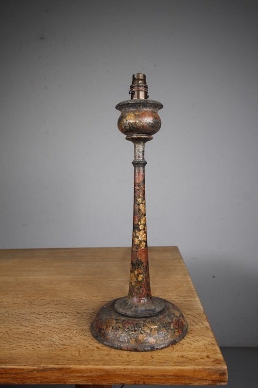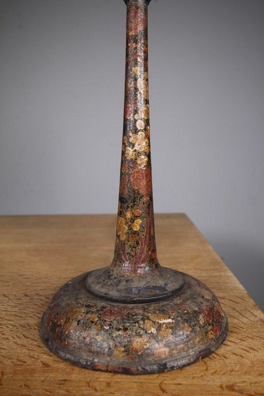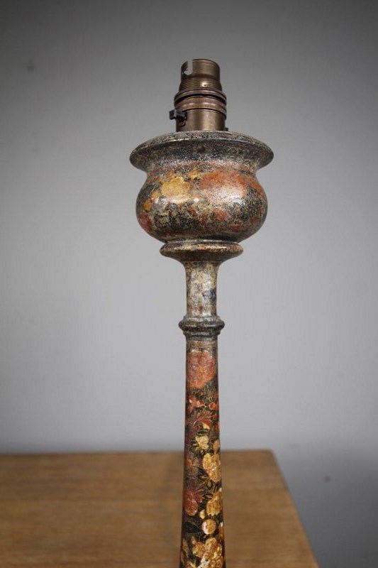 A lovely tall and elegant early 20th century antique Kashmiri table lamp that has a round base with a tapering stem that finishes with a urn shaped top. In very good, original condition and newly rewired using traditional quality braided flex and tested. A taller example that dates to 1900.