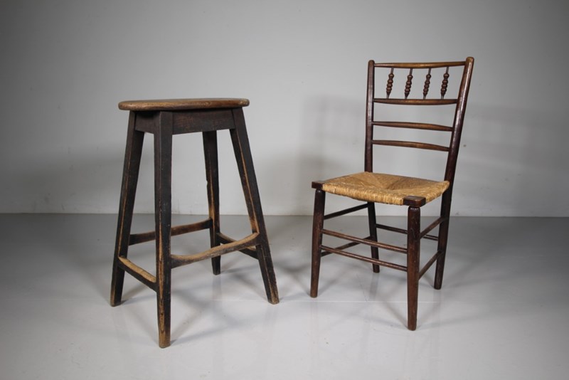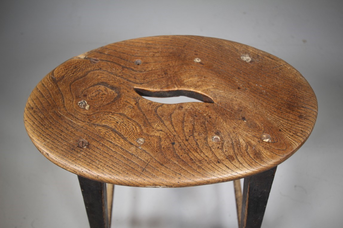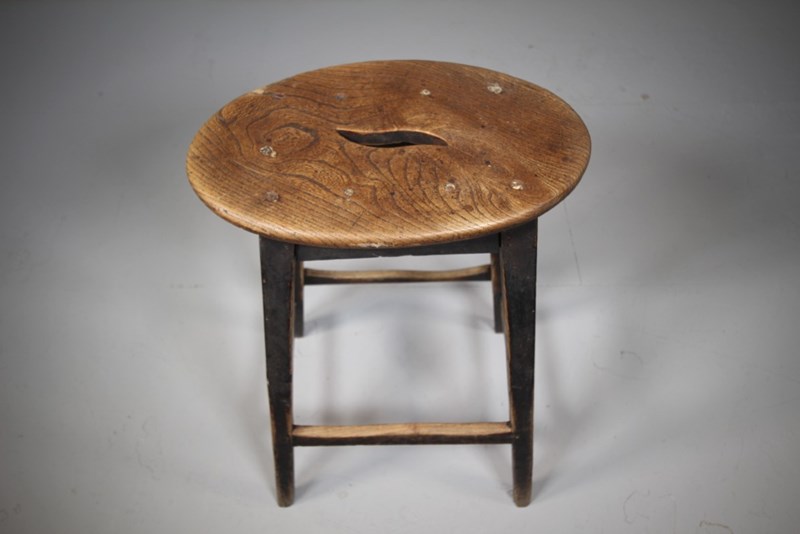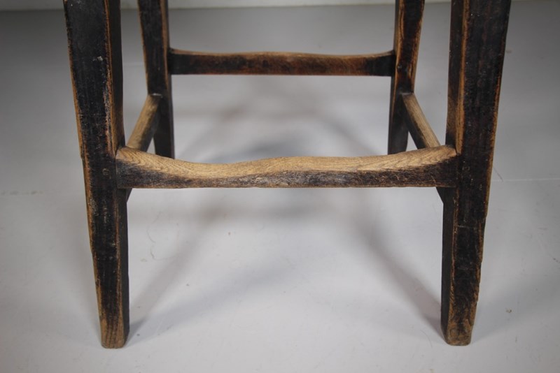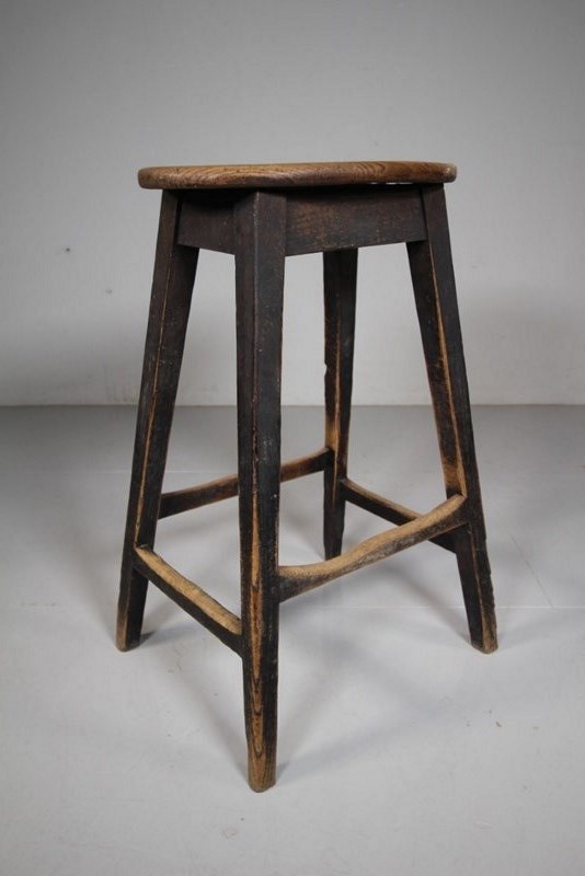 A beautiful English country antique kitchen stool made entirely in solid elm that is a wonderful colour and finish. Tall enough to use at a bar or kitchen island and features a single piece oval elm seat that has an original cut out hand hold. Stands firmly on four square and tapering legs that are joined by well worn stretchers. A lovely piece that is in excellent, solid condition.