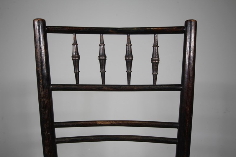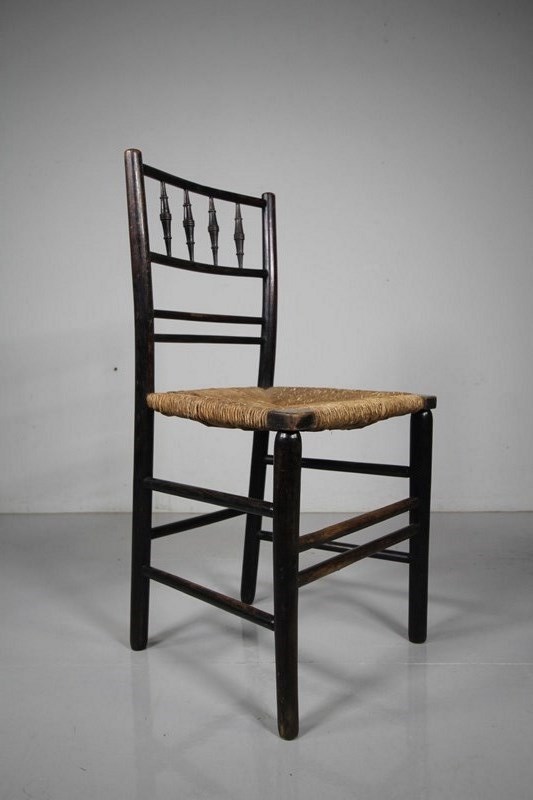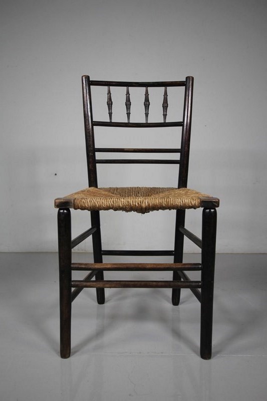 A lovely original 19th century English antique Sussex chair by William Morris around 1870. In excellent, strong condition and still in the original ebonised finish. Perfect height for dining or desk work, but would work well as a side chair in a bedroom or bathroom. Complete with the traditional seagrass seat that is also in super condition. This is a true Morris chair, not a look alike that other companies made in the late 19th century.
