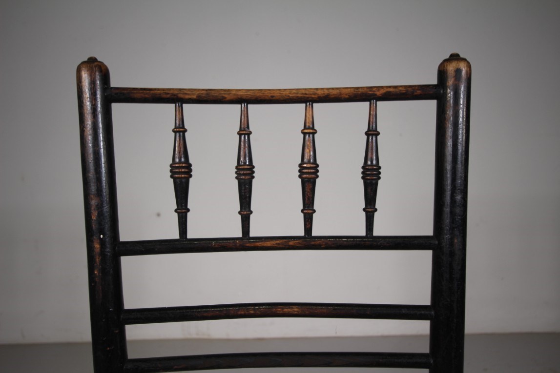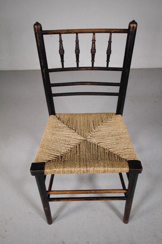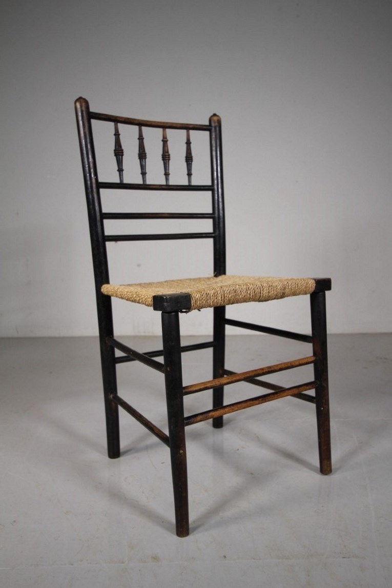 A lovely original 19th century English antique Sussex chair by William Morris around 1870. In excellent, strong condition and still in the original ebonised finish. Perfect height for dining or desk work, but would work well as a side chair in a bedroom or bathroom. Complete with the traditional seagrass seat that is also in super condition. This is a true Morris chair, not a look alike that other companies made in the late 19th century.