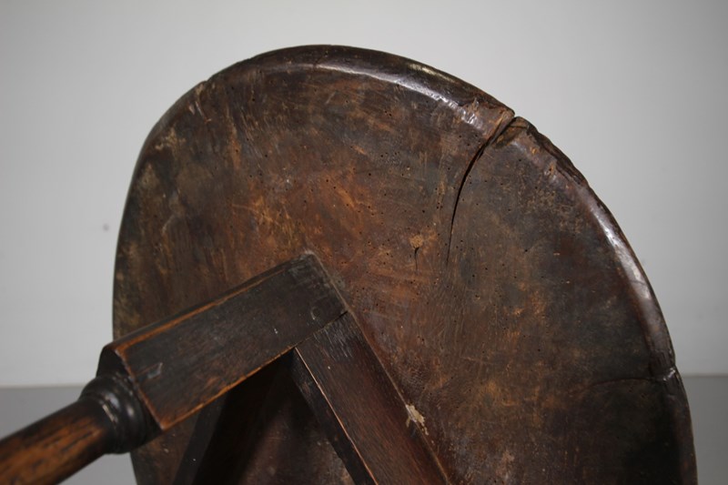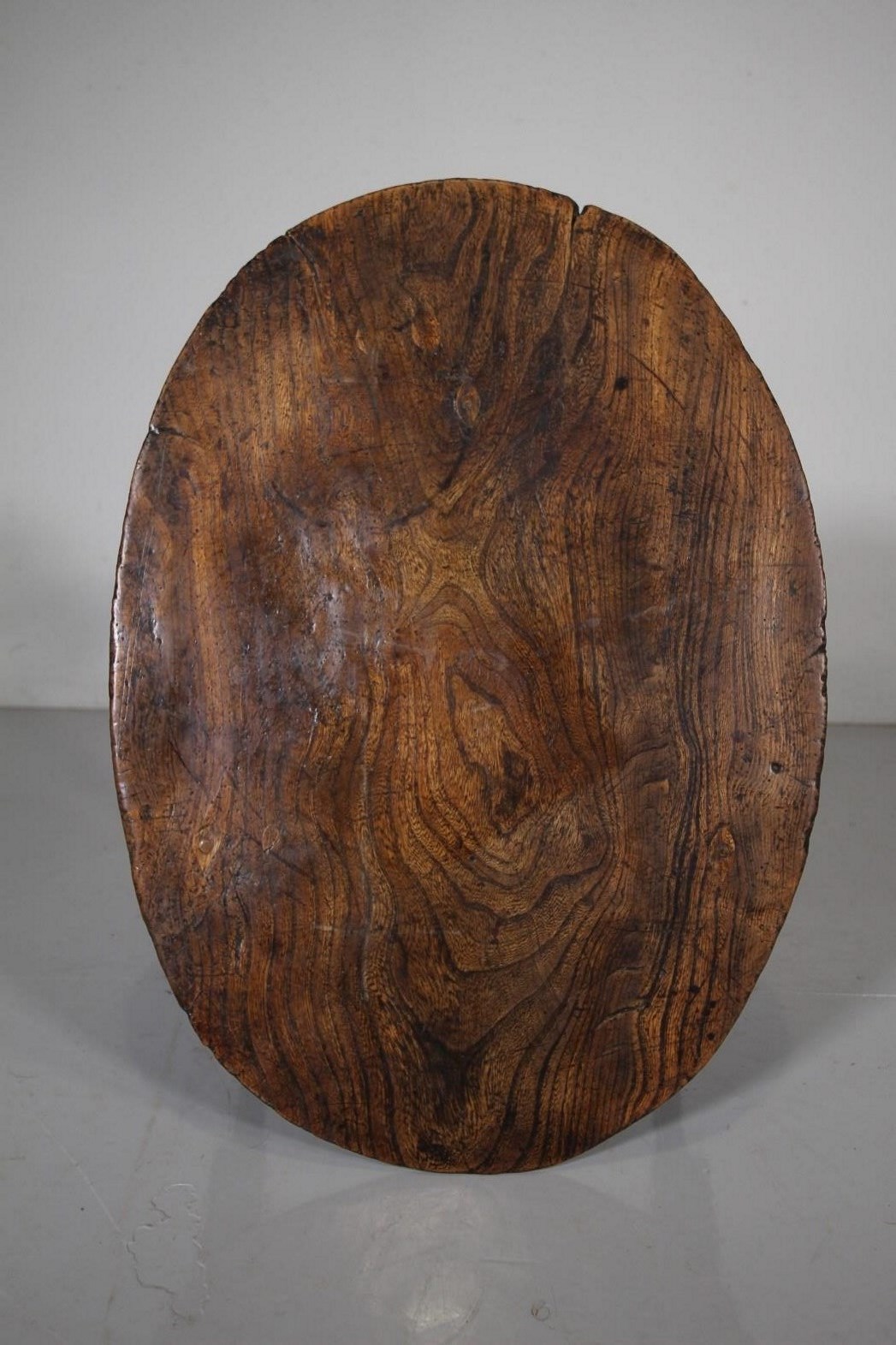 A superb English early Georgian antique period elm and oak cricket table with an original oval large table top. A very honest example that dates to around 1730, stands well on three well turned legs that are joined by square stretchers, all pegged construction with wonderful wear on the stretchers. The rare antique oval cricket table top is one piece of elm whilst the antique cricket table base is in oak. A lovely original colour and finish and in excellent condition. A rare piece of English Early Georgian English antique country furniture.