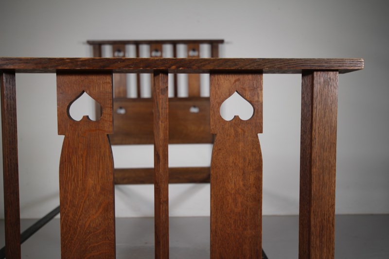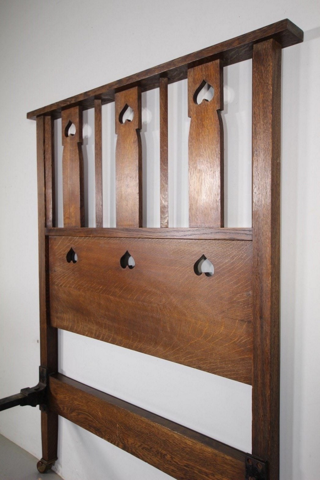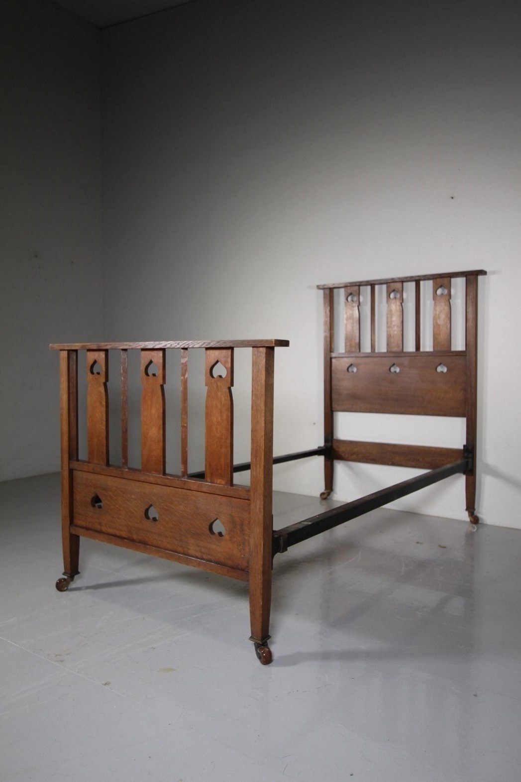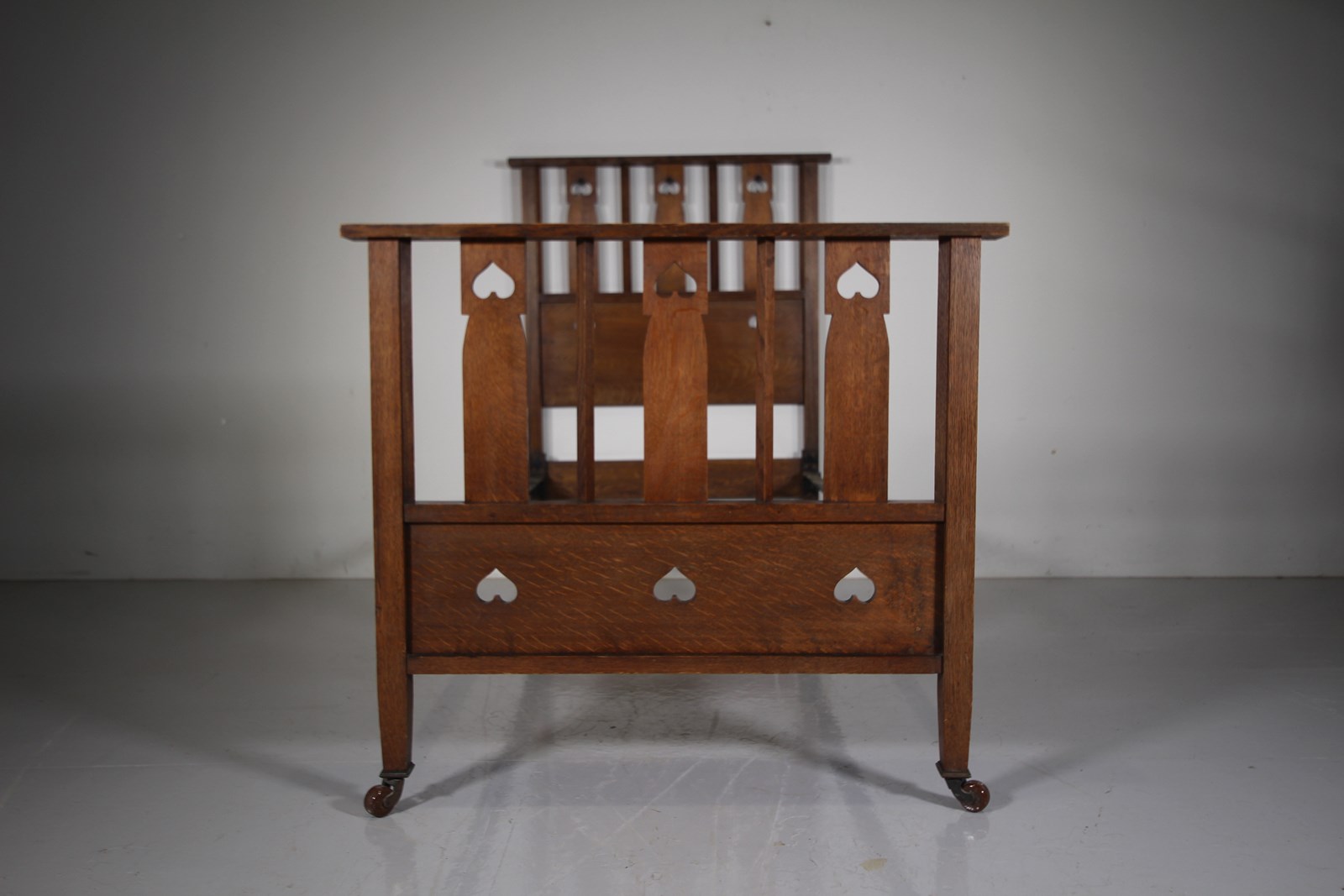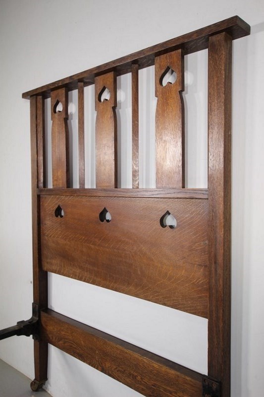 This is a very rare to find, Late 19th century antique solid oak single bed by Heals of London, part of their St.Ives range of furniture that features pierced heart motif decorations. High quality and in superb original condition, a standard Uk single bed size, comes with the original iron side rails. We can have made a bespoke slatted wooden mattress base, please enquire if required. The footboard is 93cm high. A fabulous rare piece of early Heals antique furniture that is documented in the original Heals catalogue, please see image. Dates to 1890-1900.