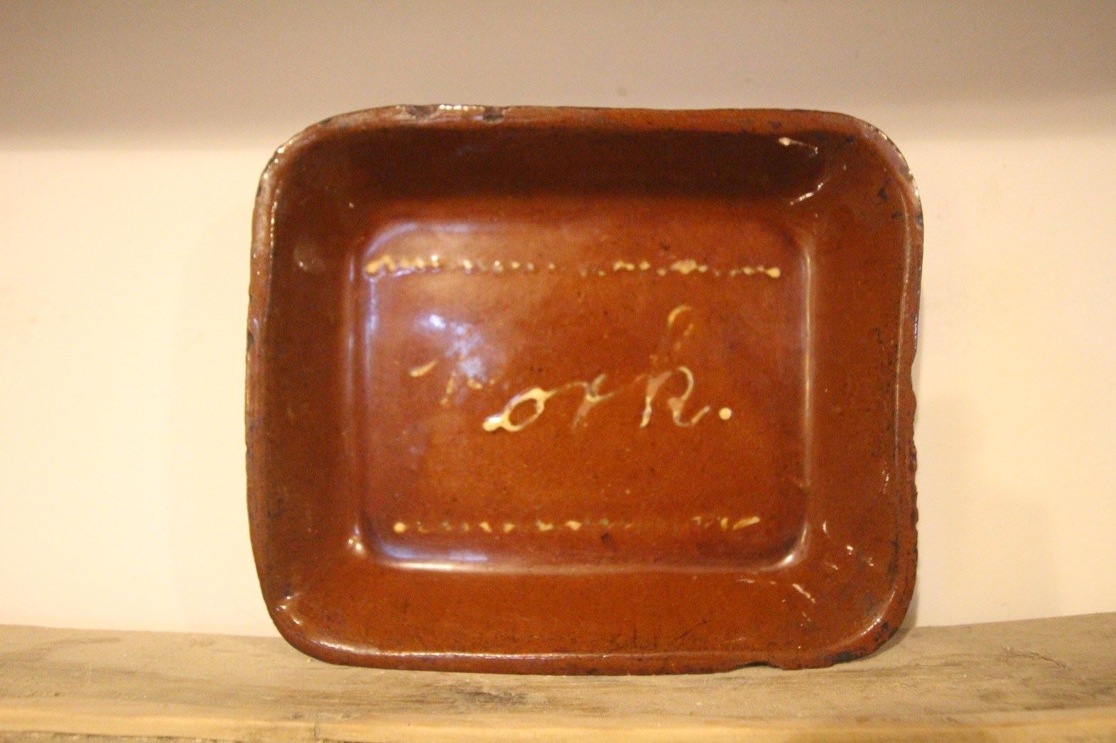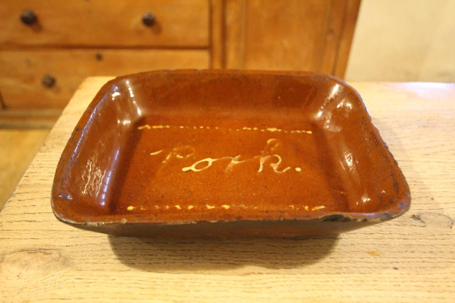 A lovely late 19th century antique Buckley pottery slipware Pork dish from North Wales. Hand decorated with slip trailed decorations and the Pork lettering. In very good condition with no cracks. A decorative piece of antique kitchenware, amazing that any of these survived as they were actually used for cooking.