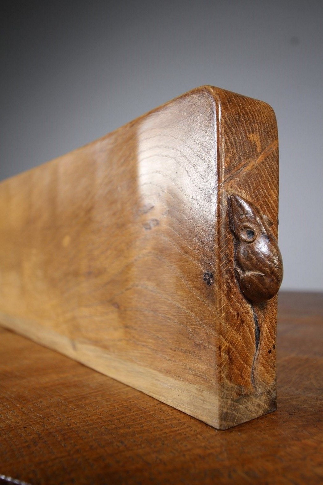 A very lovely long solid adzed oak Mouseman mantle shelf, very unusual having two mice, one to each end. In superb condition and all a beautiful colour to the adzed surface. The oak board is unfinished on the underside. Would make a wonderful long 1940’s Mouseman oak wall shelf or to be used as a mantle piece above a fireplace. Unusual to have two signature carved Mouseman mice, as usually there is only one per piece.