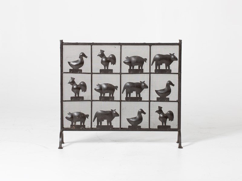 A wrought iron and mesh fire screen attributed to Atelier Marolles. French, c. 1950s.