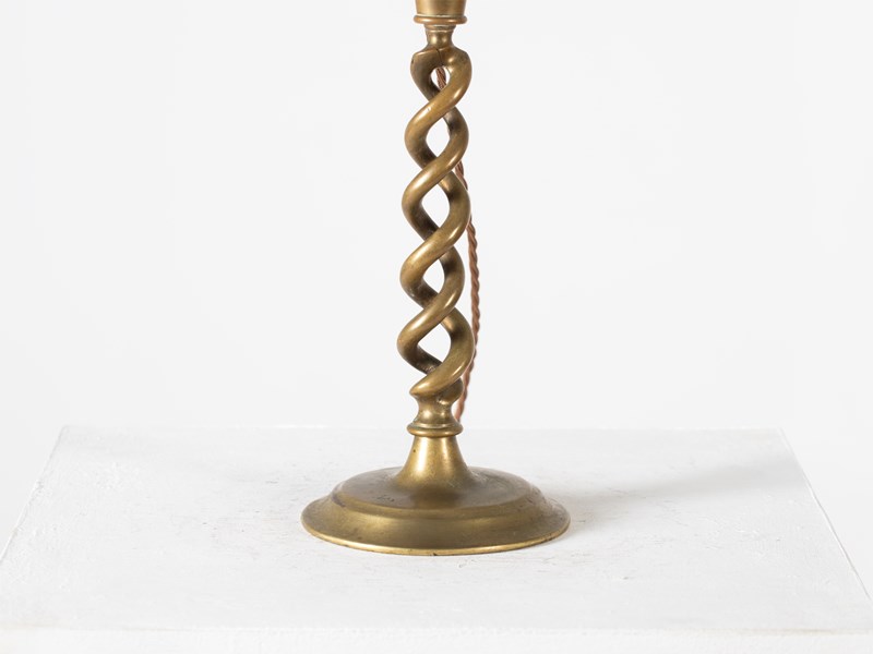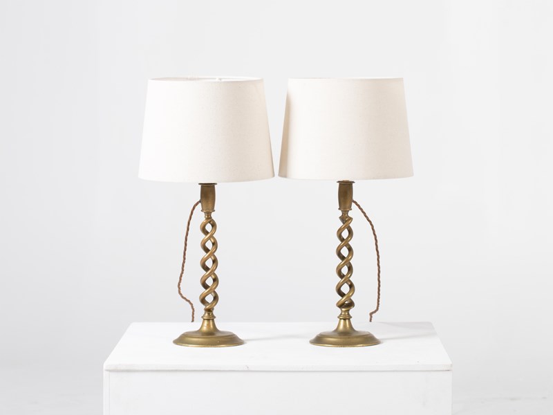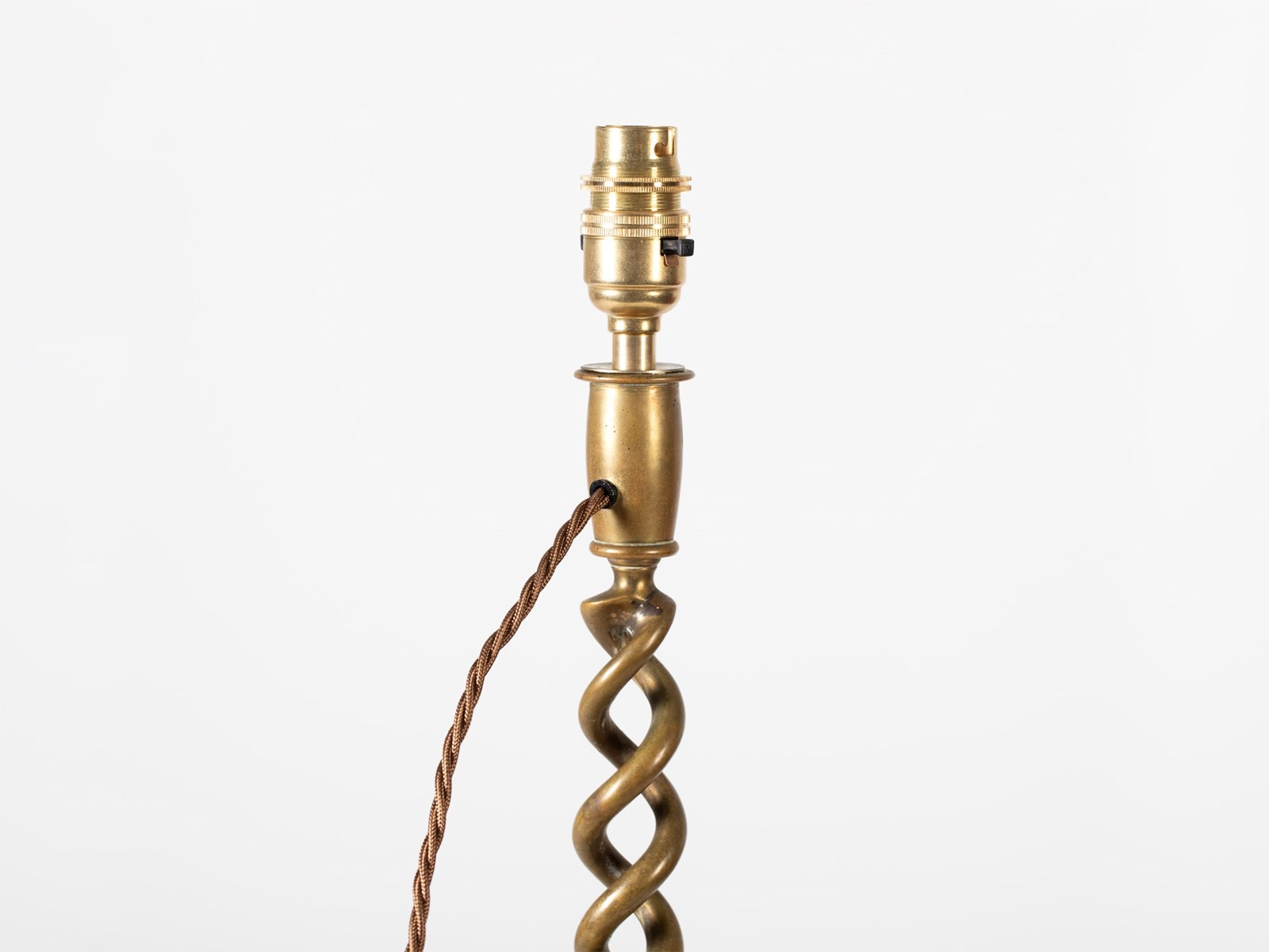 A pair of patinated brass barley twist candlestick table lamps. French, early-mid 20C.