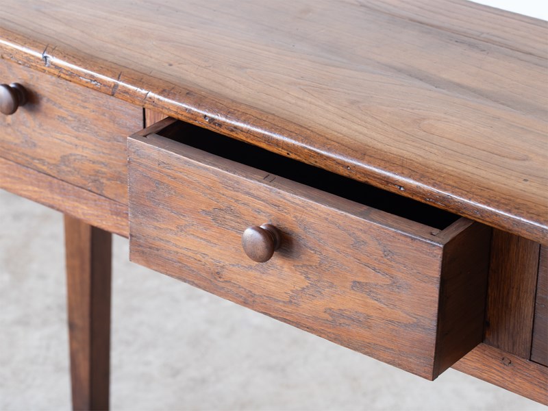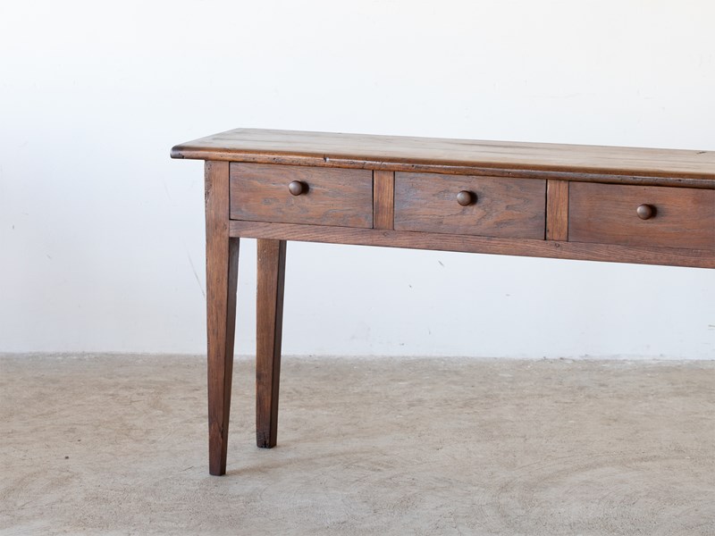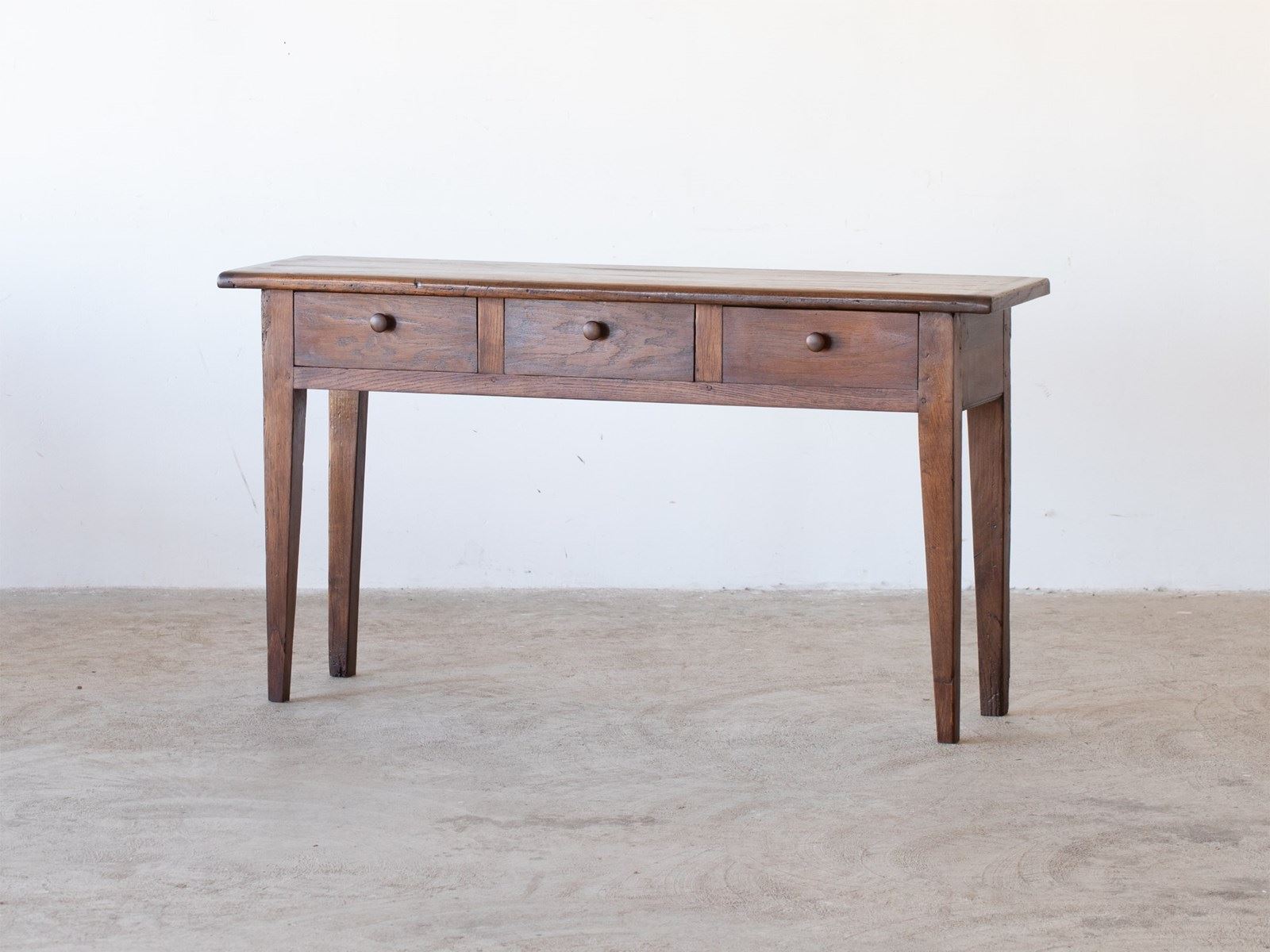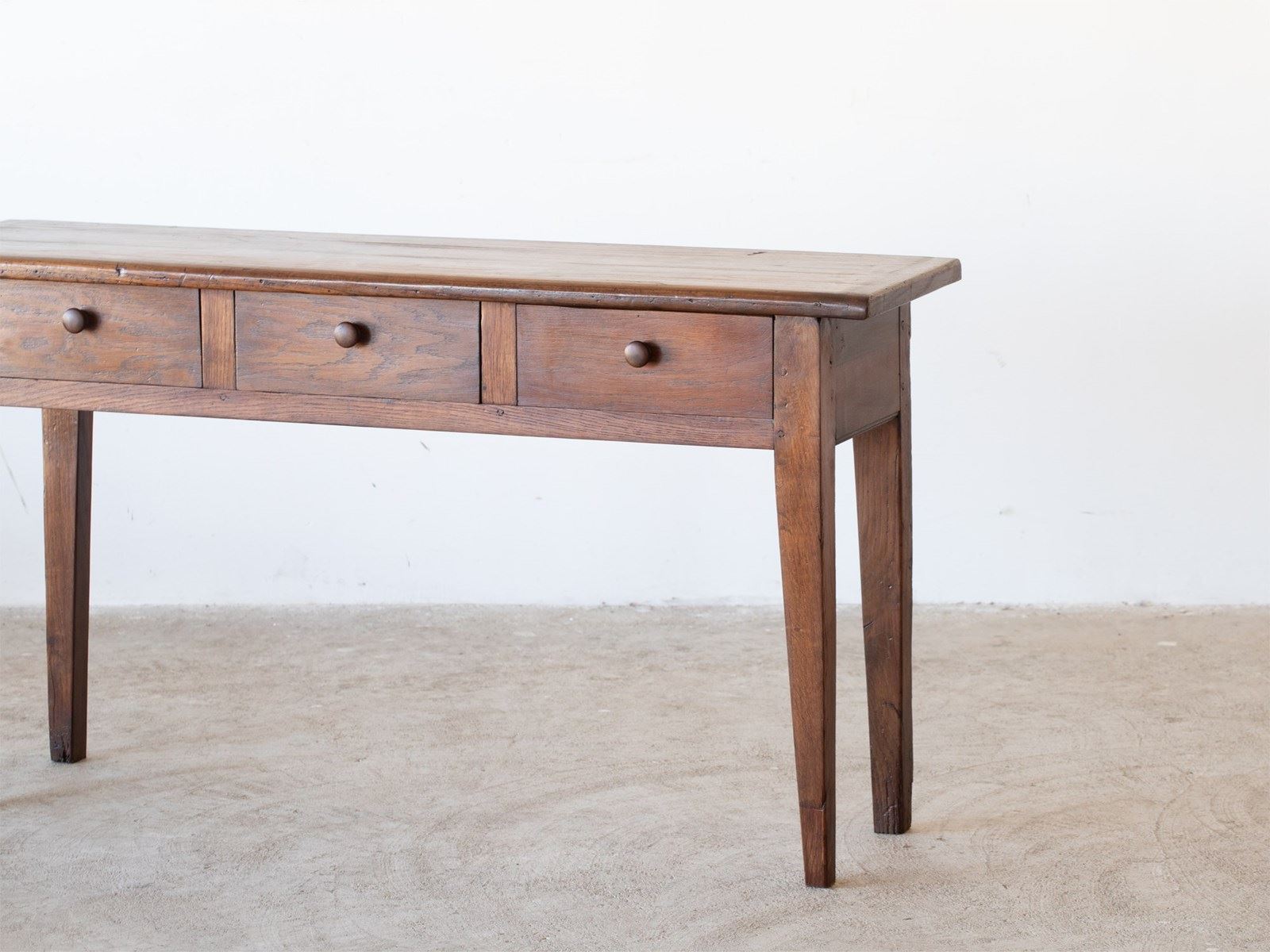 A three-drawer chestnut serving table or console adapted from a larger antique French table.