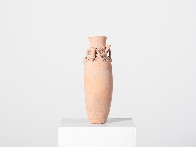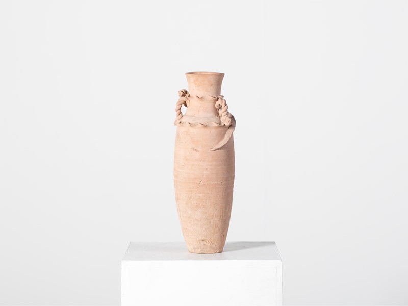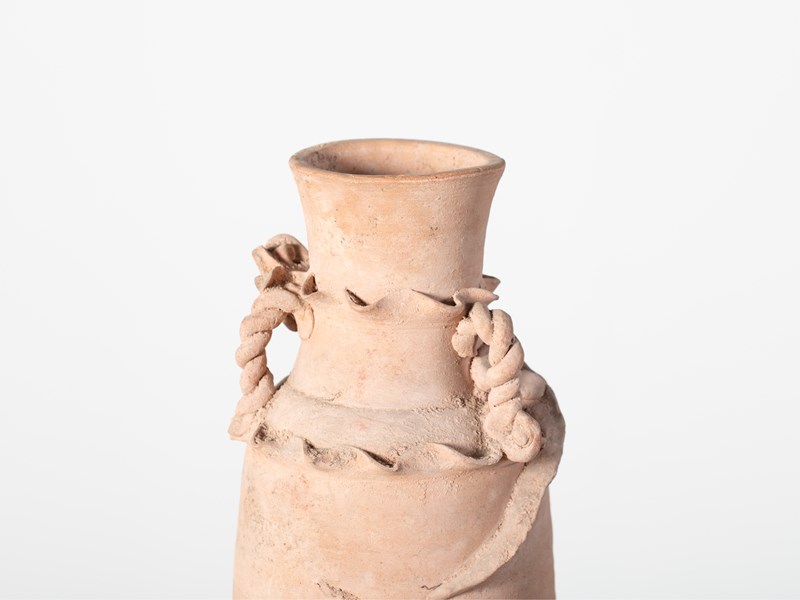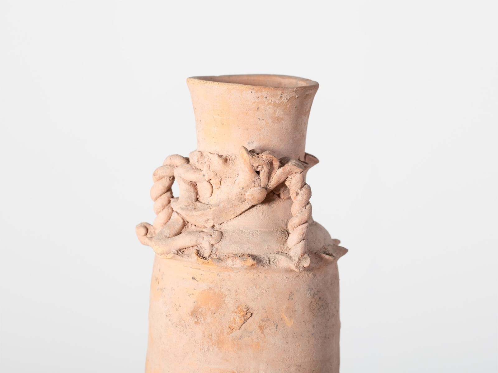 An early buff pottery granary jar with chi dragon figure and rope twist handles. Southern Song Dynasty, China, c. 1127-1279.