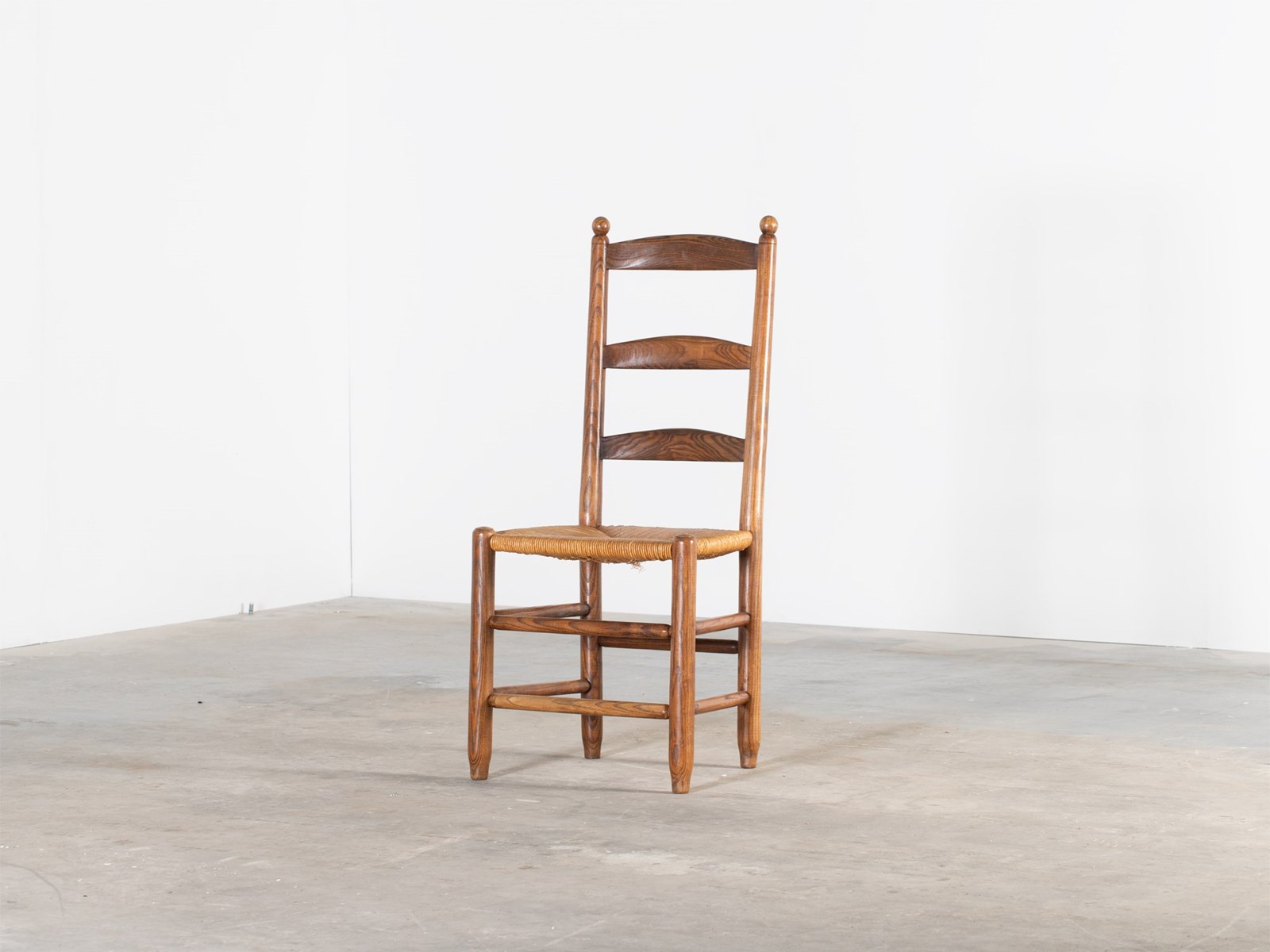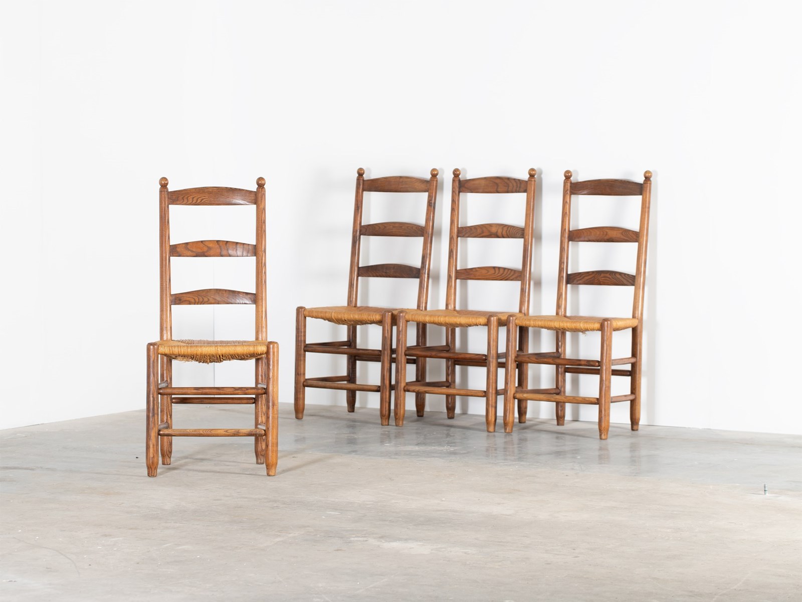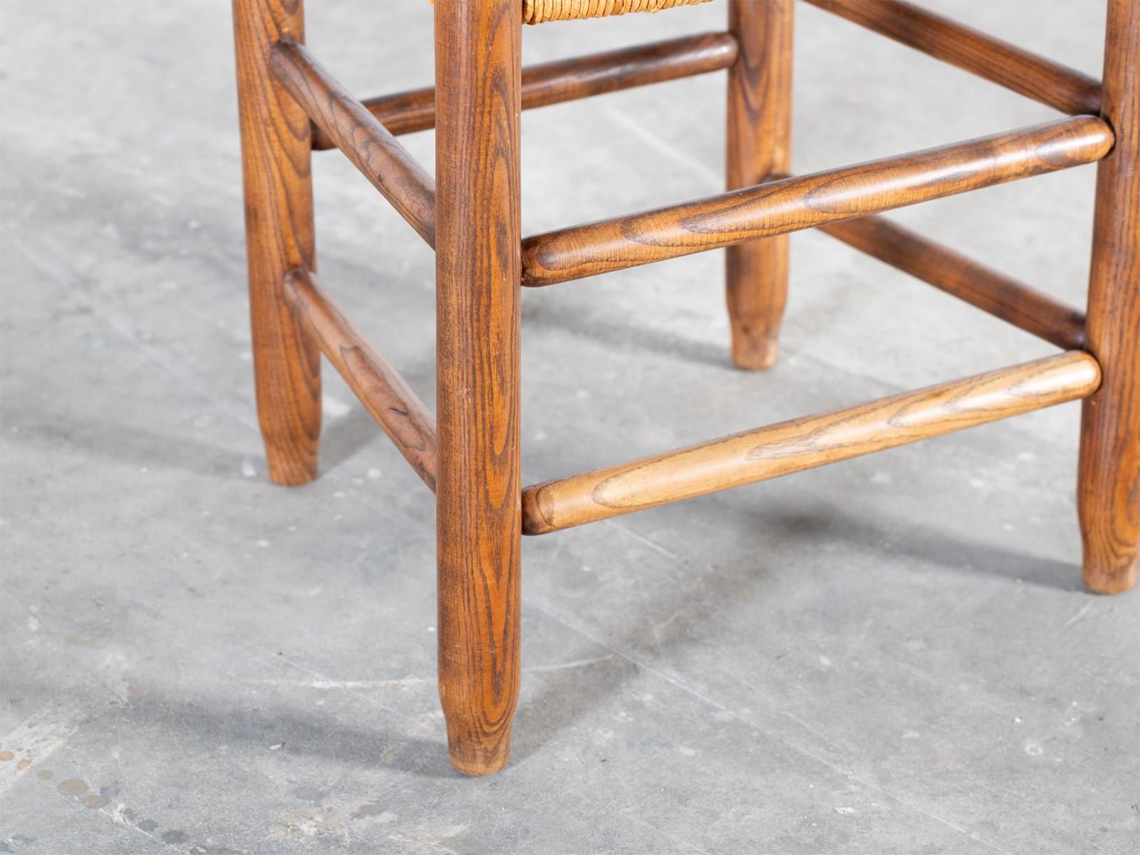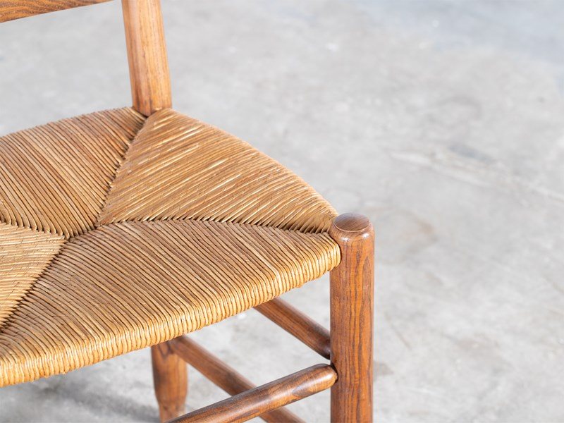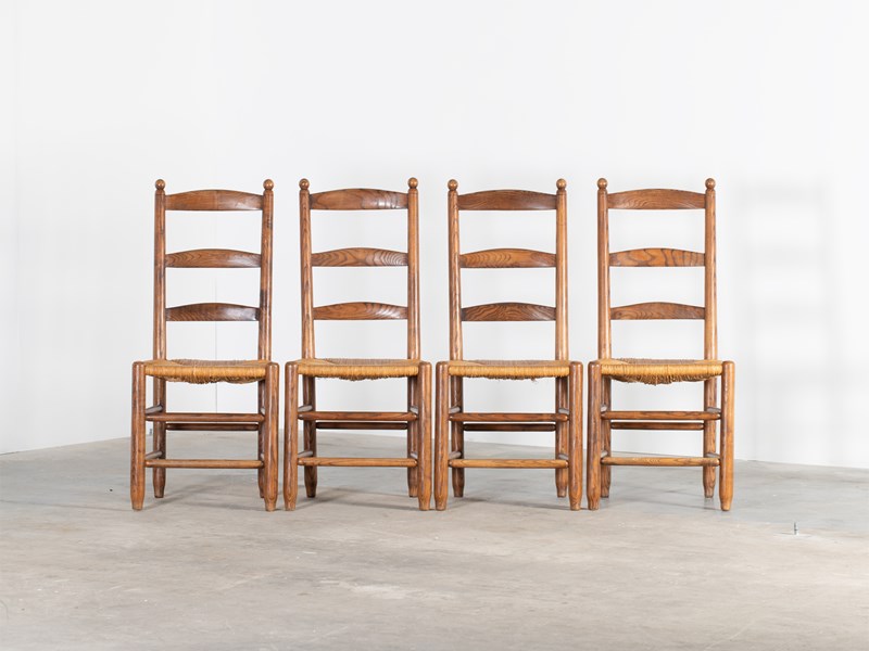 A set of four ladderback dining chairs with beautifully figured elm frames and rushwork seats. French, mid 20C.