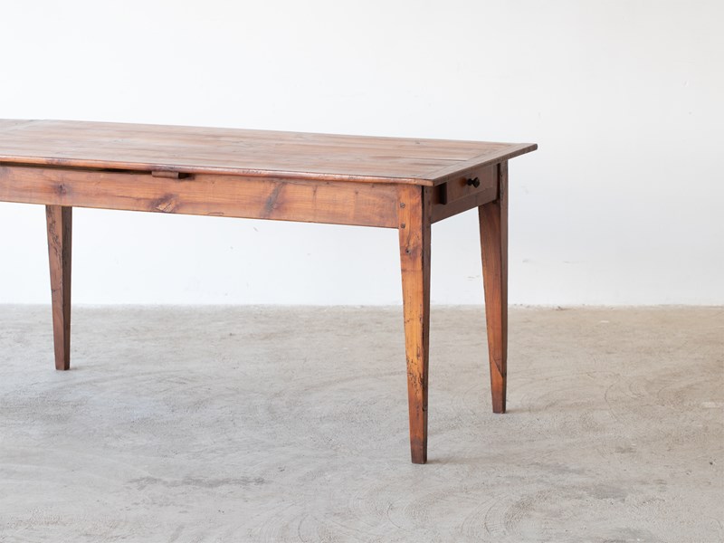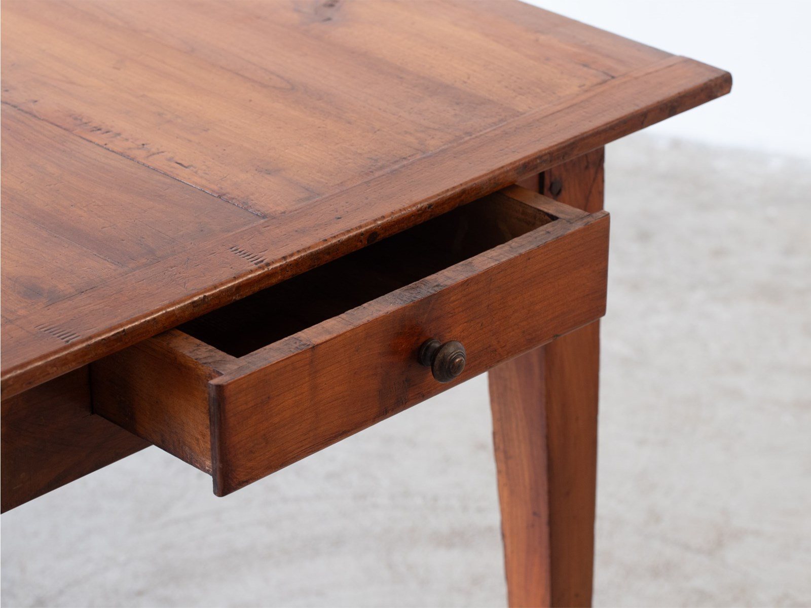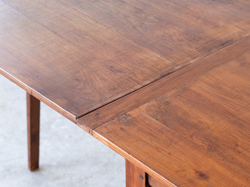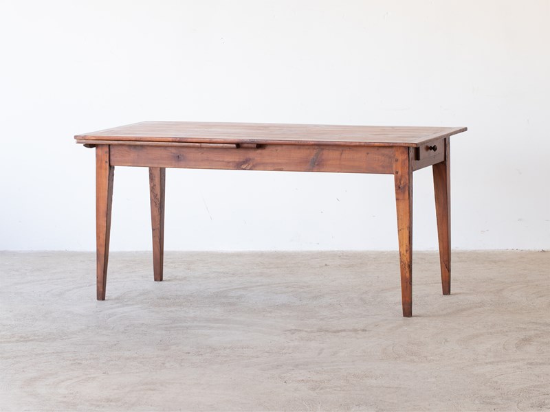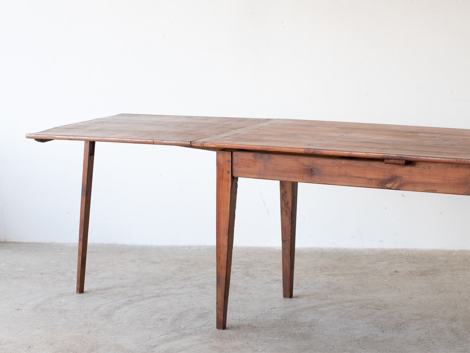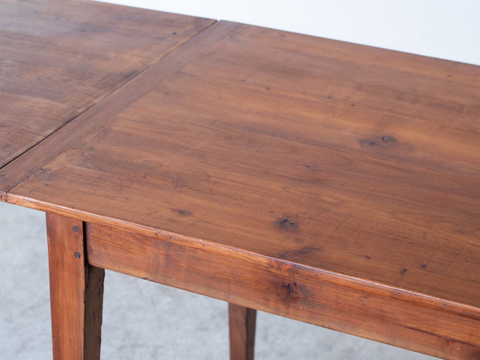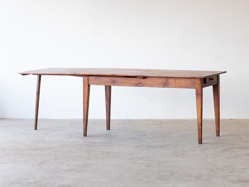 A cherrywood farmhouse dining table with a pull-out oak extension and end drawer. French, early 20C.
