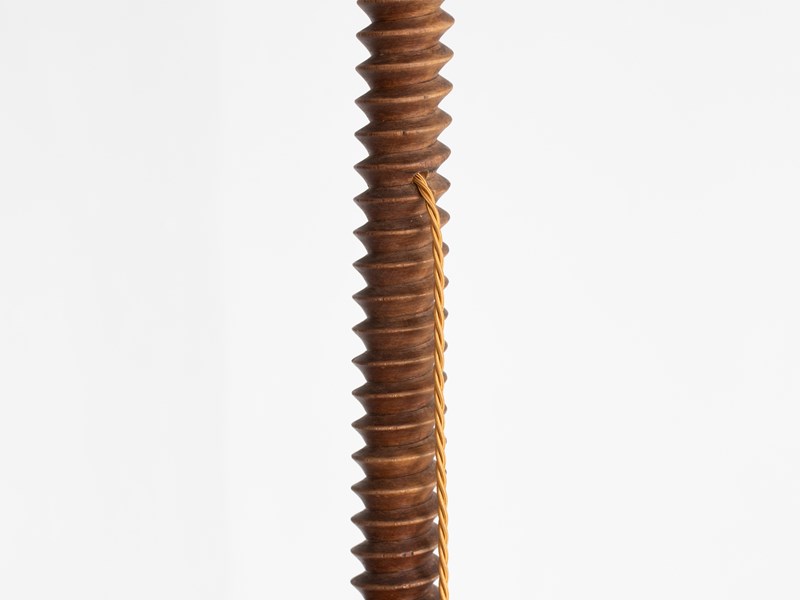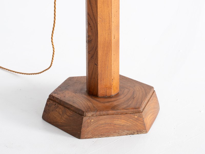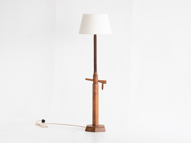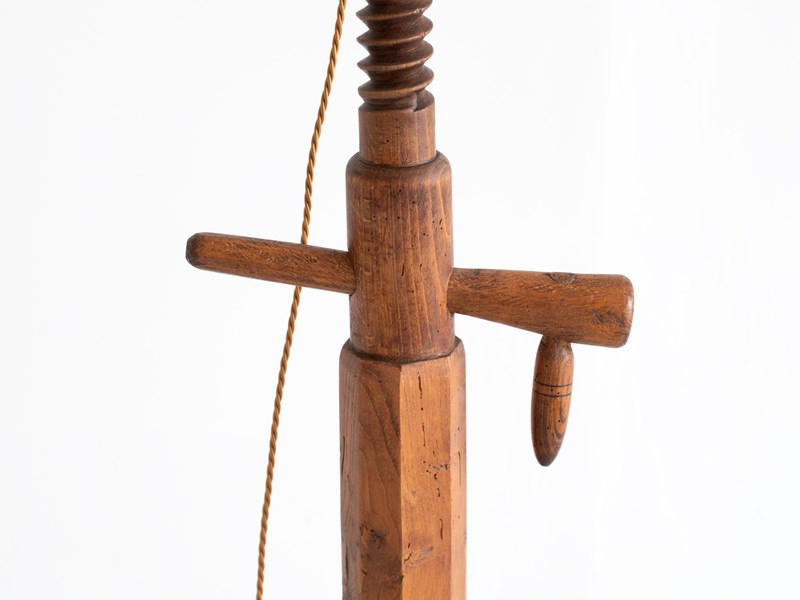 An elm and beech folk art floor lamp converted from an antique screw press. French, mid 20C.