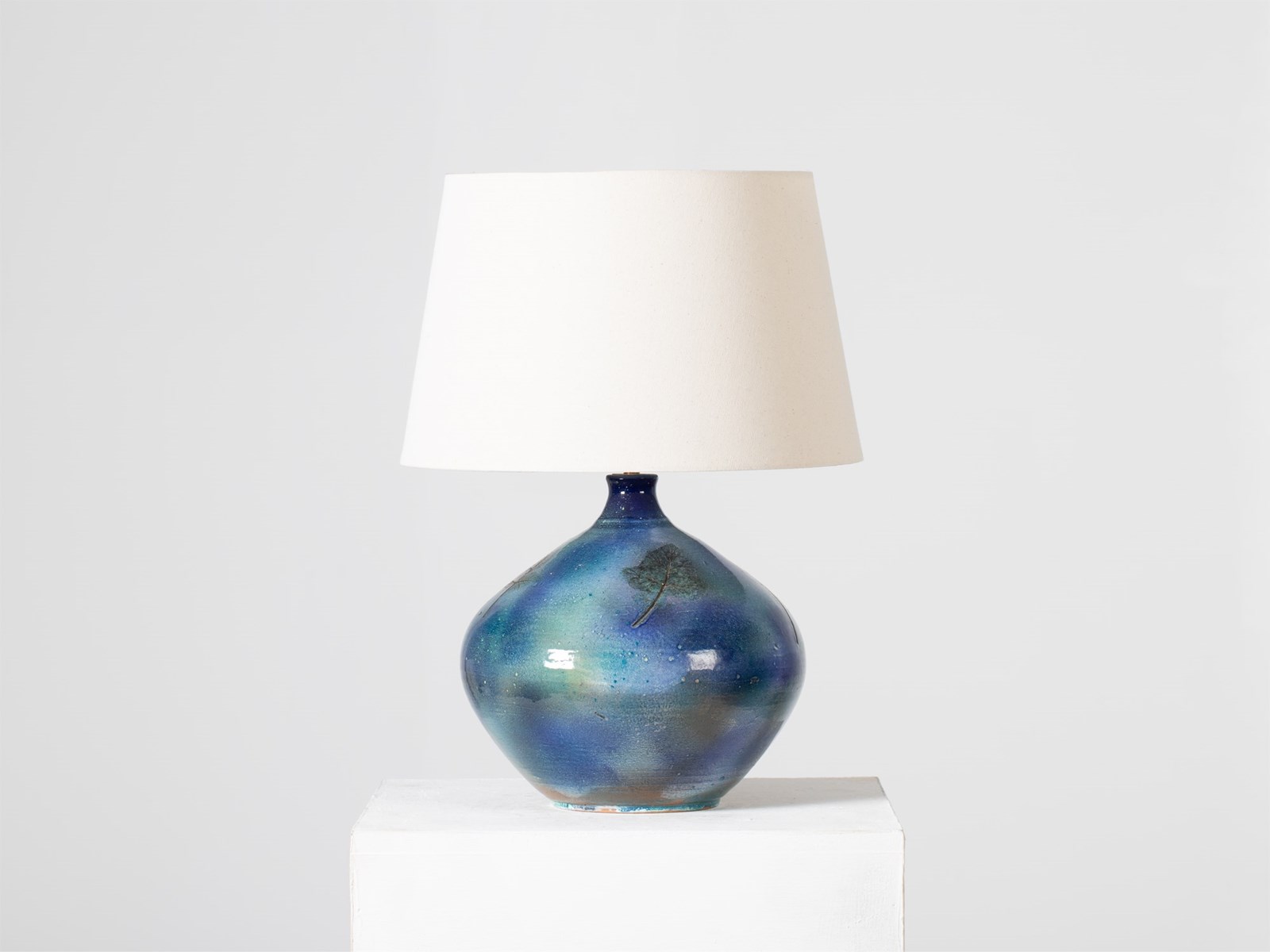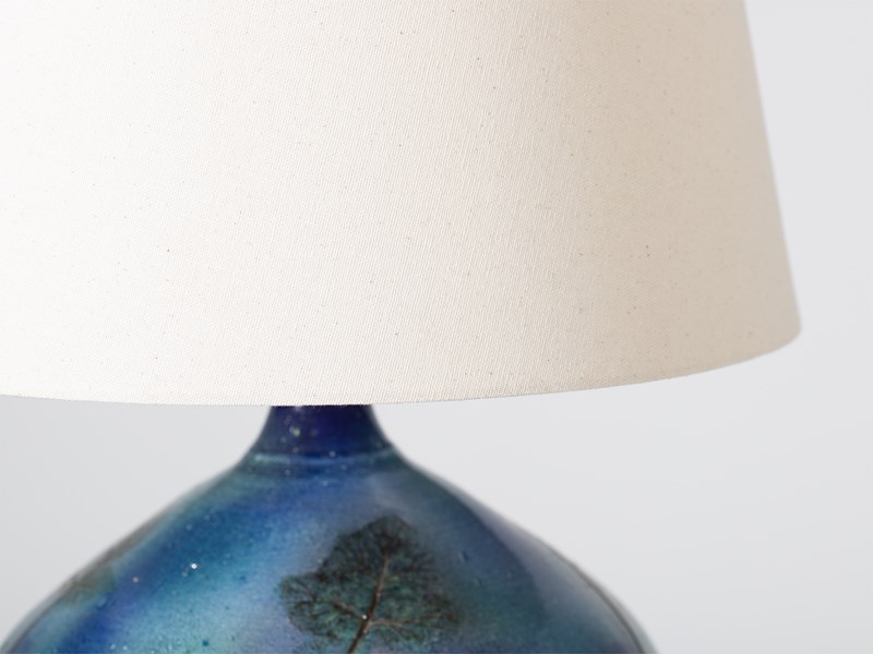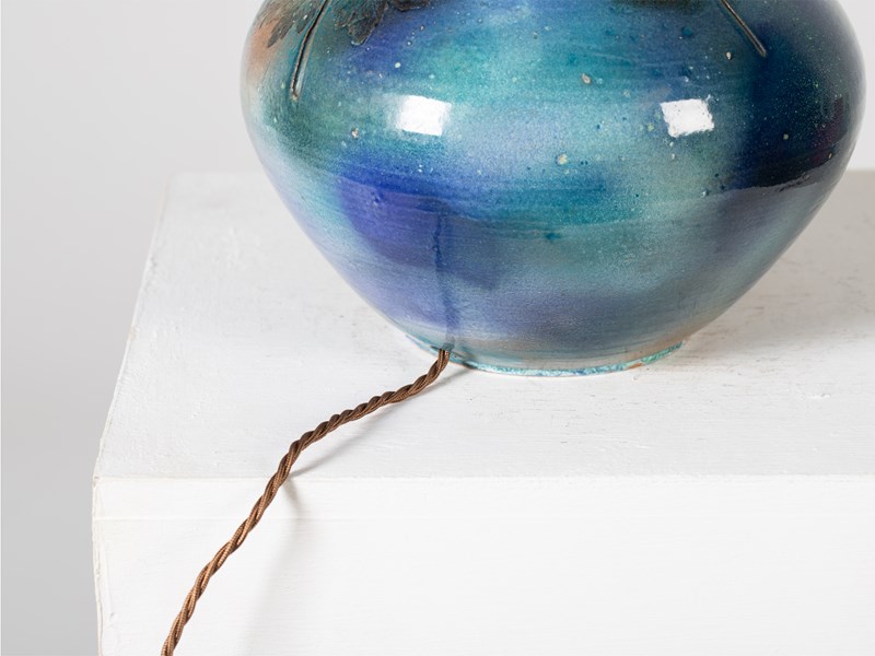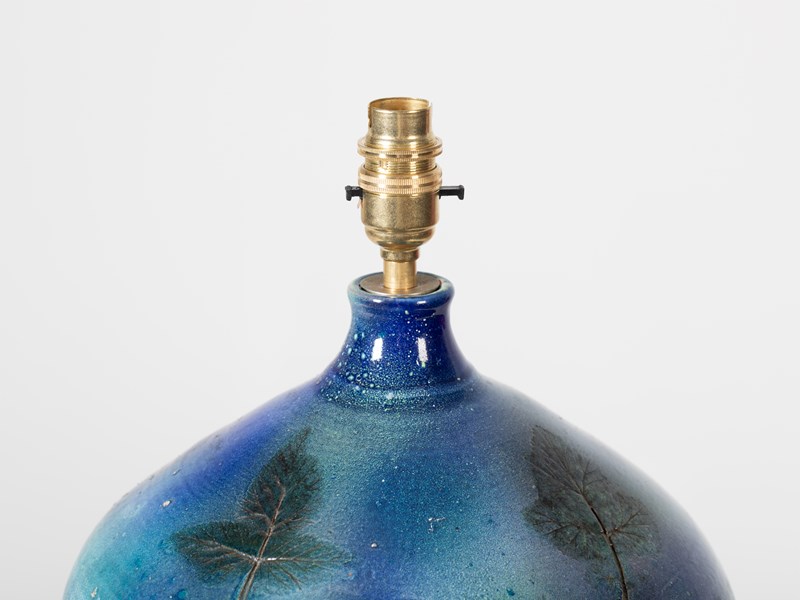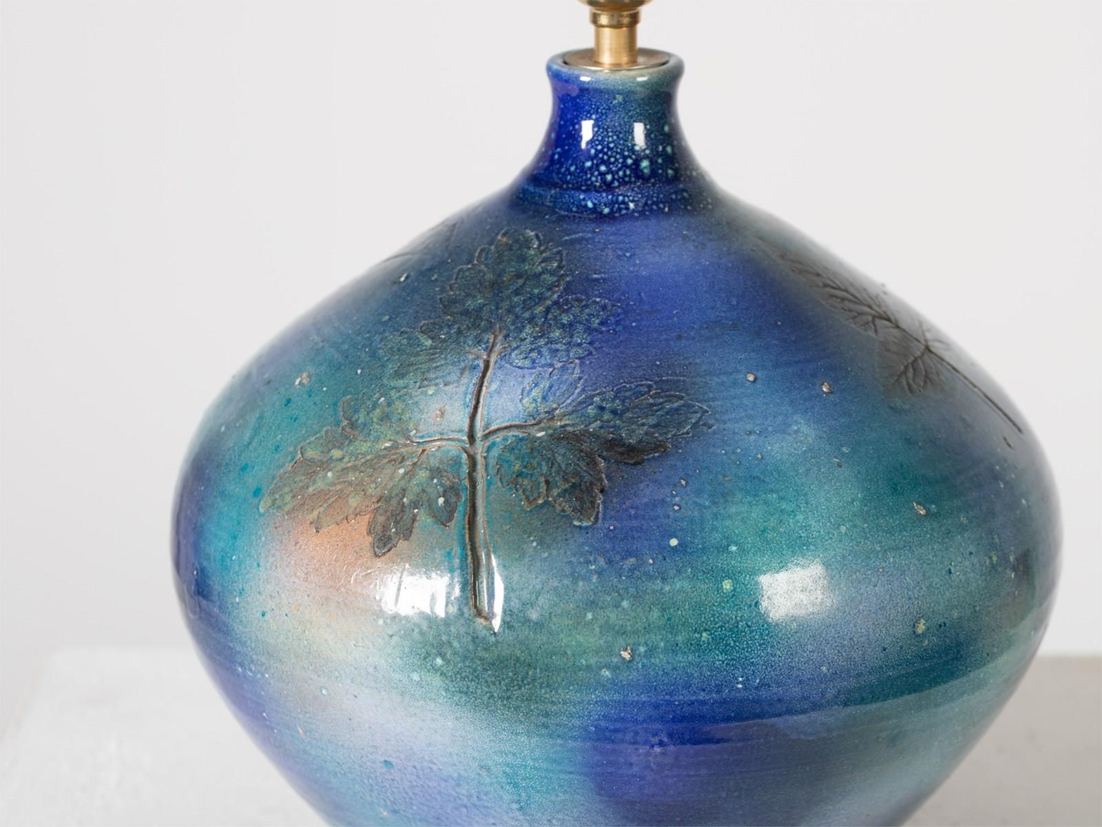 A studio pottery terracotta table lamp with impressed leaves and iridescent blue glaze. Signed to the base. French, c. 1970.