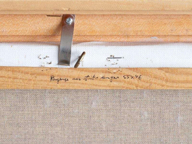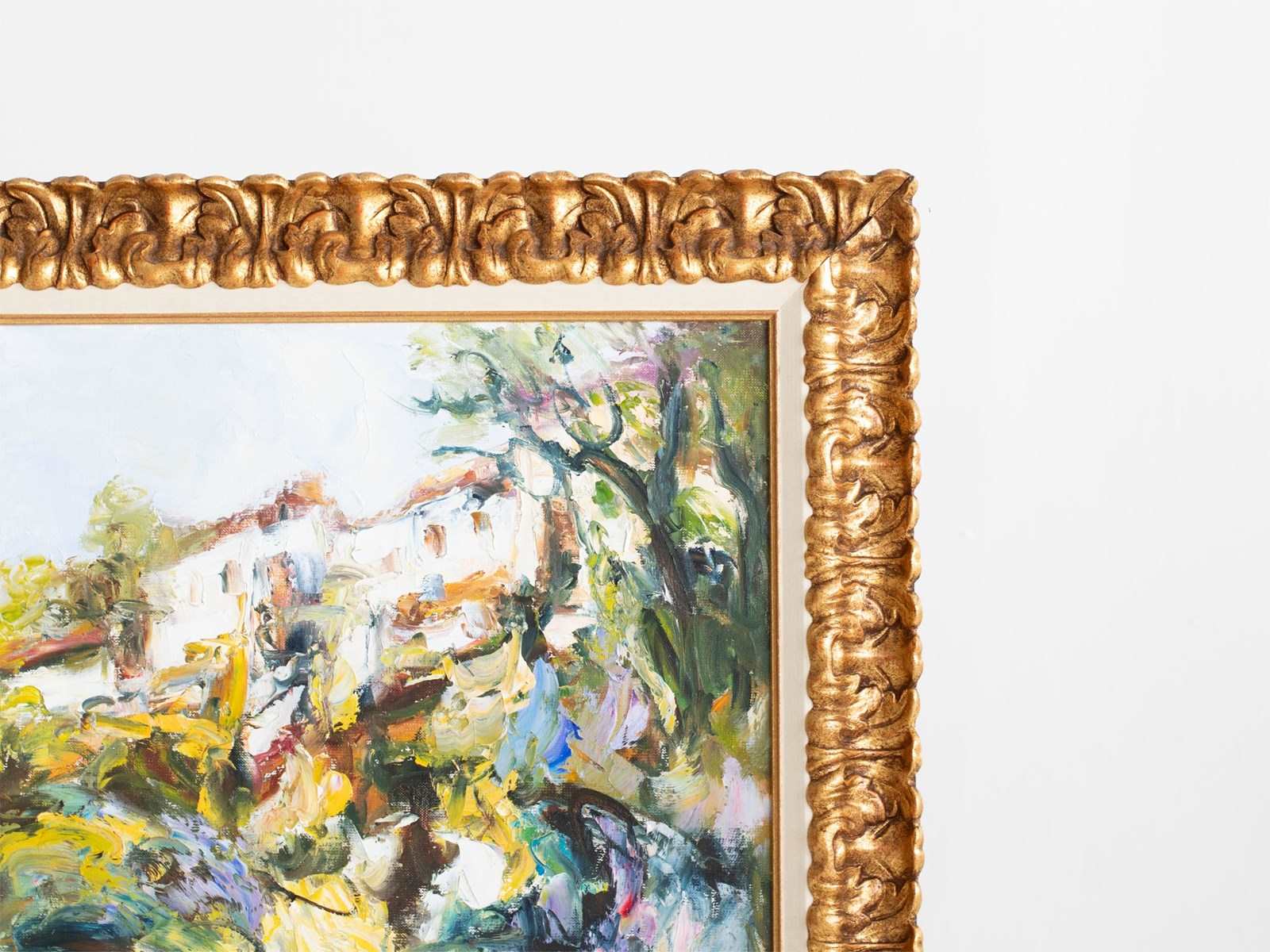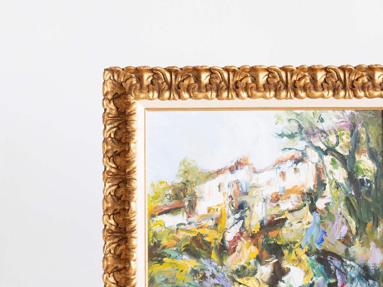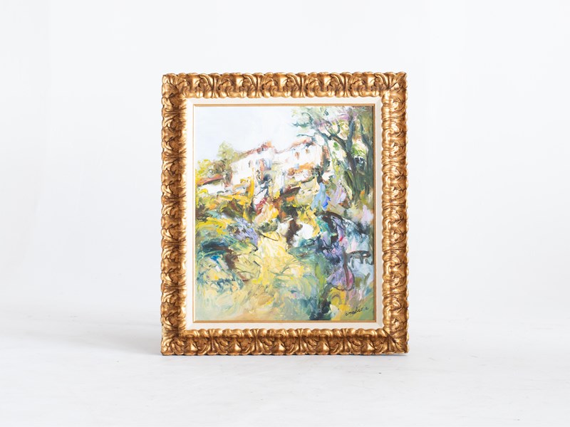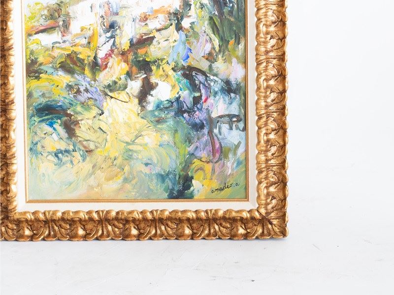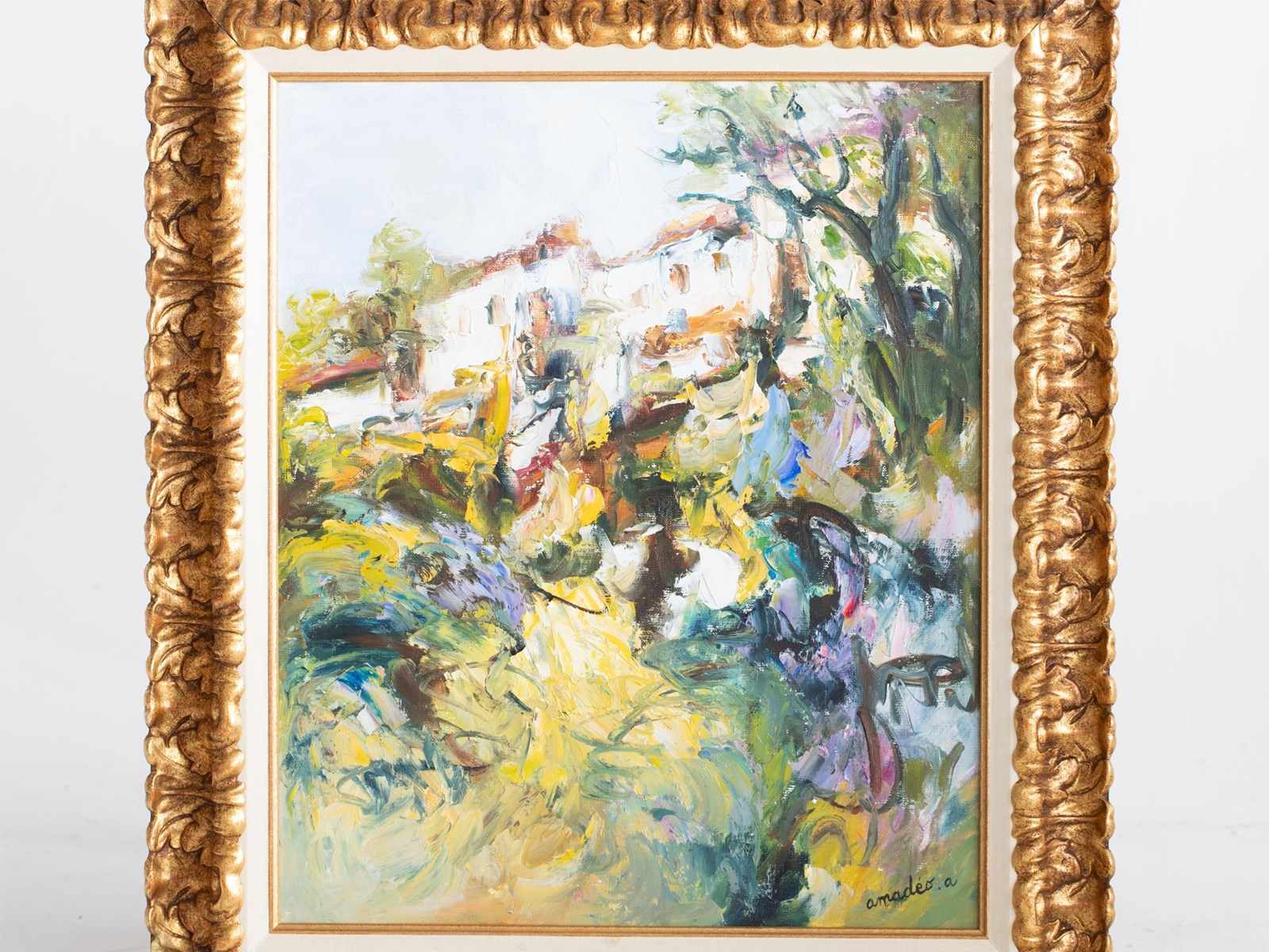A framed oil on canvas paysage aux toits rouge (landscape of red roofs). Signed Amadeo. A. French, 21st Century. Stock ref. #2798 In excellent order. 70.5 x 62 x 5 cm 27.8 x 24.4 x 2.0 "