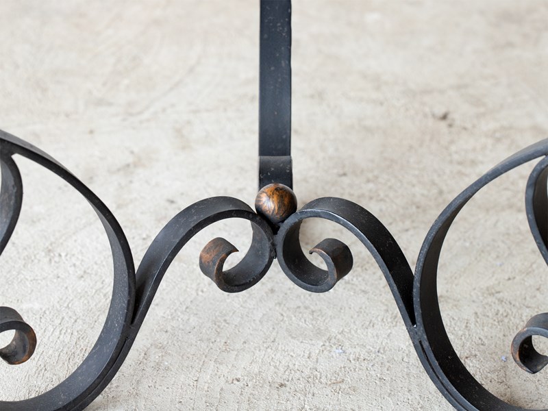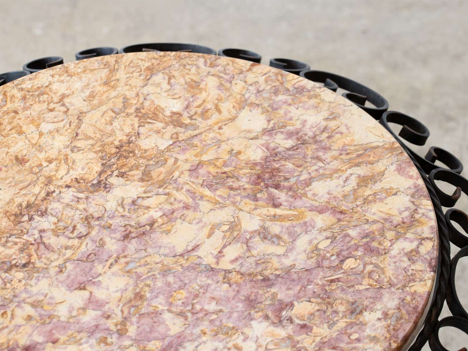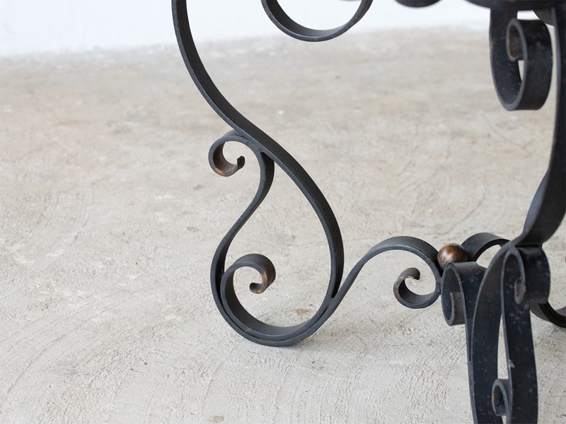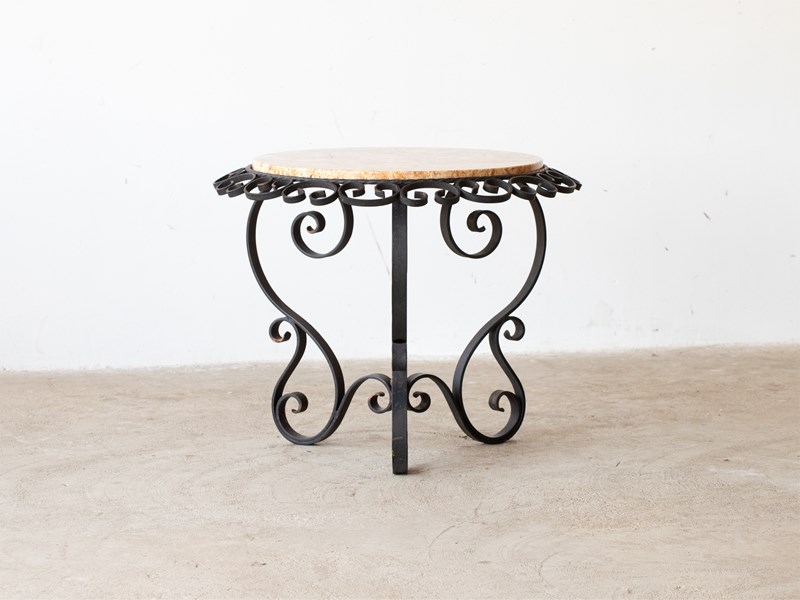 A marble and scrolled iron side table. French, c. 1950s.