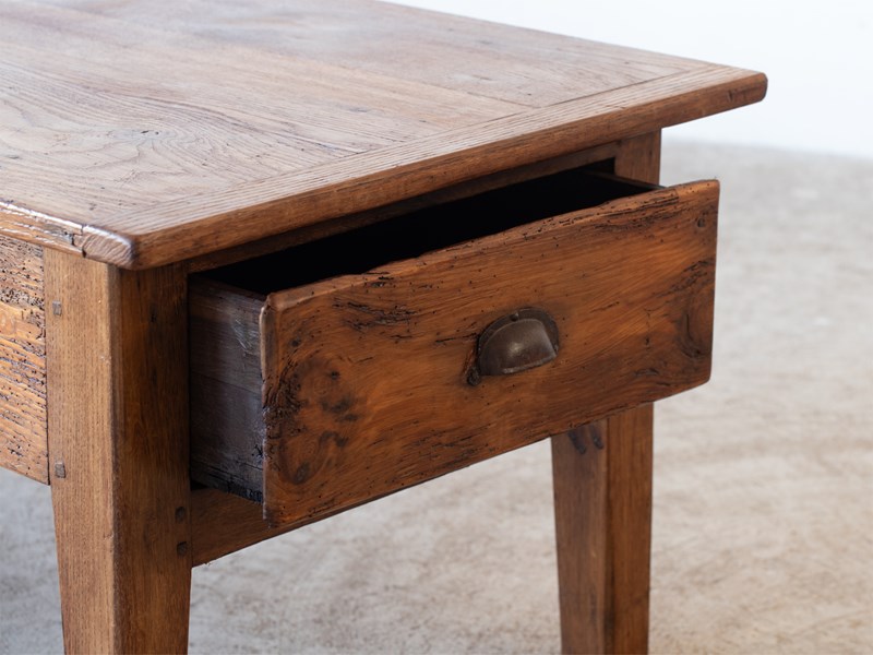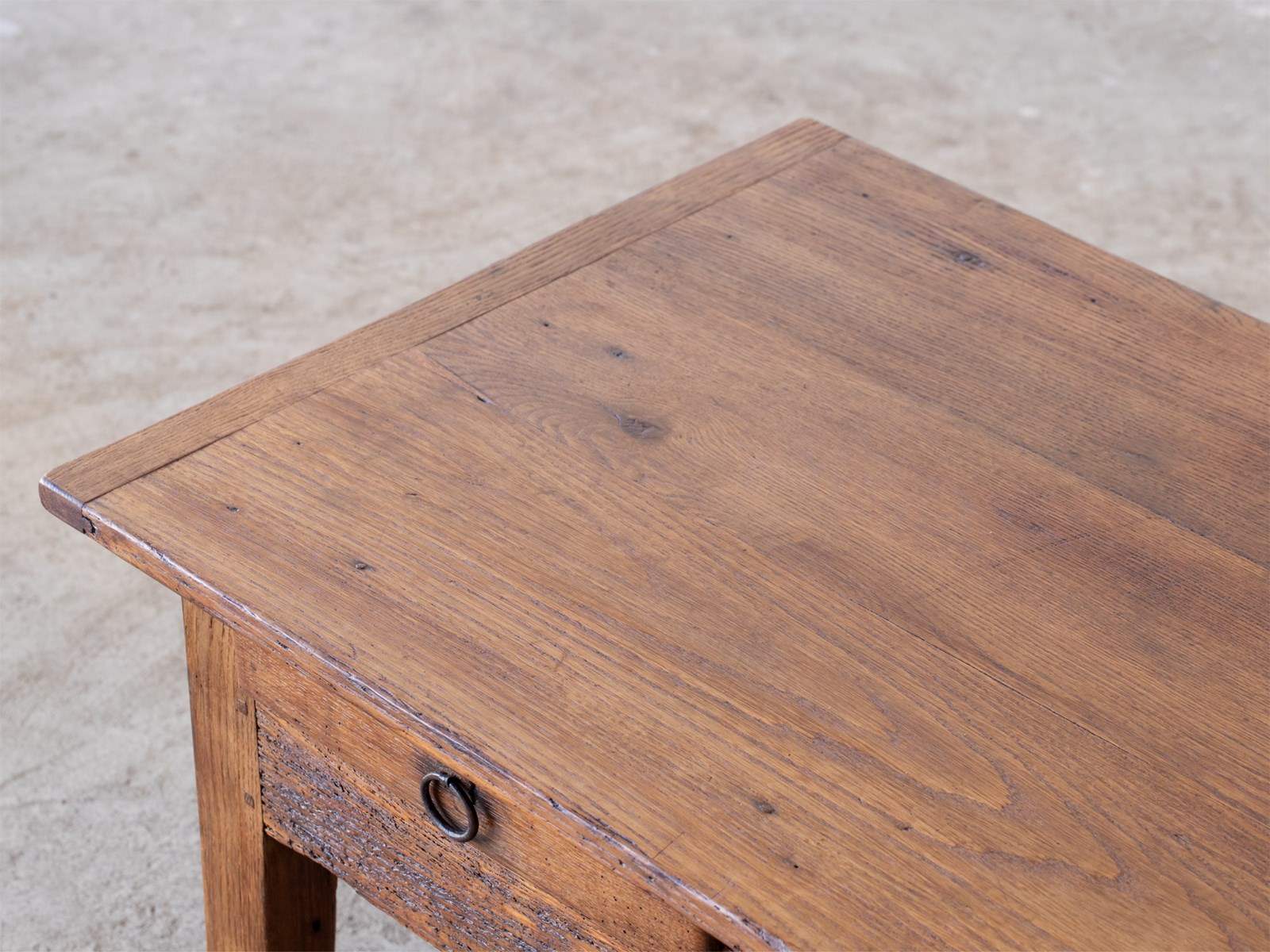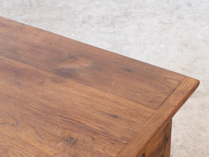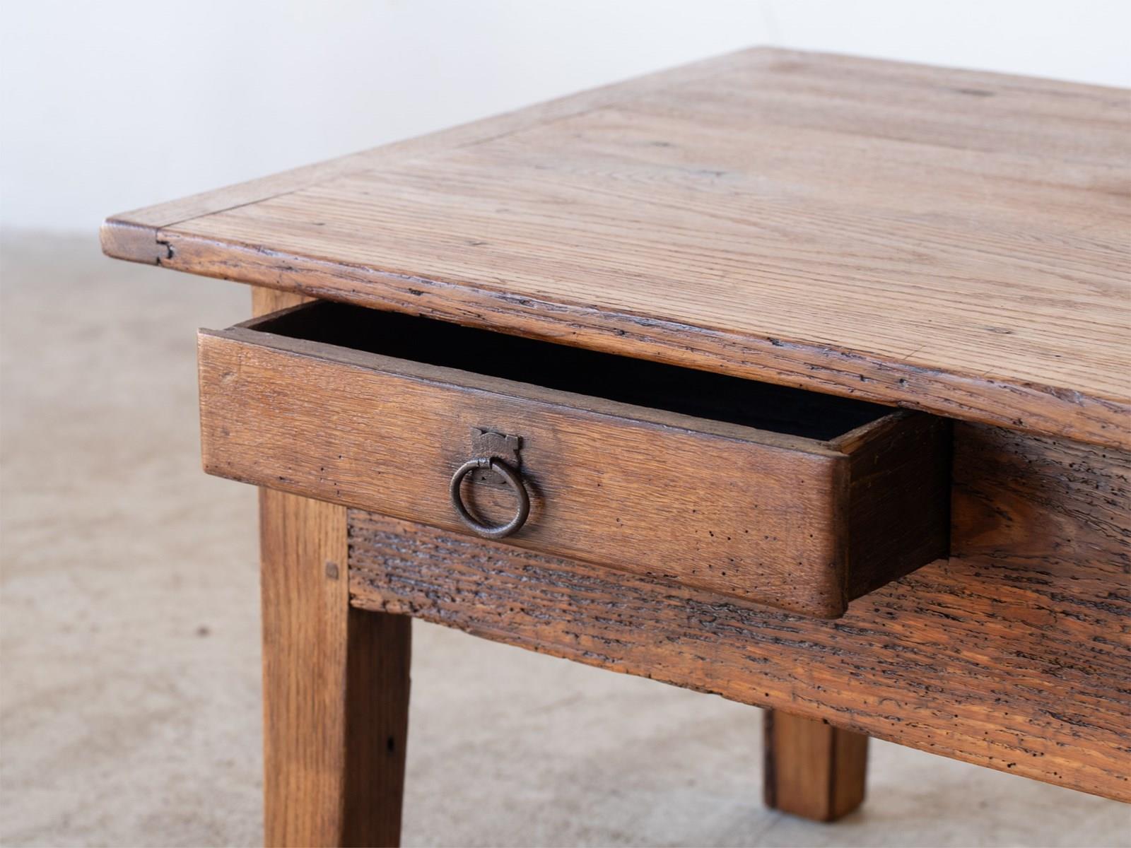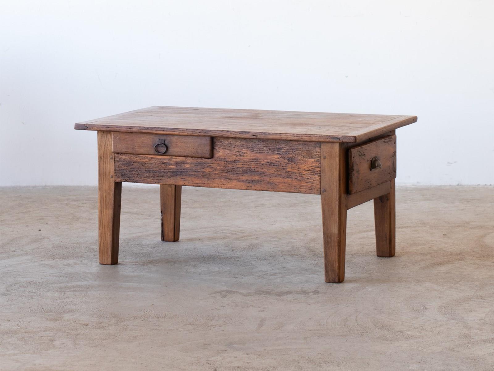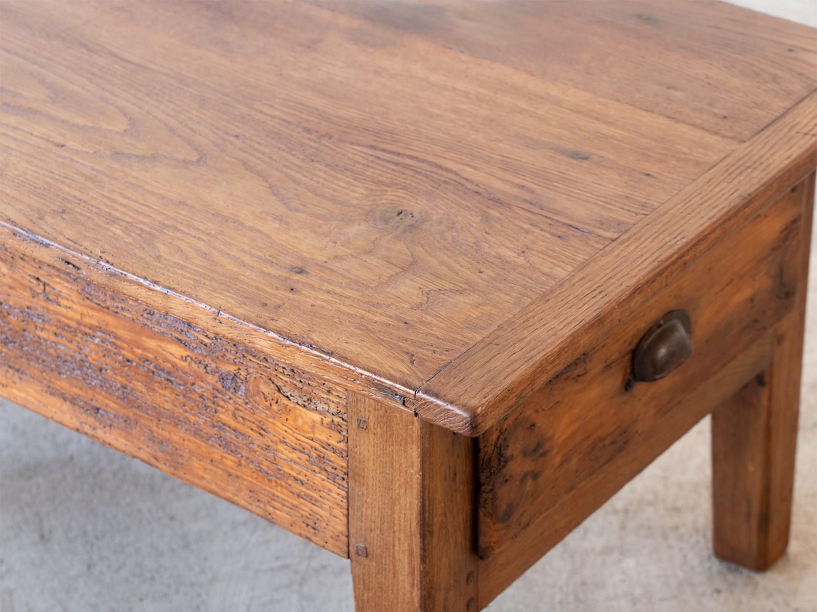 A rustic oak and pine coffee table adapted from a taller antique farmhouse table. French, 19C.