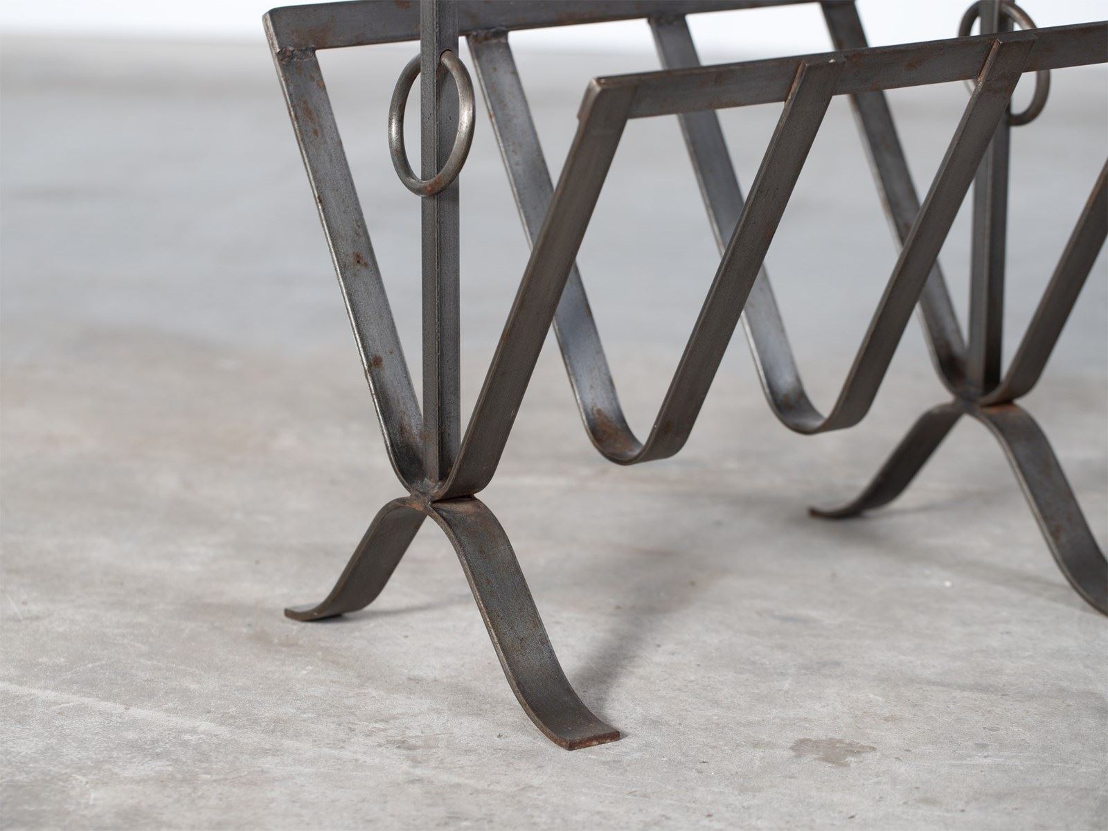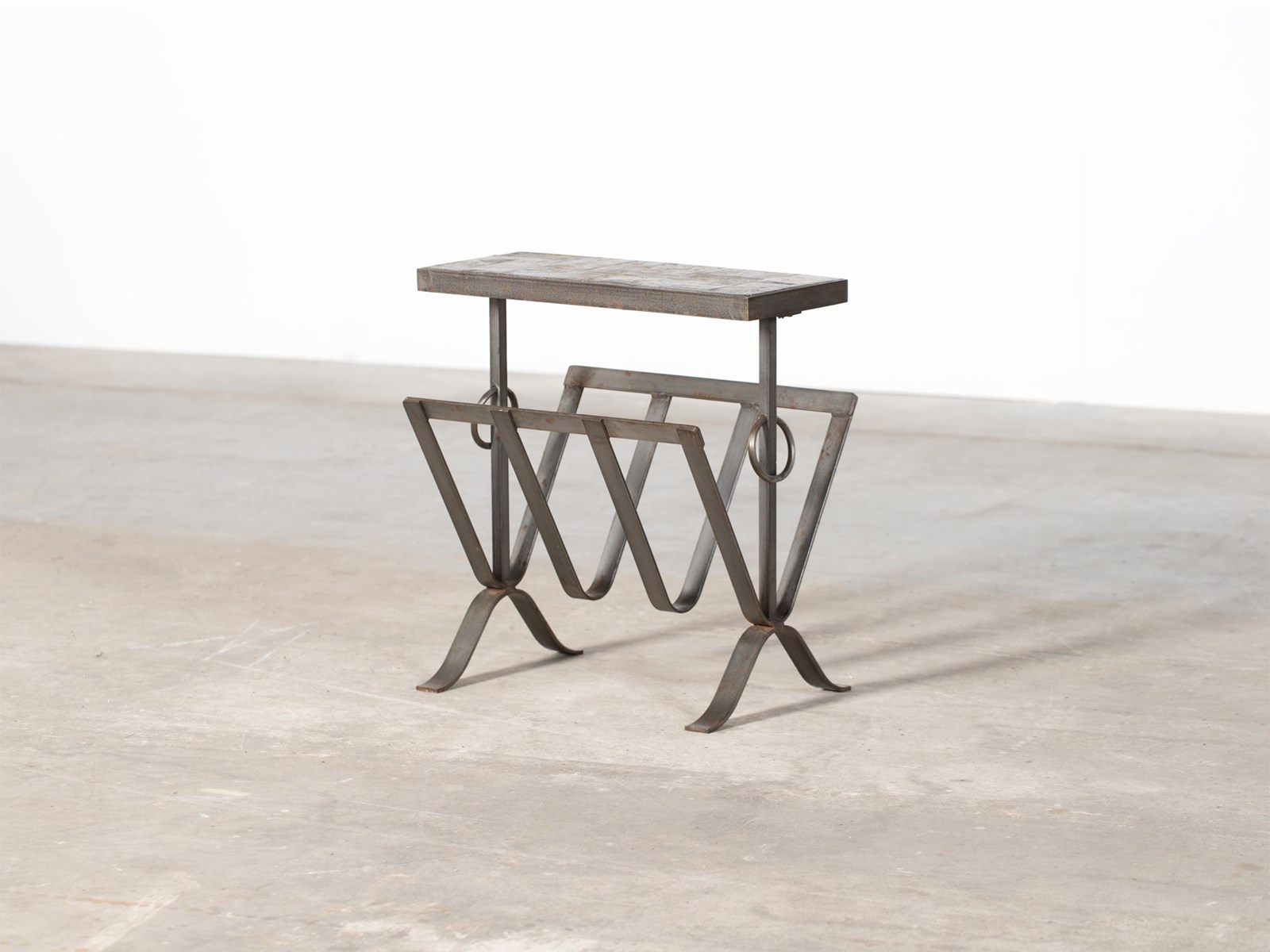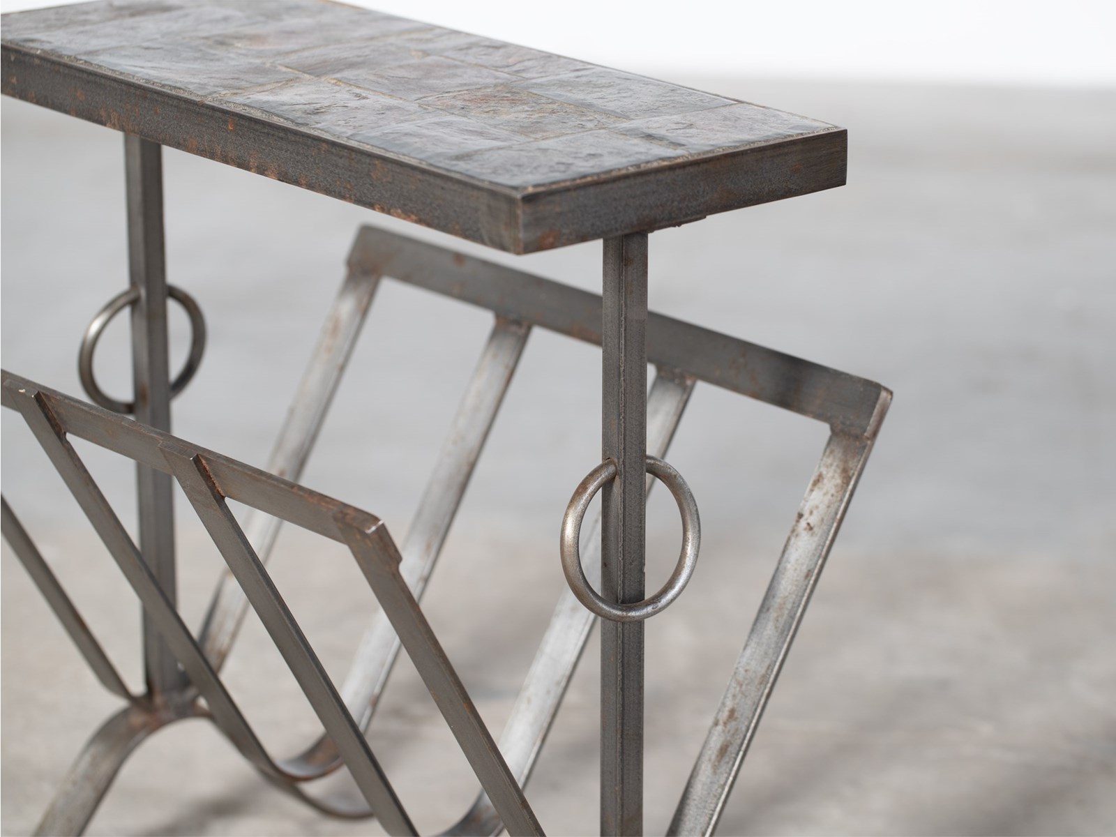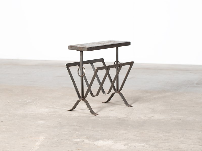 A slate and iron magazine rack with integrated table attributed to Jean-Pierre Ryckeart. French, mid 20C.