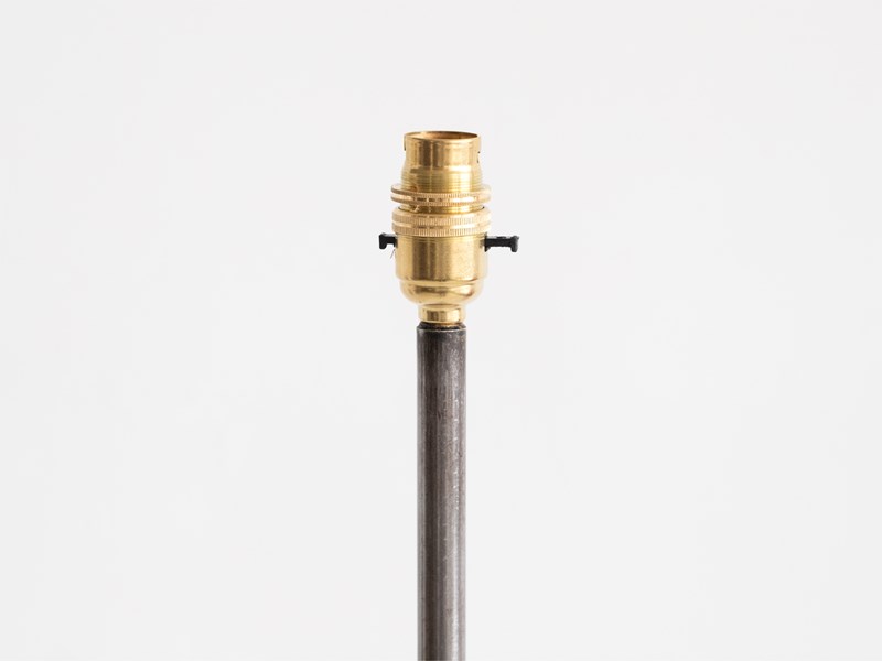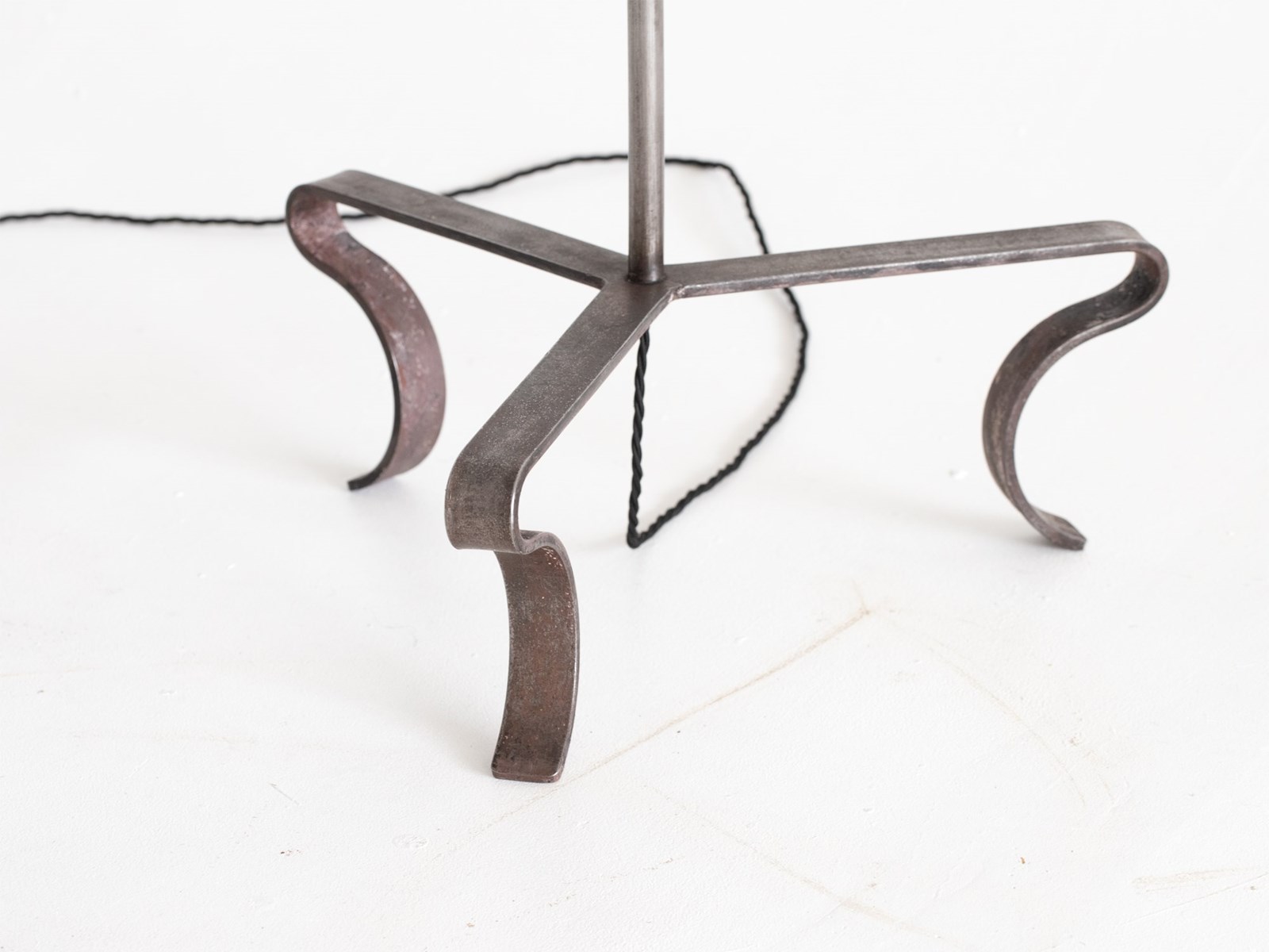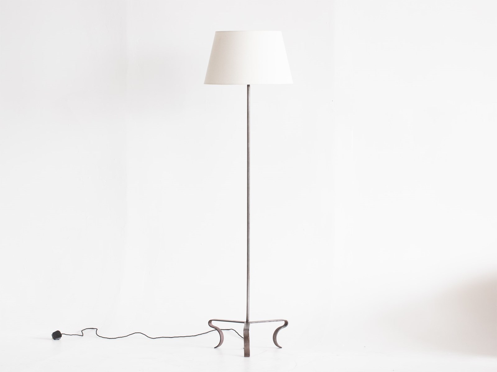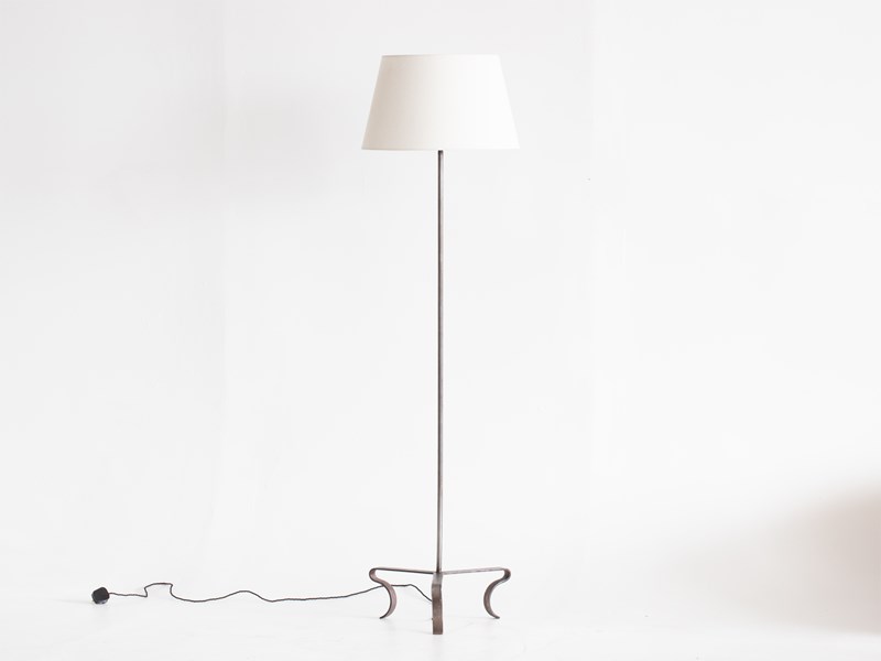 A steel floor lamp with shapely tripod base. French, mid 20C.