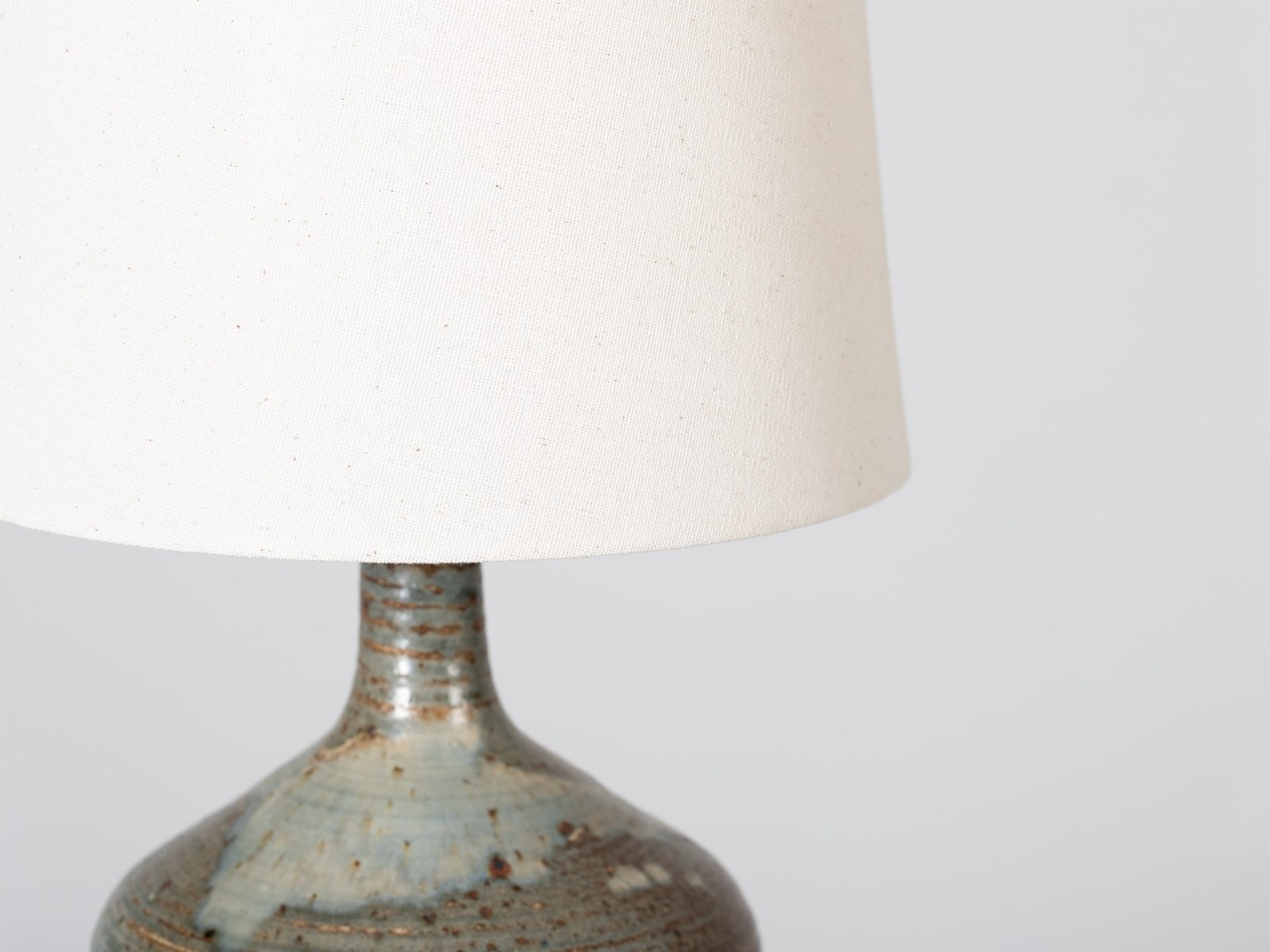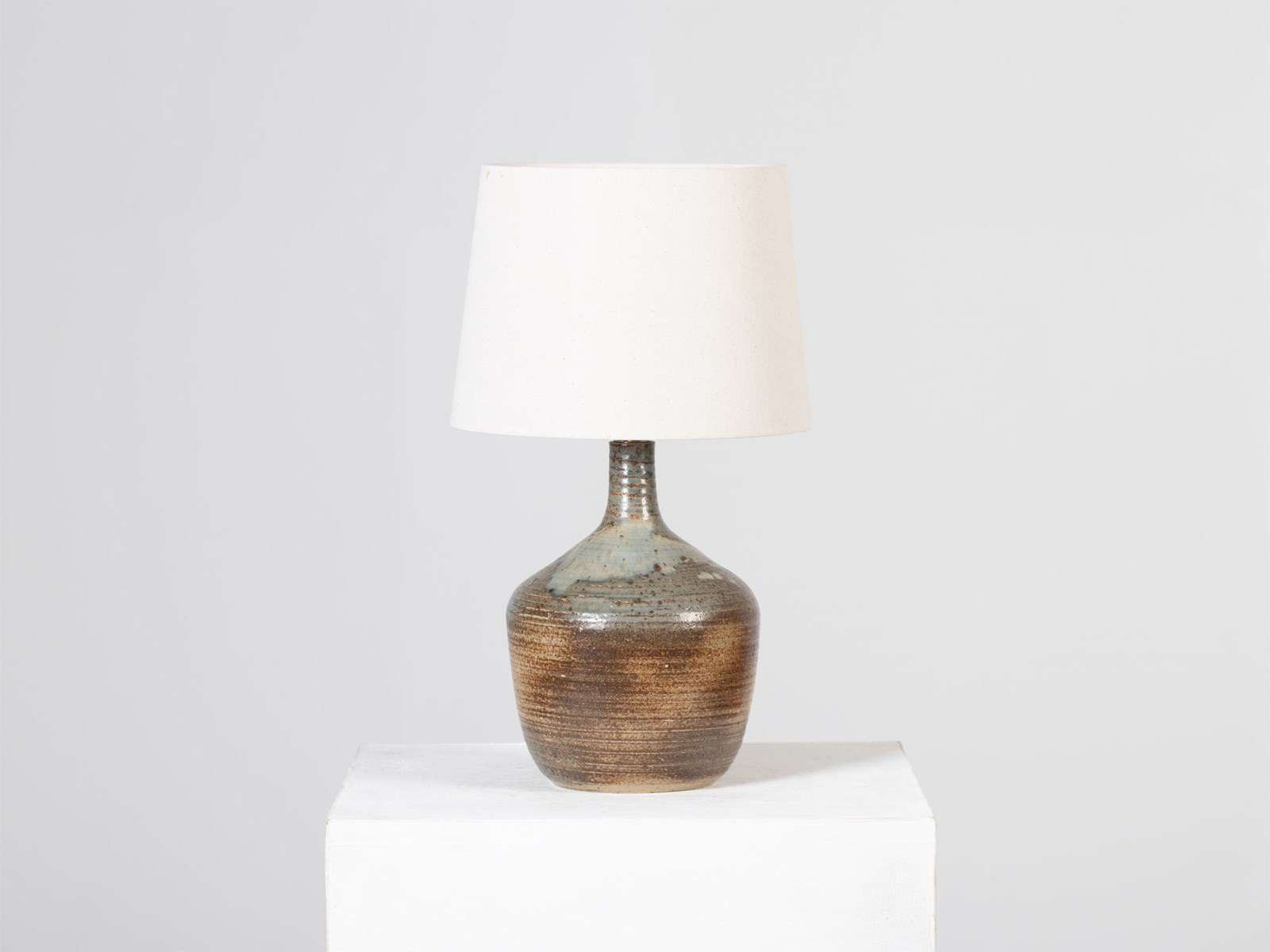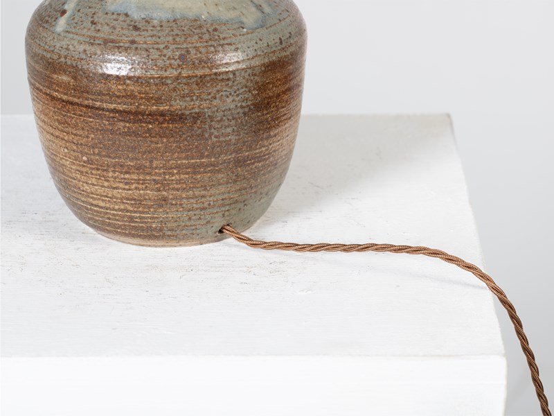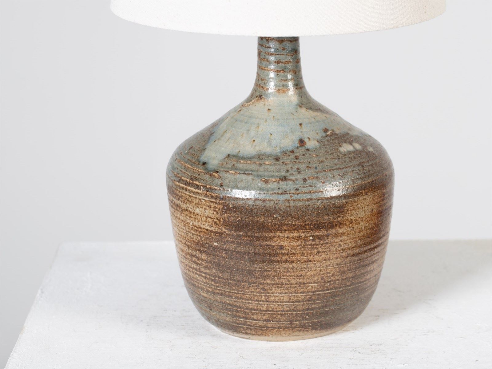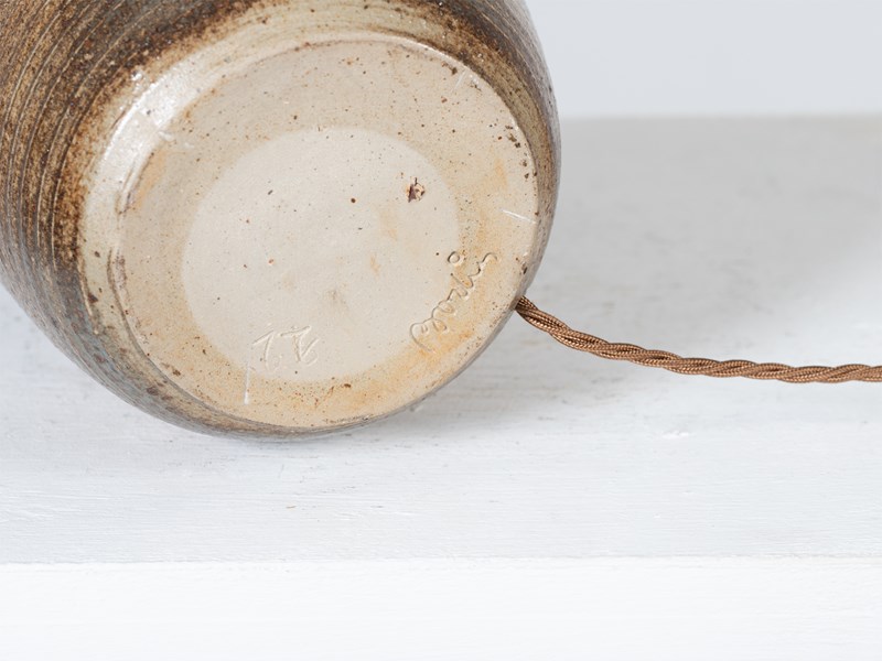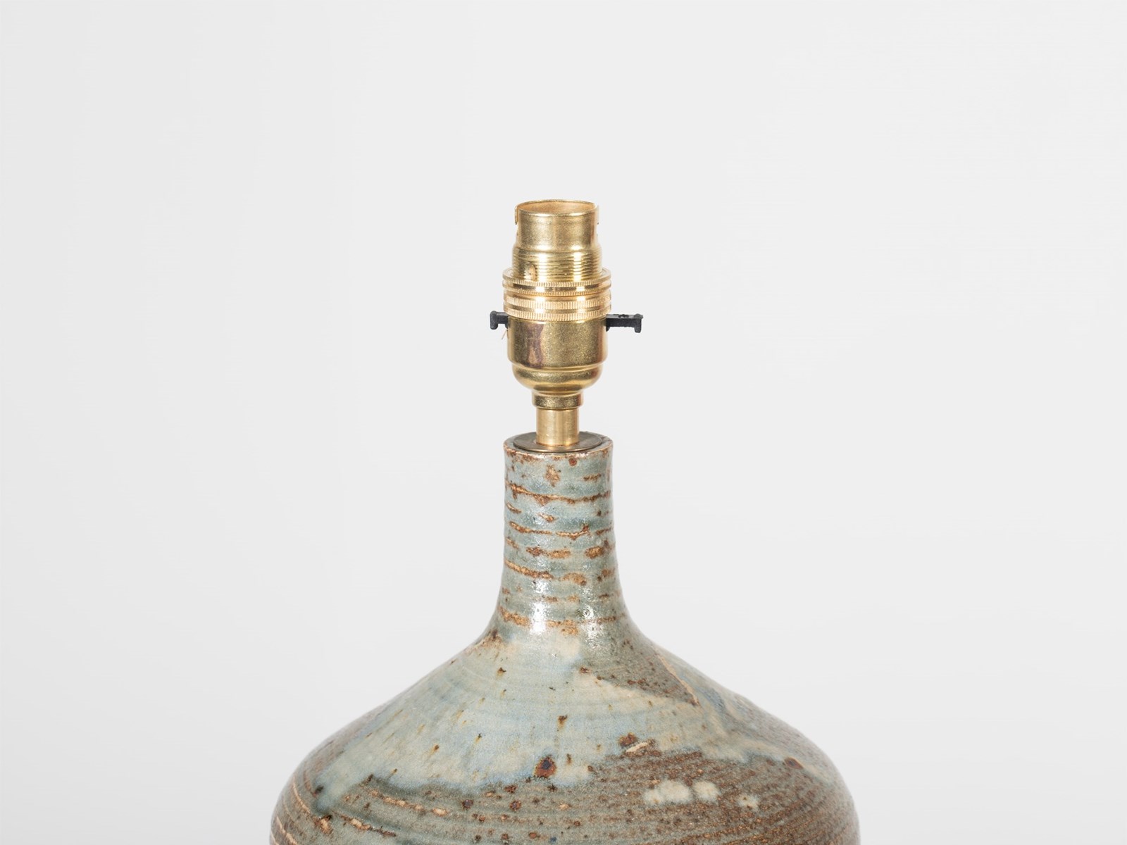 A studio pottery stoneware table lamp with partial blue glaze. Signed to the base. French, c. 1970.