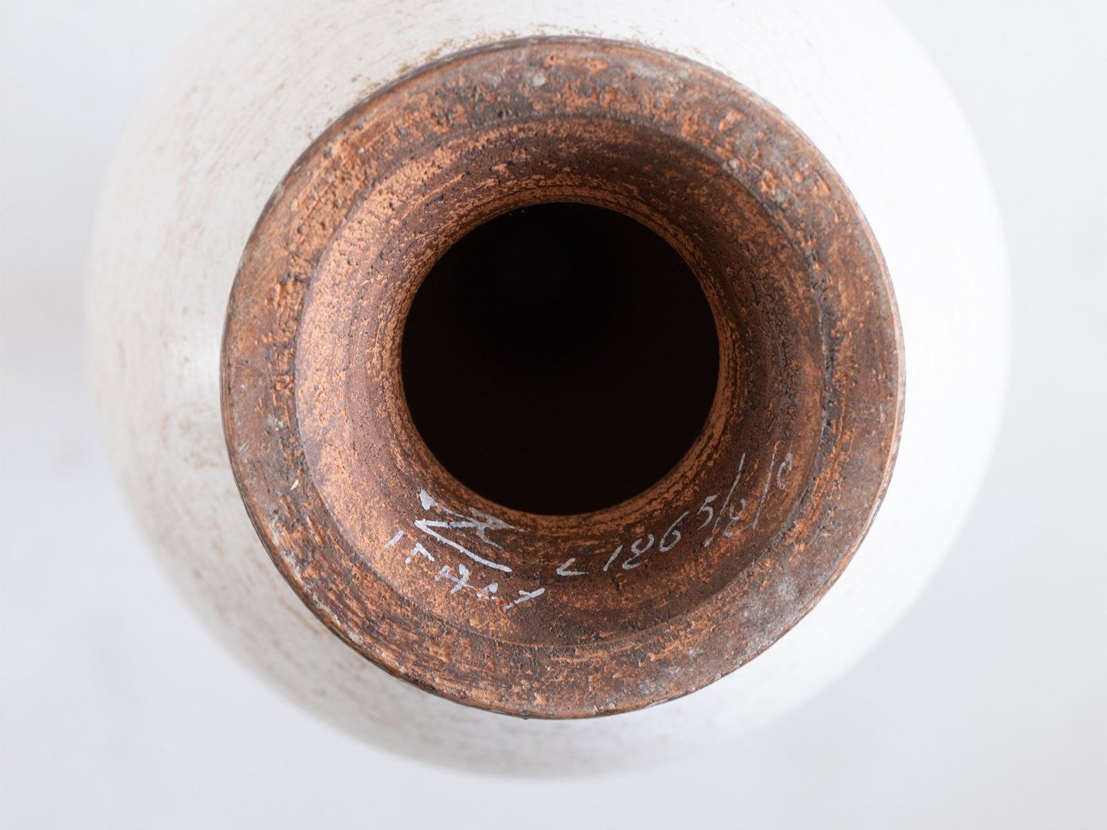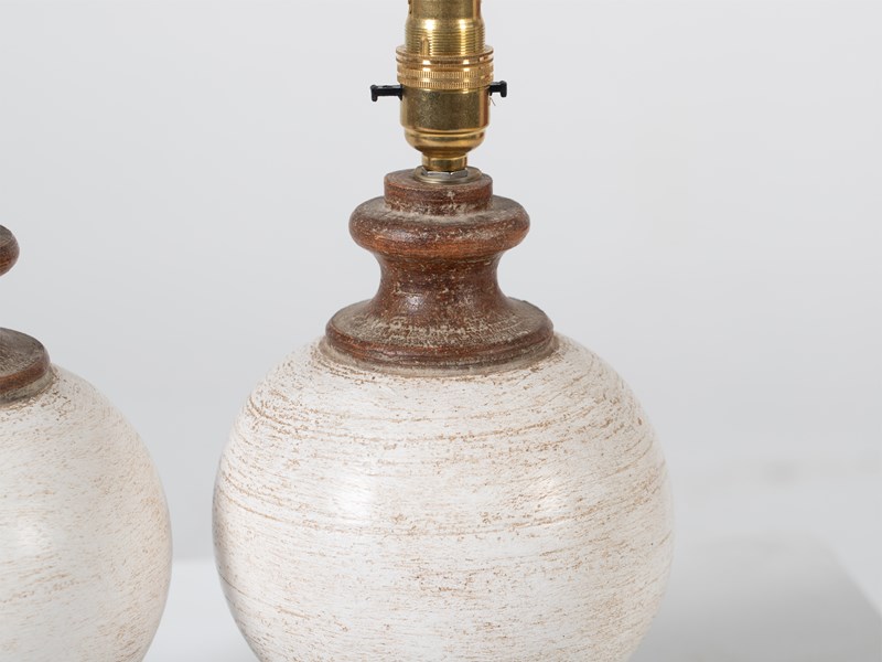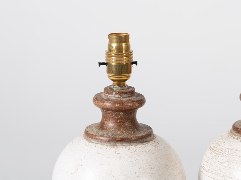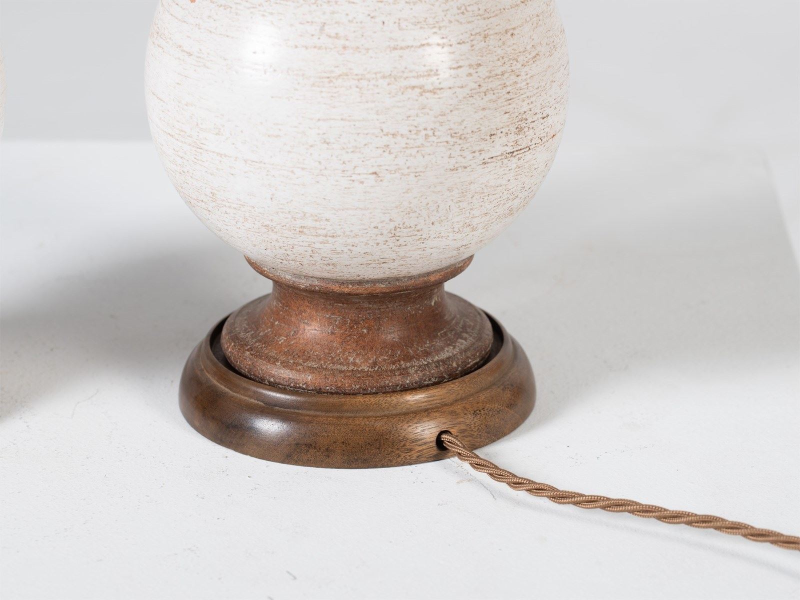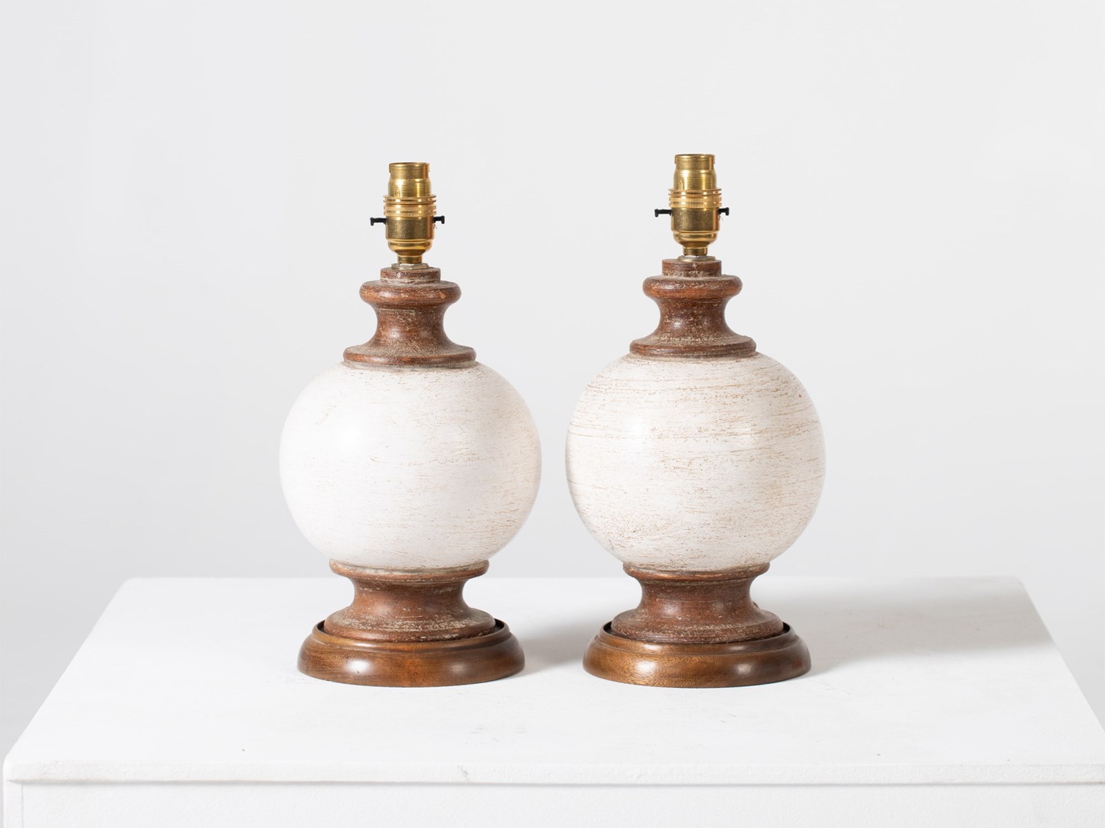 A pair of painted terracotta table lamps on turned walnut plinths. Italian, c. 1960s.