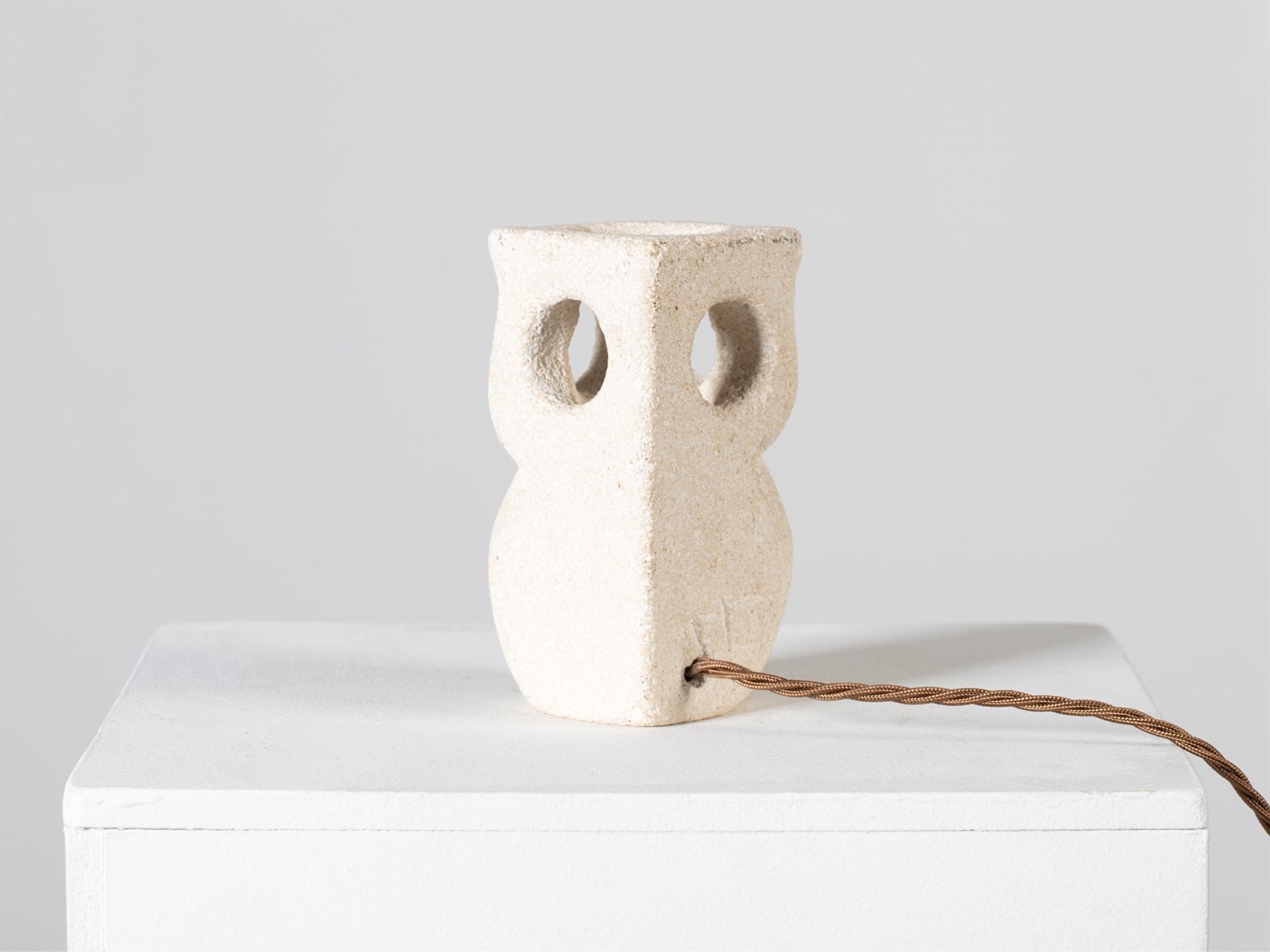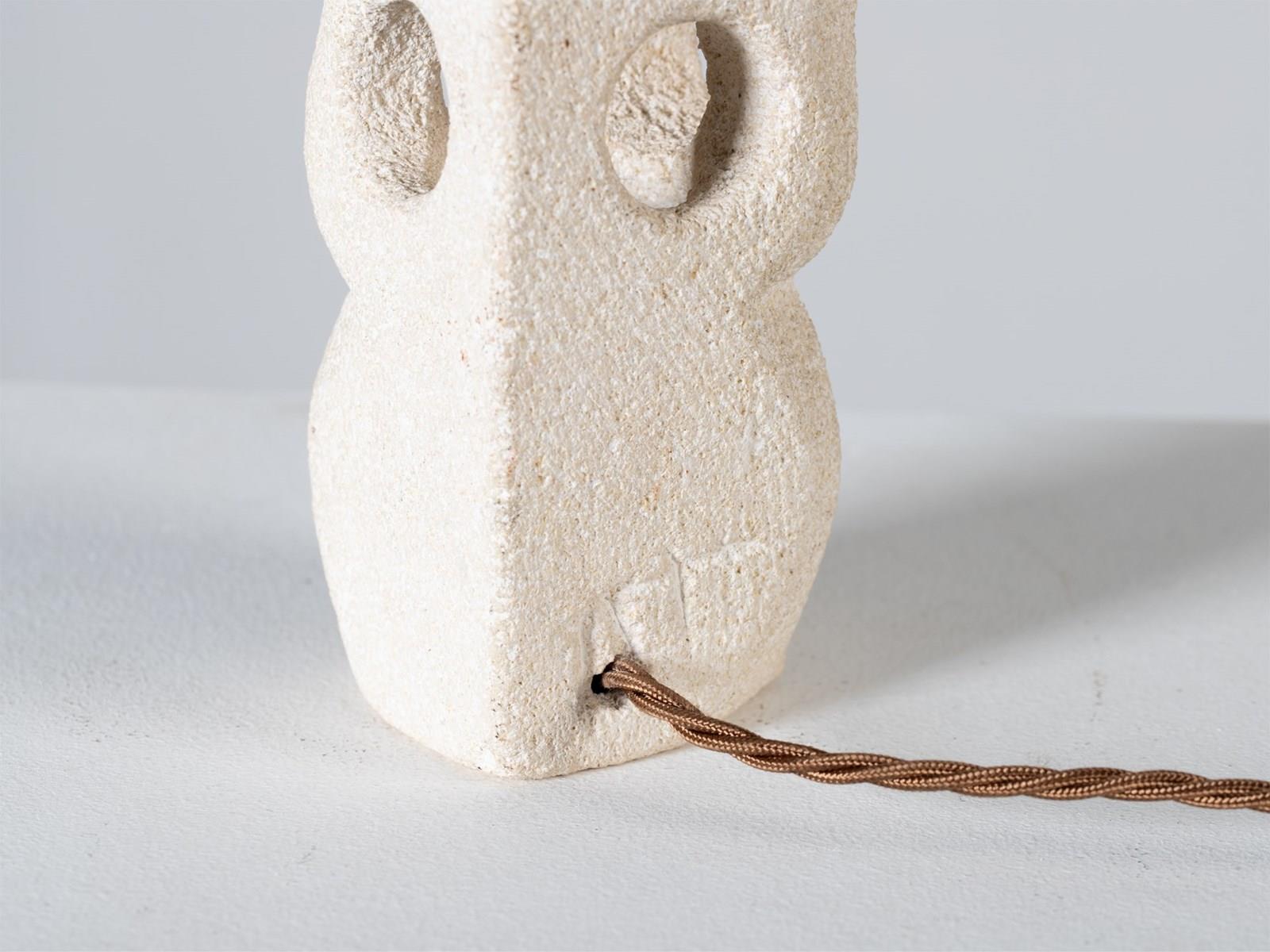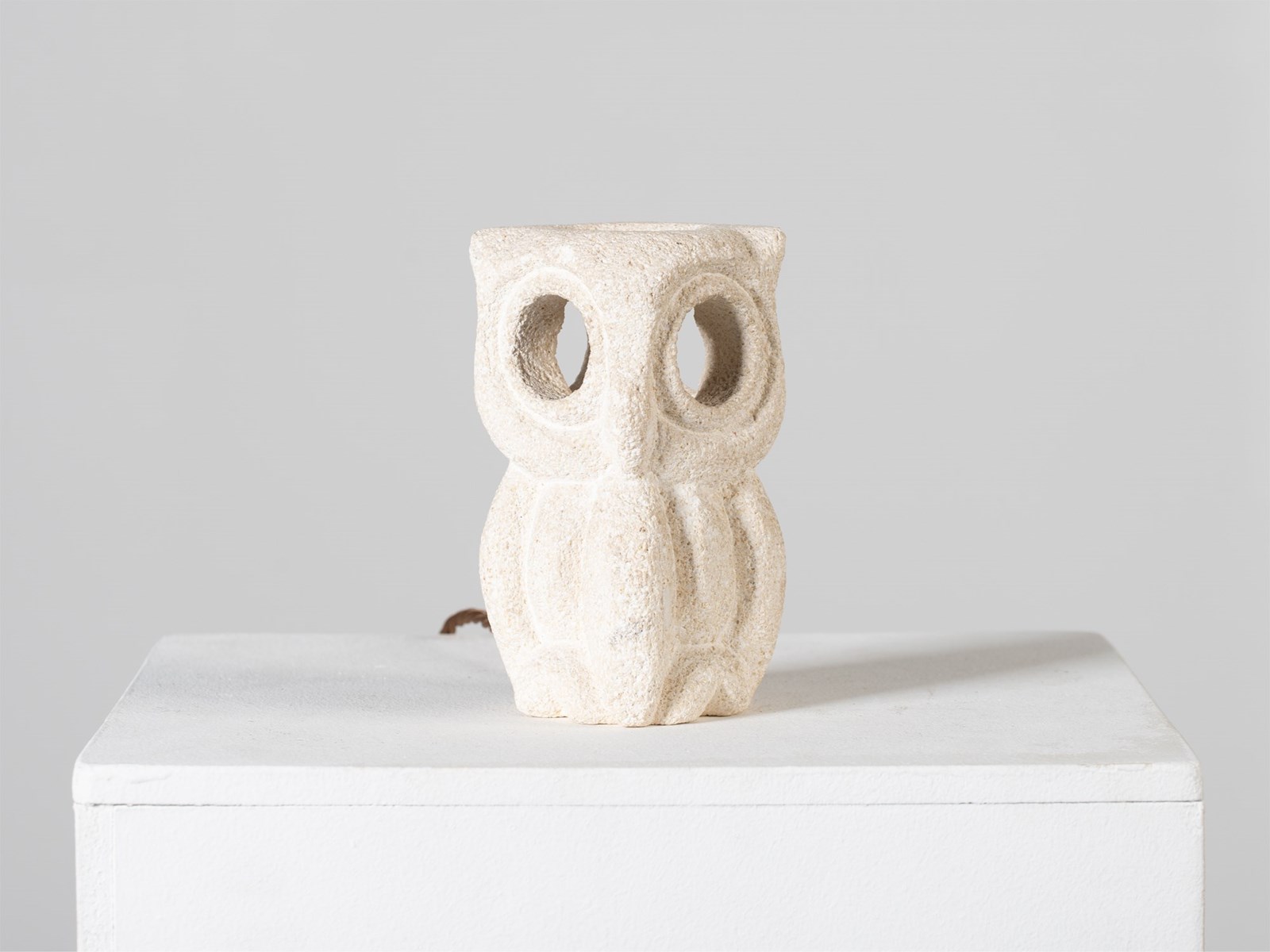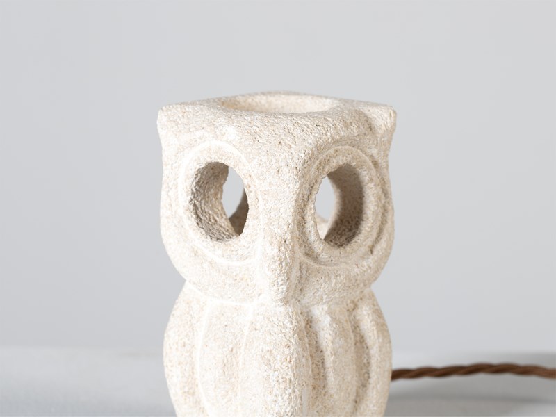 A diminutive carved limestone owl table lamp by Albert Tormos. Signed toward the base. French, c. 1970s.