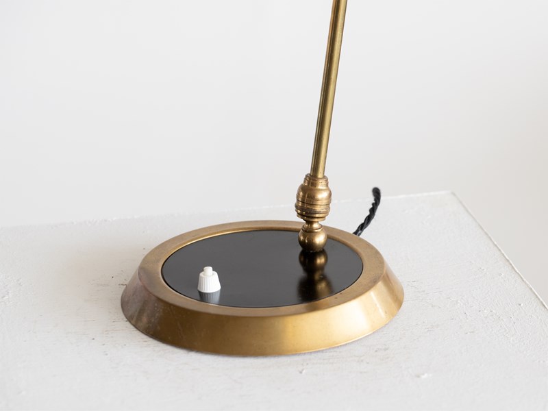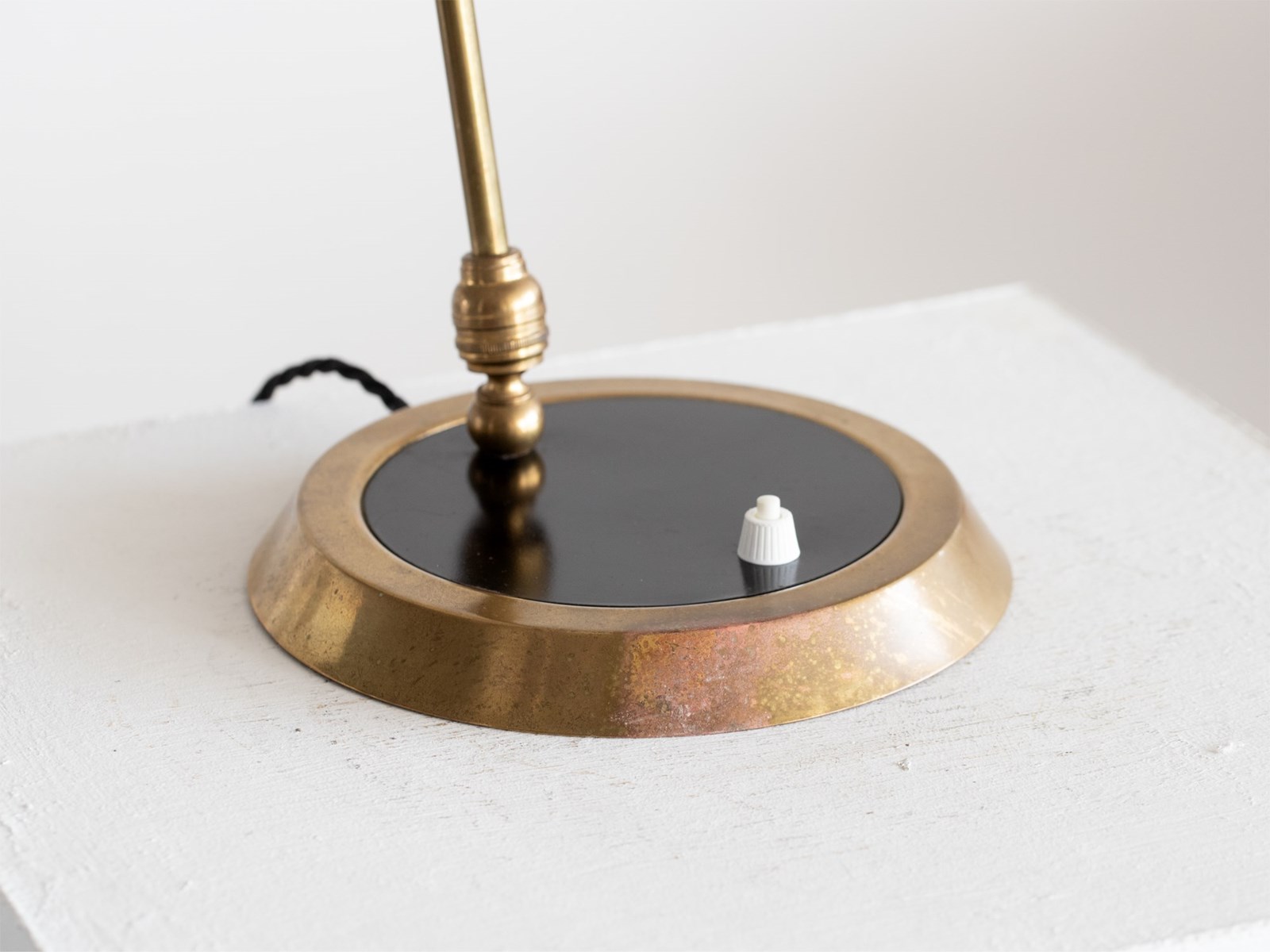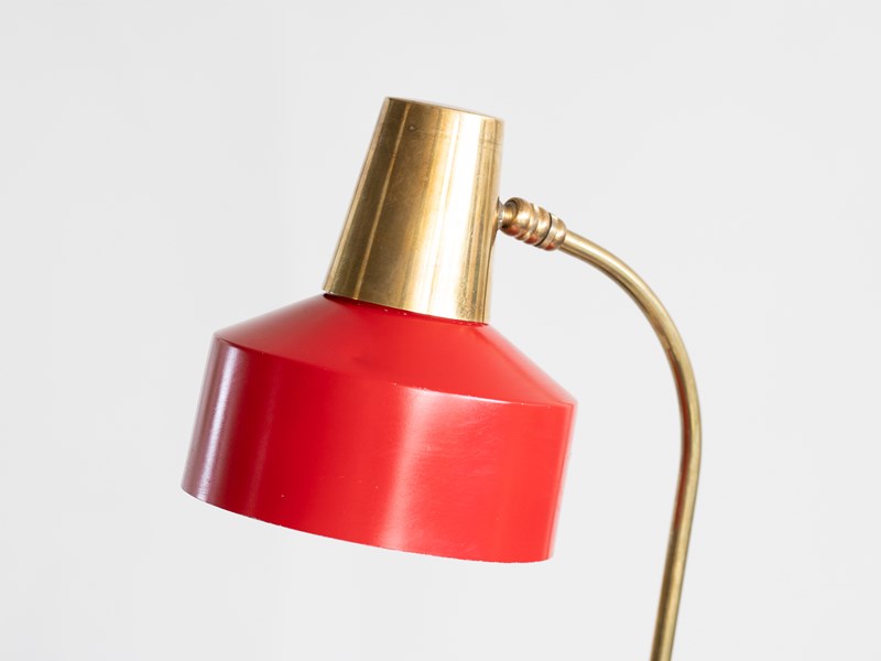An adjustable brass desk lamp with red enamel shade, c. 1950s.