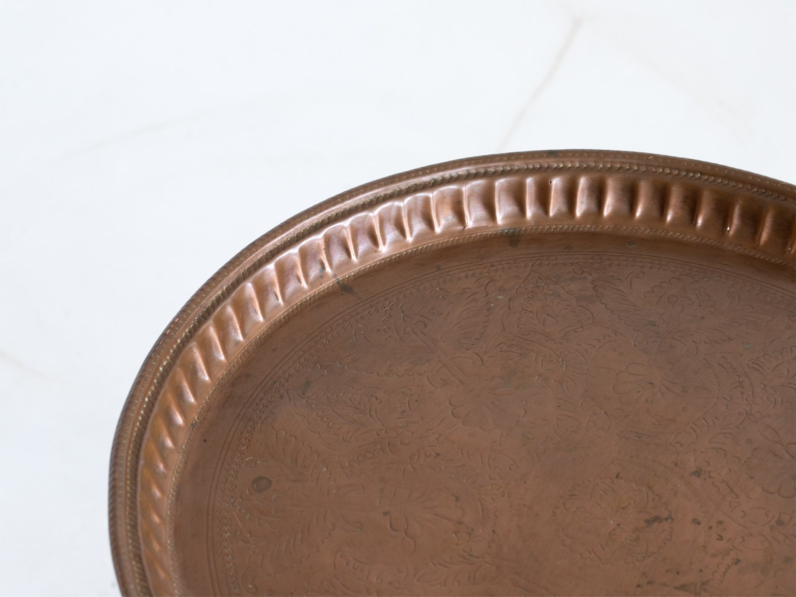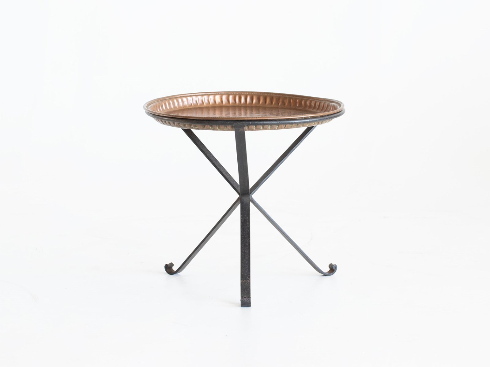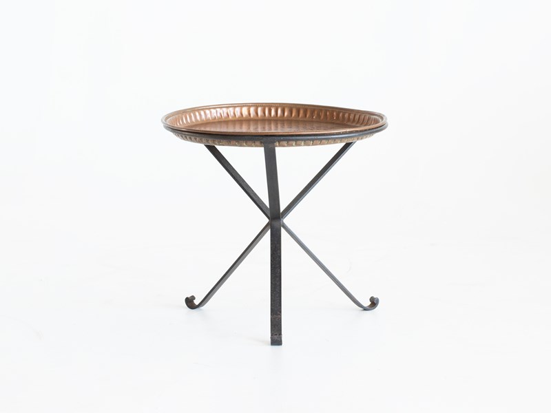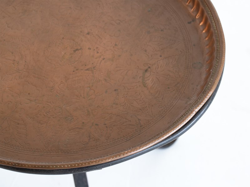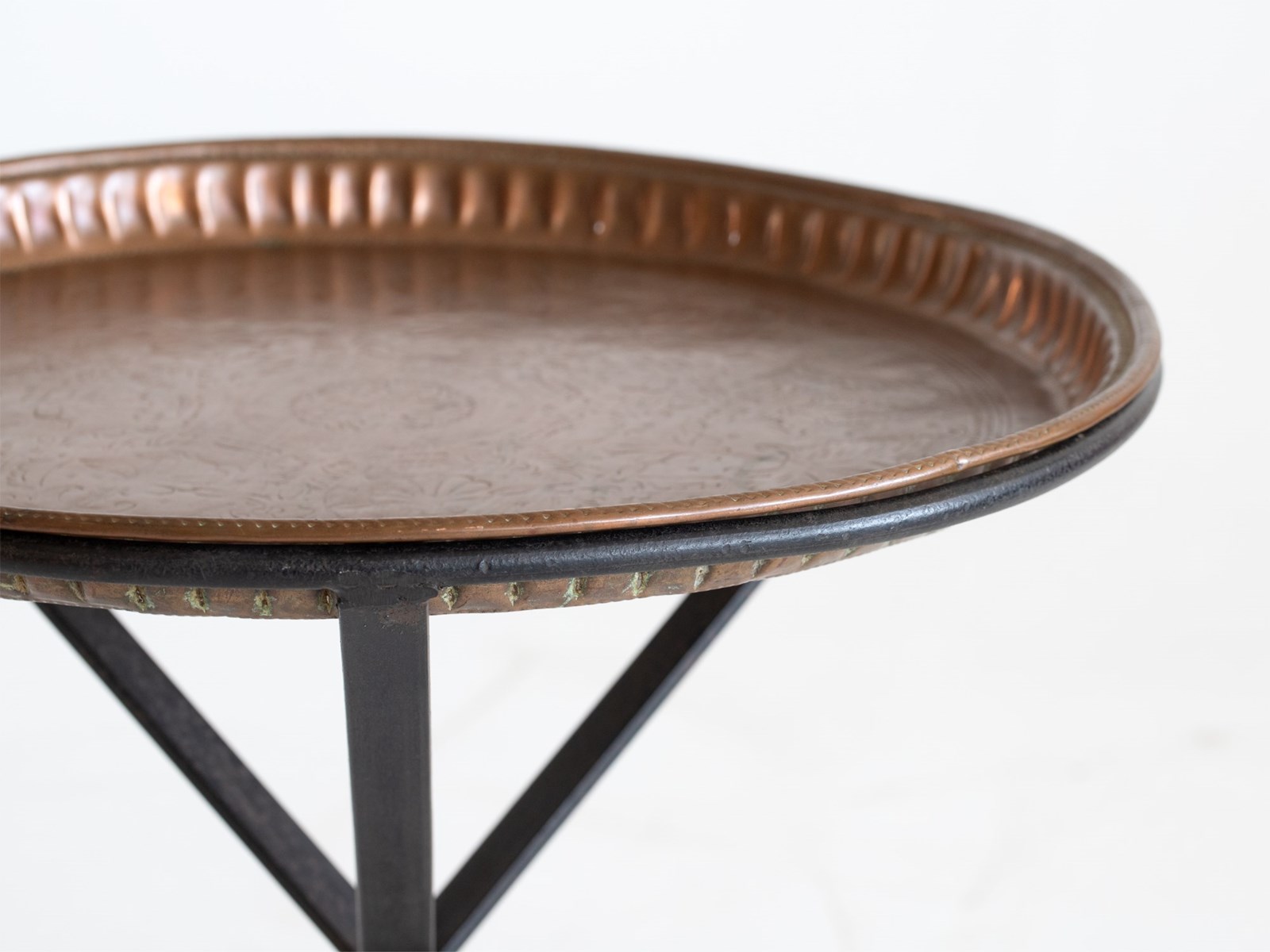 A moorish tooled copper tray table on wrought iron stand, mid 20C. Stock ref. #2945 In good sturdy order with age-commensurate wear. 46 x 50 x 50 cm 18.1 x 19.7 x 19.7 "