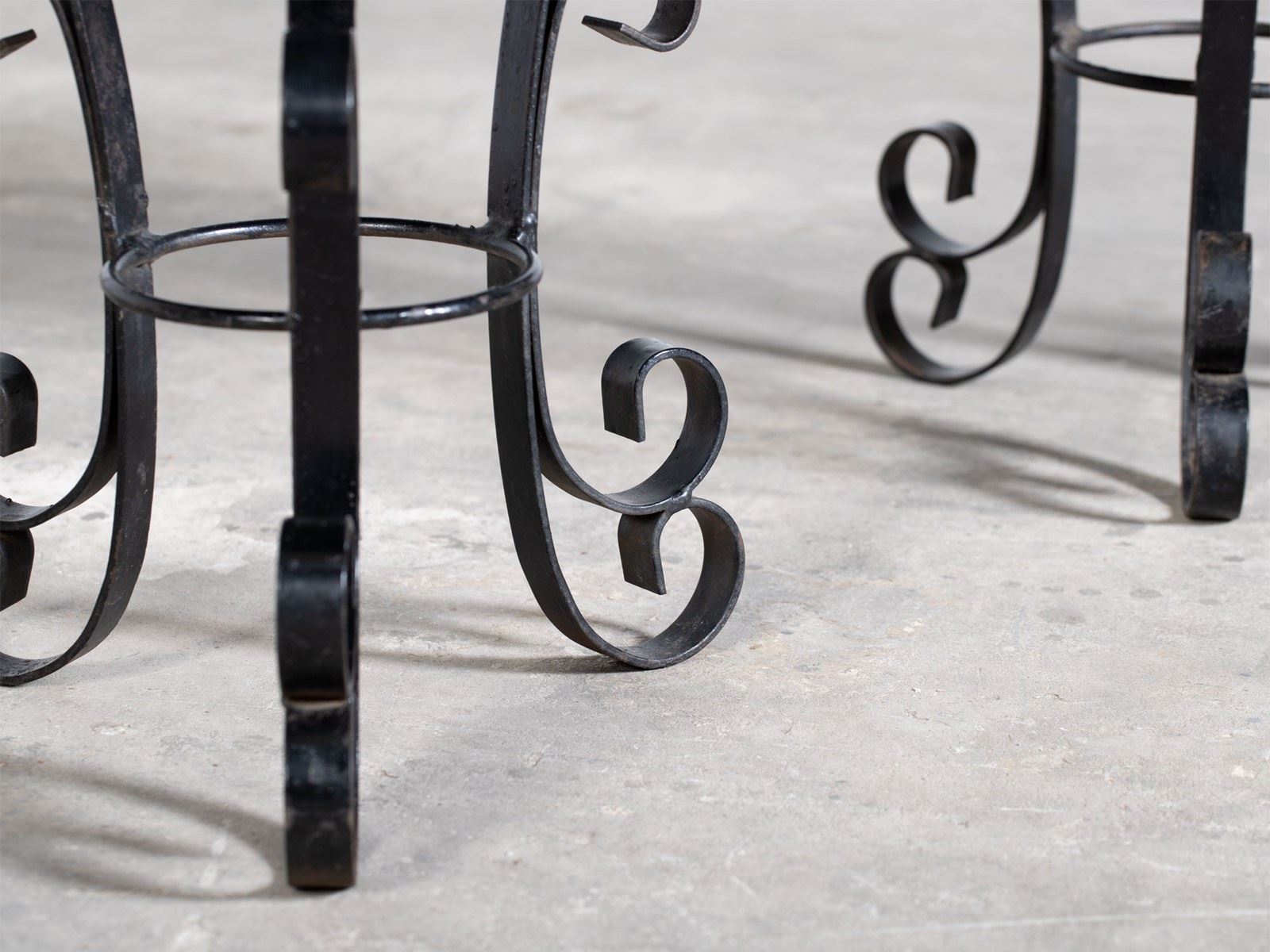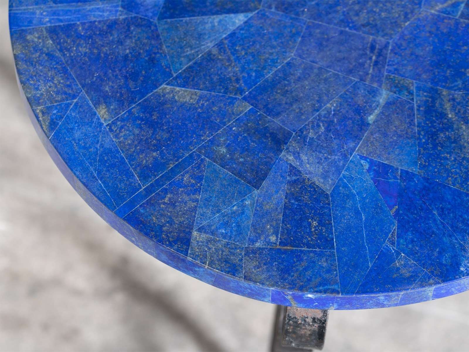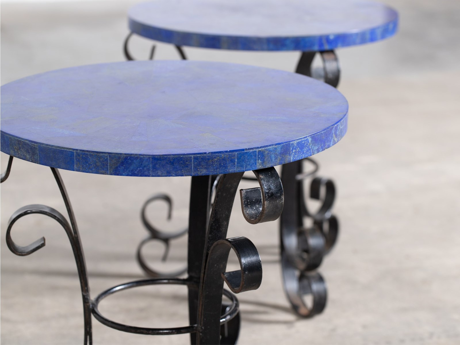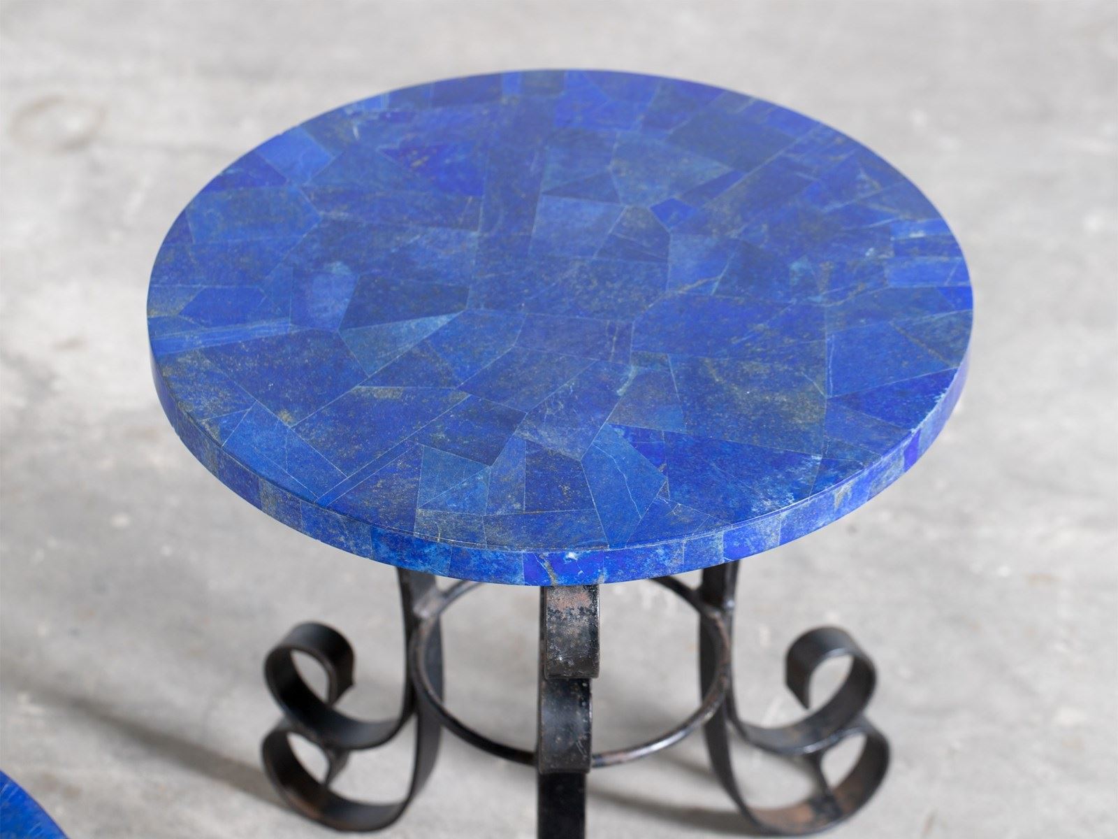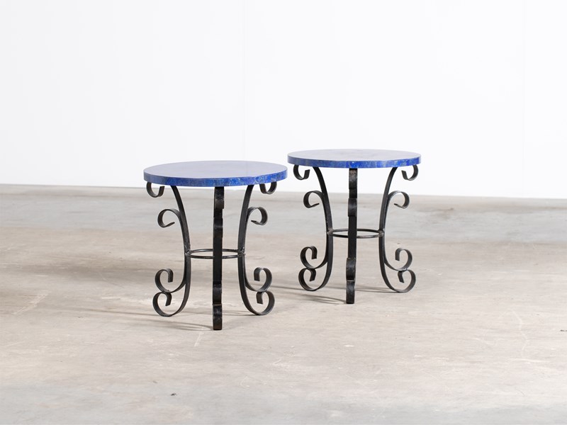 A pair of wrought iron side tables with mosaic lapis lazuli gemstone tops, mid 20C.