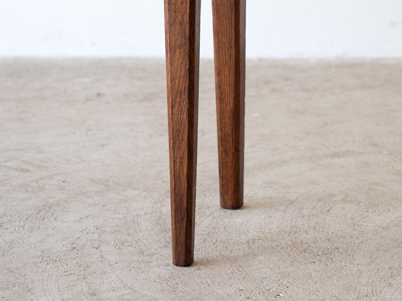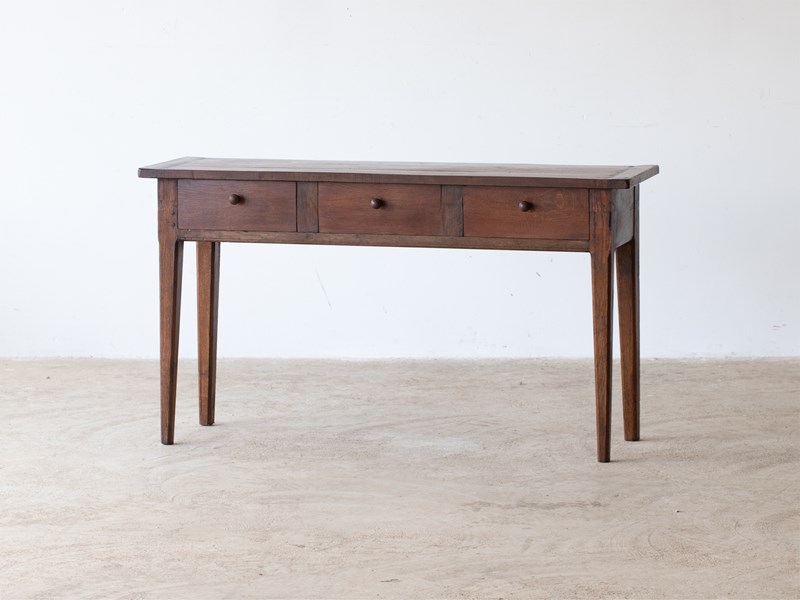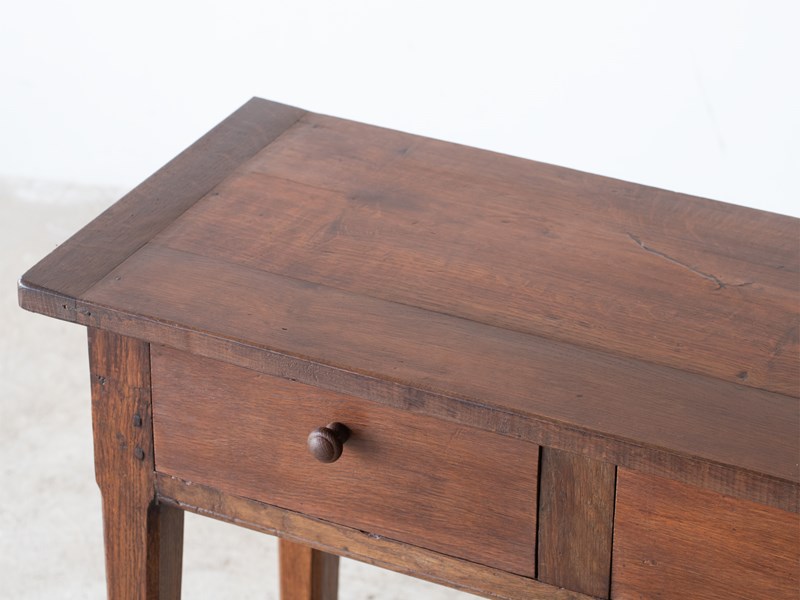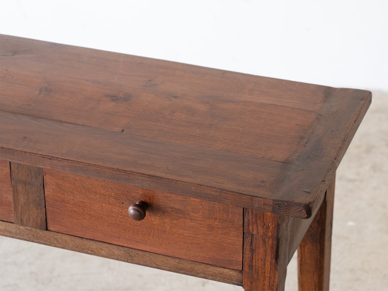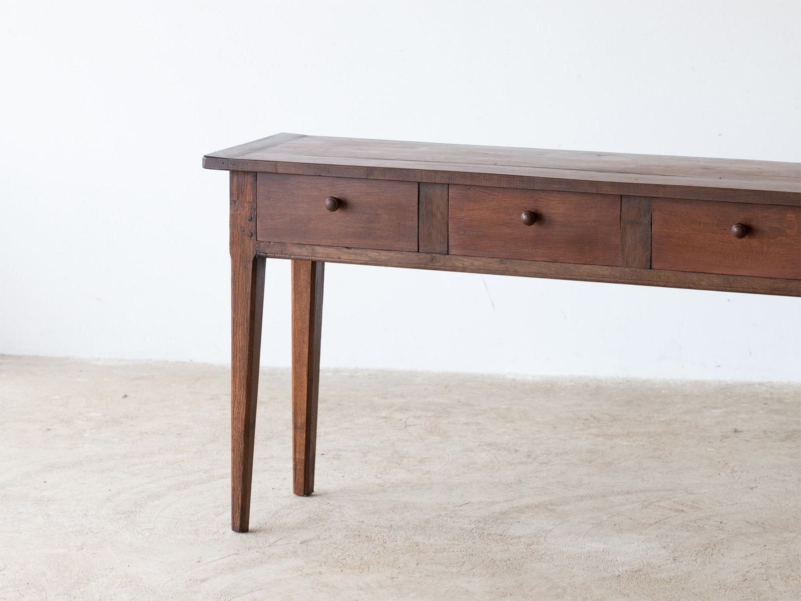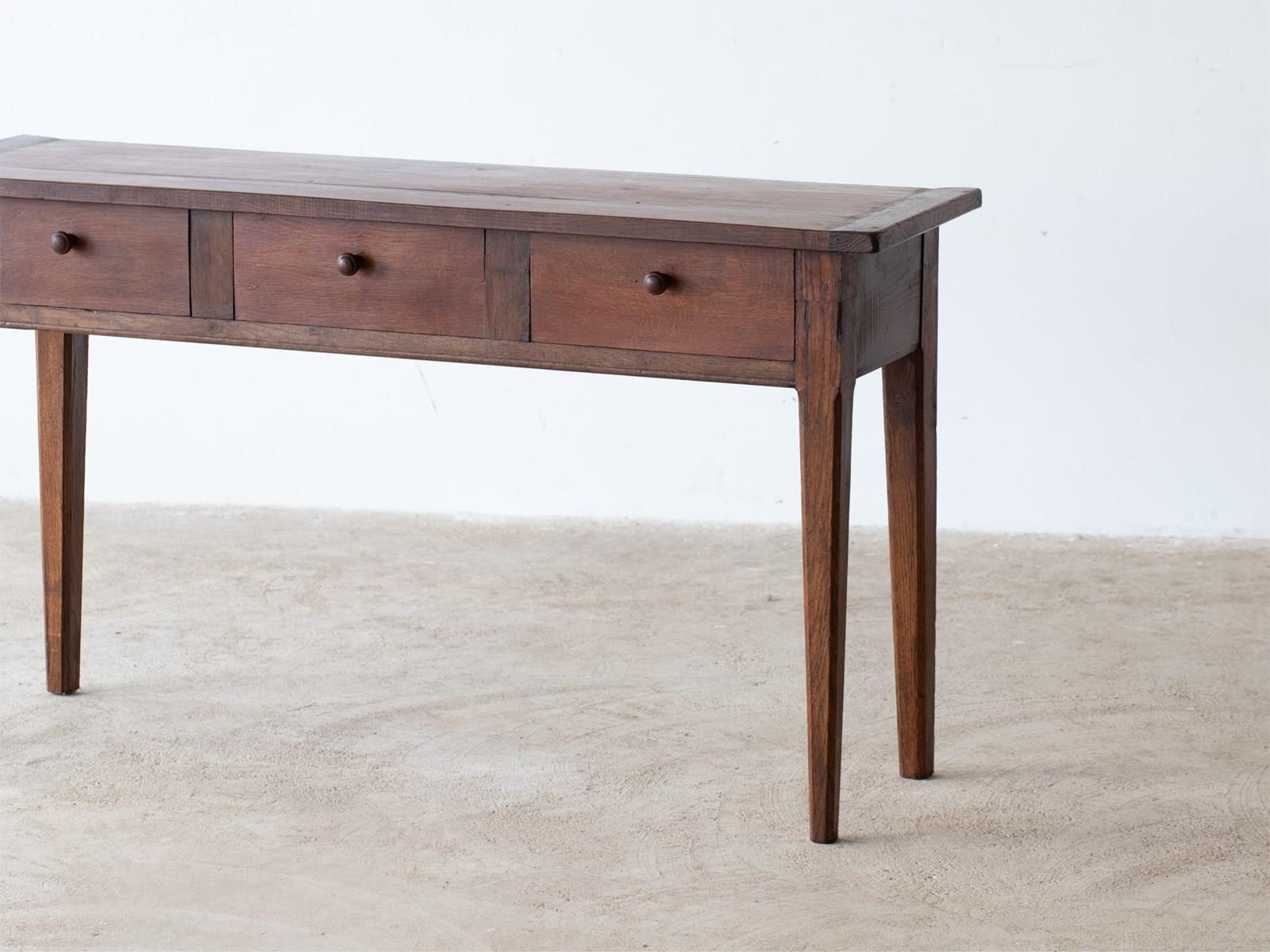A three-drawer oak serving table or console adapted from a larger antique French table.