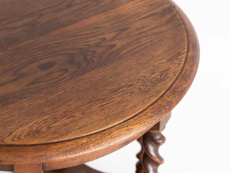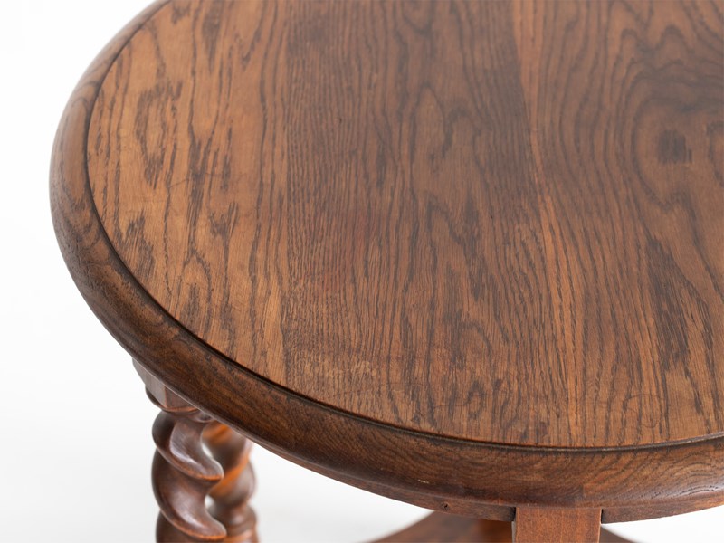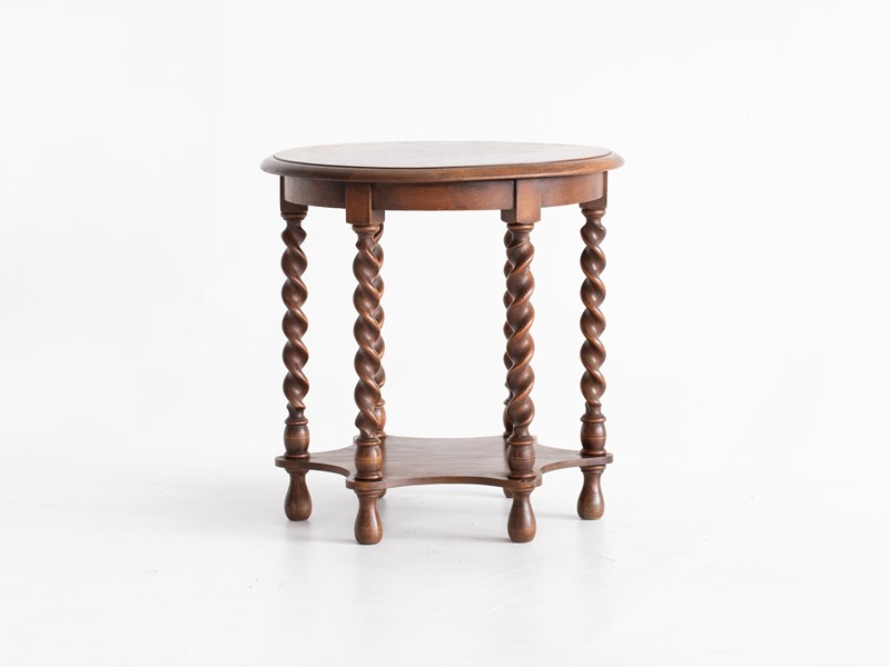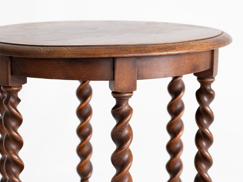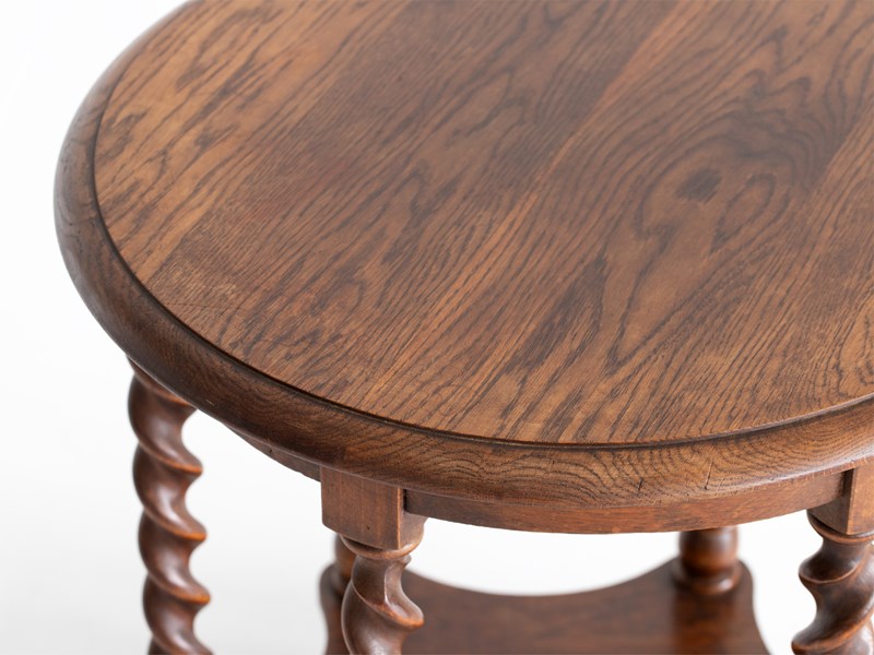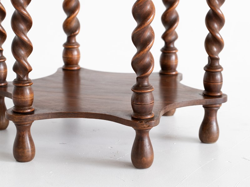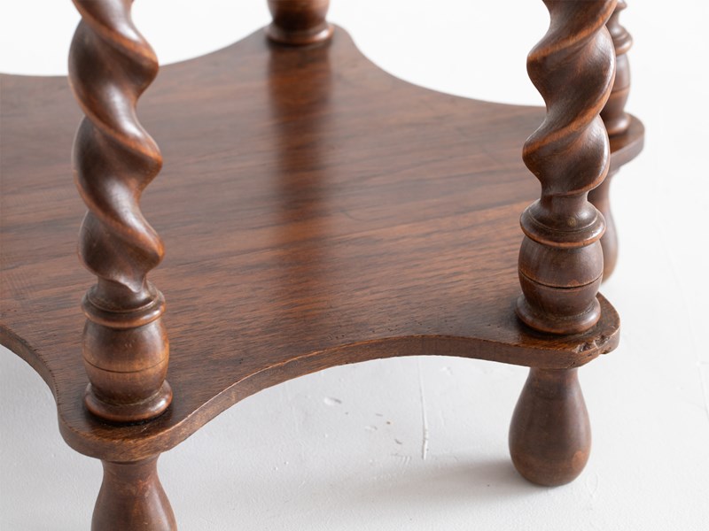 A tiered oak side table raised on six barley twist supports. French, c. 1950s.