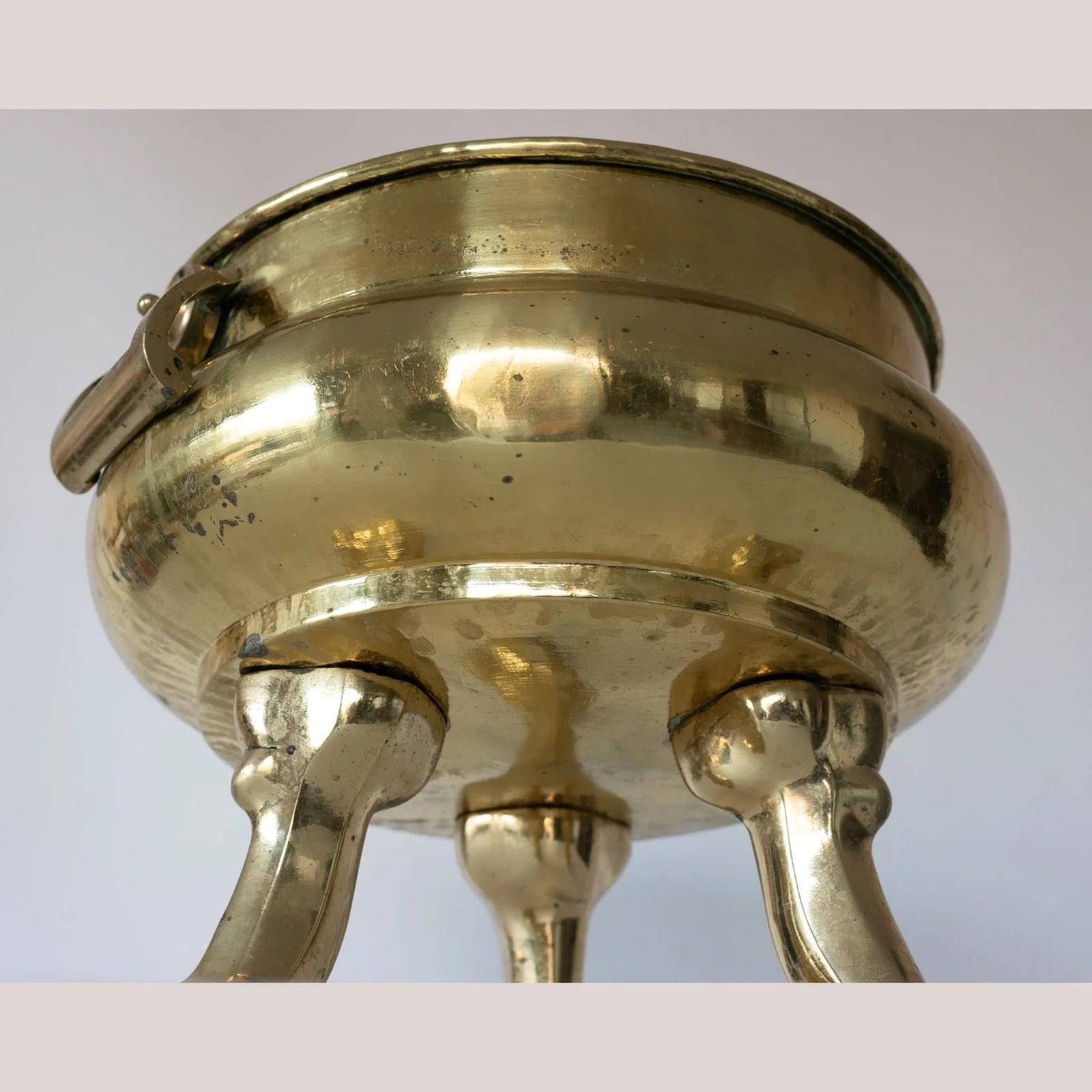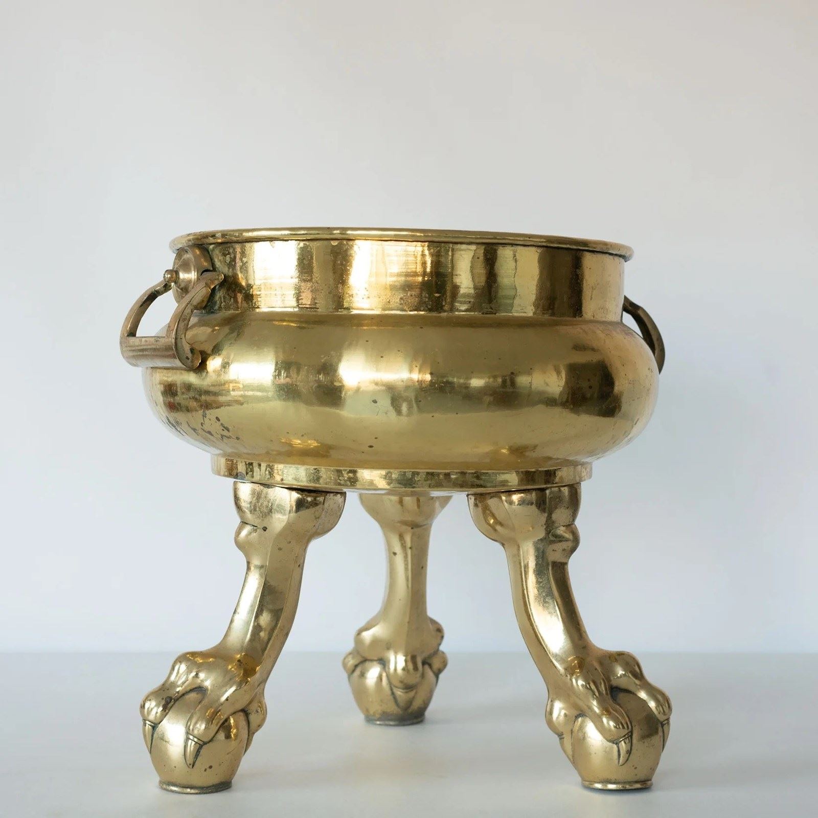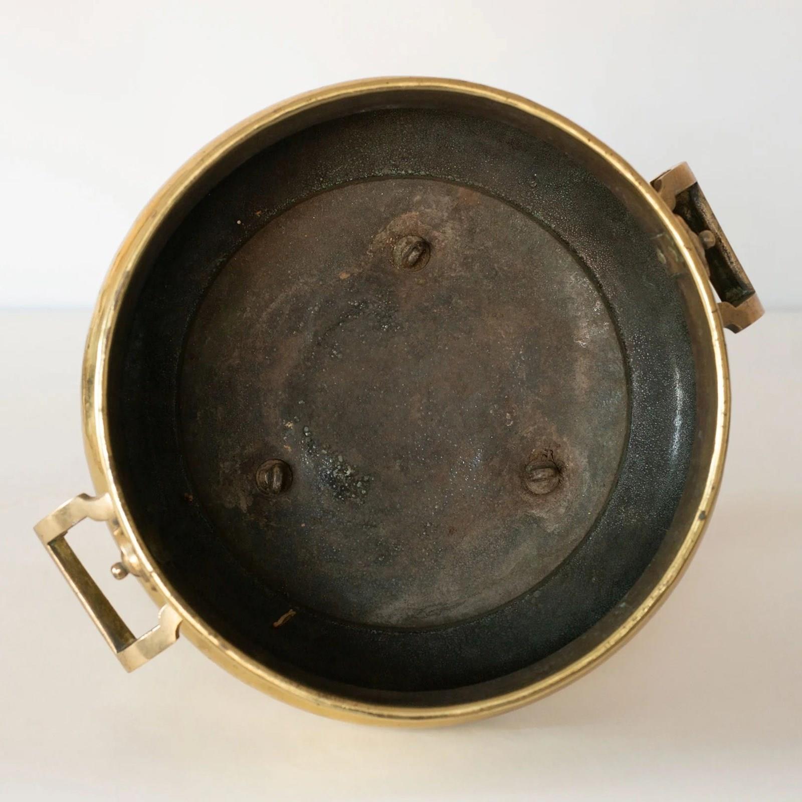 This 19th century brass log bin is a solidly made domestic object, crafted in brass and raised on three cast claw-and-ball feet. The rounded body is balanced by twin swing handles mounted on circular bosses, combining practicality with restrained ornament. A gently flared rim defines the upper edge, while the surface retains an even aged patina with visible wear and oxidation consistent with long use. Subtle hammer marks and casting details reflect traditional 19th century metalworking techniques.