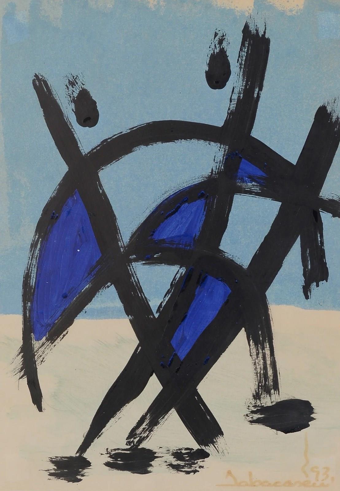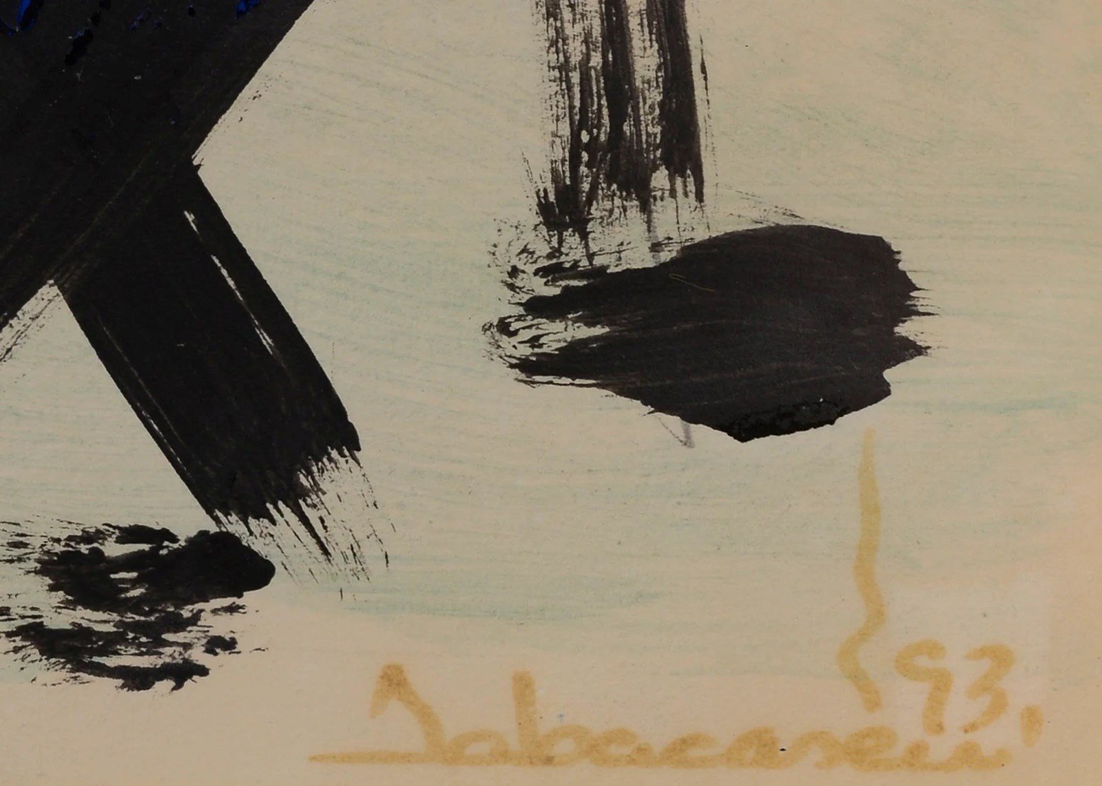 This expressive mixed-media work on paper by an unidentified artist presents a dynamic abstract figurative composition executed with confident, gestural brushwork. Bold black strokes define a loosely human form in motion, intersecting with saturated areas of deep cobalt blue that introduce rhythm and visual tension. The background is structured in soft horizontal bands of pale blue and warm cream, creating a sense of spatial grounding while allowing the central figure to remain dominant. The paint application is energetic and direct, with visible brush marks and intentional drips that reinforce the immediacy of the artist’s hand. Dated 1983, the work reflects the language of late 20th-century European abstraction, where figuration is reduced to essential movement and form. The composition balances spontaneity with control, resulting in a striking, modern presence well suited to contemporary and minimalist interiors.