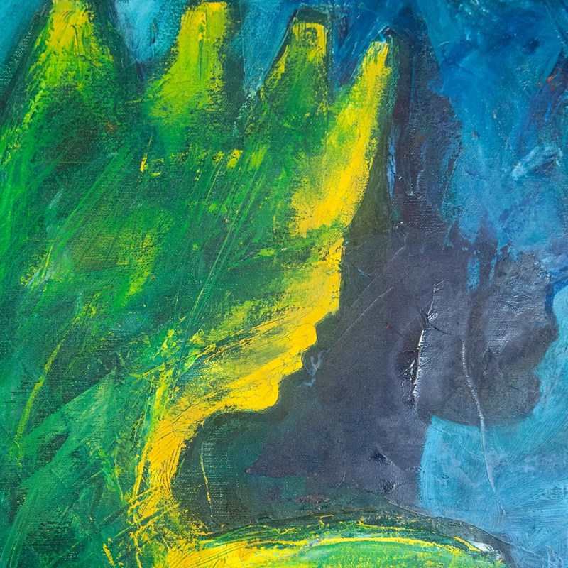 Although the painter is not yet identified, the signature and style suggest an artist working within the late 20th-century European tradition of spontaneous abstraction. The energetic brushwork, chromatic intensity, and anthropomorphic forms strongly recall the intuitive, experimental vocabulary associated with the Cobra movement and its later followers.