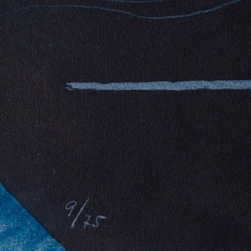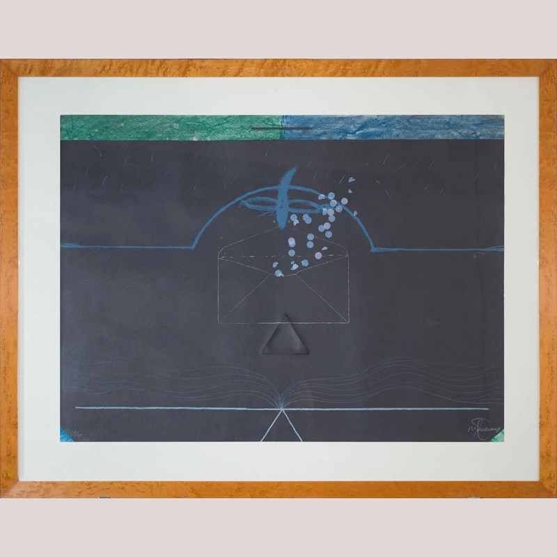 This pair of vintage abstract lithographs consists of two signed limited edition prints executed through layered lithographic processes. Both works combine flat colour fields with linear drafting, overprinting, and controlled gestural marks. One composition is organized around a dominant red plane intersected by circular forms, angular elements, and textured passages in blue, green, black, and yellow. The second lithograph employs a darker tonal ground, structured through fine linear diagrams, curved arcs, and simplified geometric symbols rendered in muted blues and greys. Variations in line weight, transparency, and surface texture indicate multiple printing stages and deliberate registration. The consistent scale, framing, and visual language support their presentation as a coordinated pair.